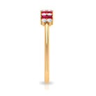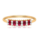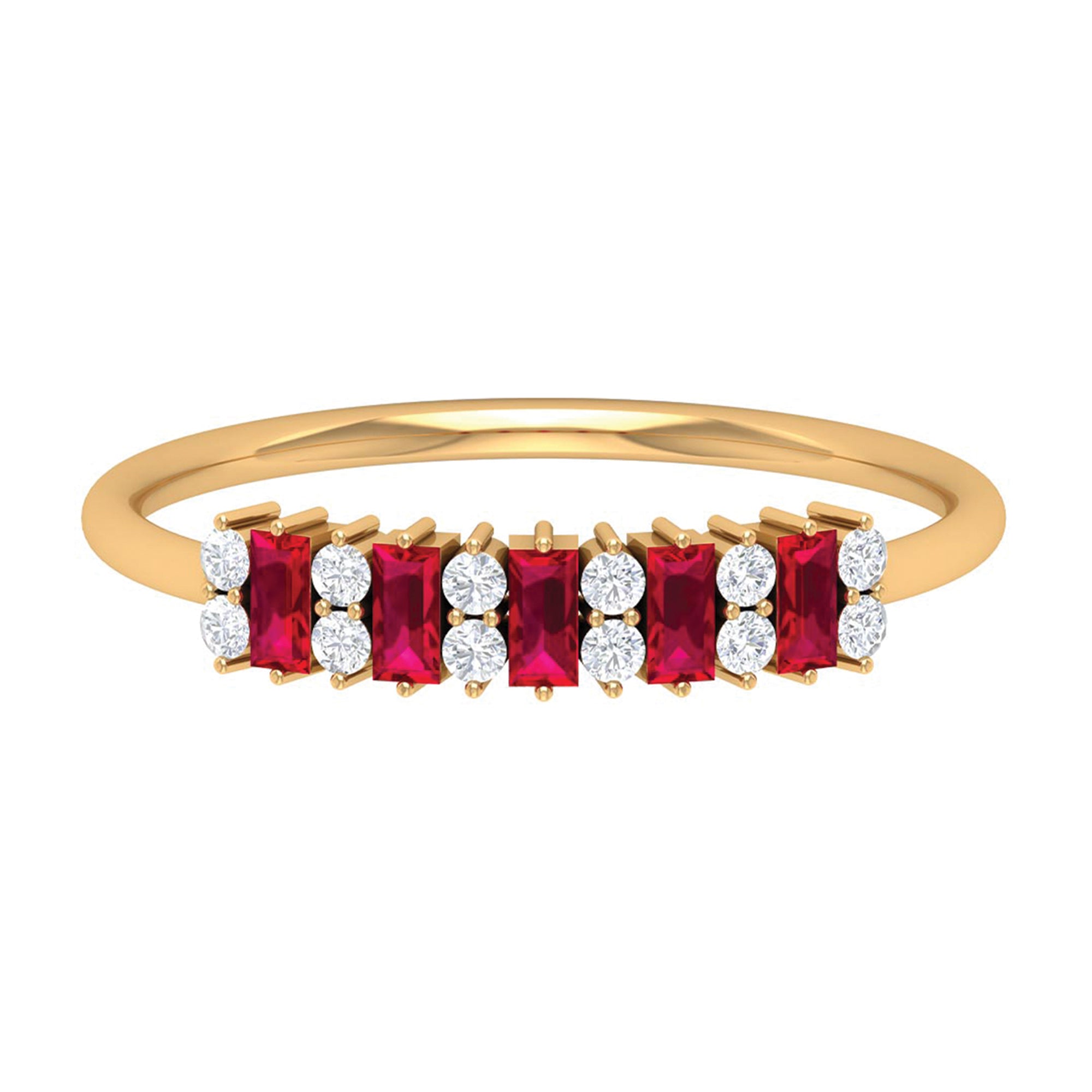 This minimal cluster ring features stunning baguette shape created rubies and sparkling Diamond gemstones in a prong setting in an alternate pattern. The minimalist design of the promise ring emphasizes the beauty of the gemstones.