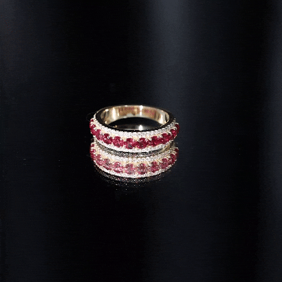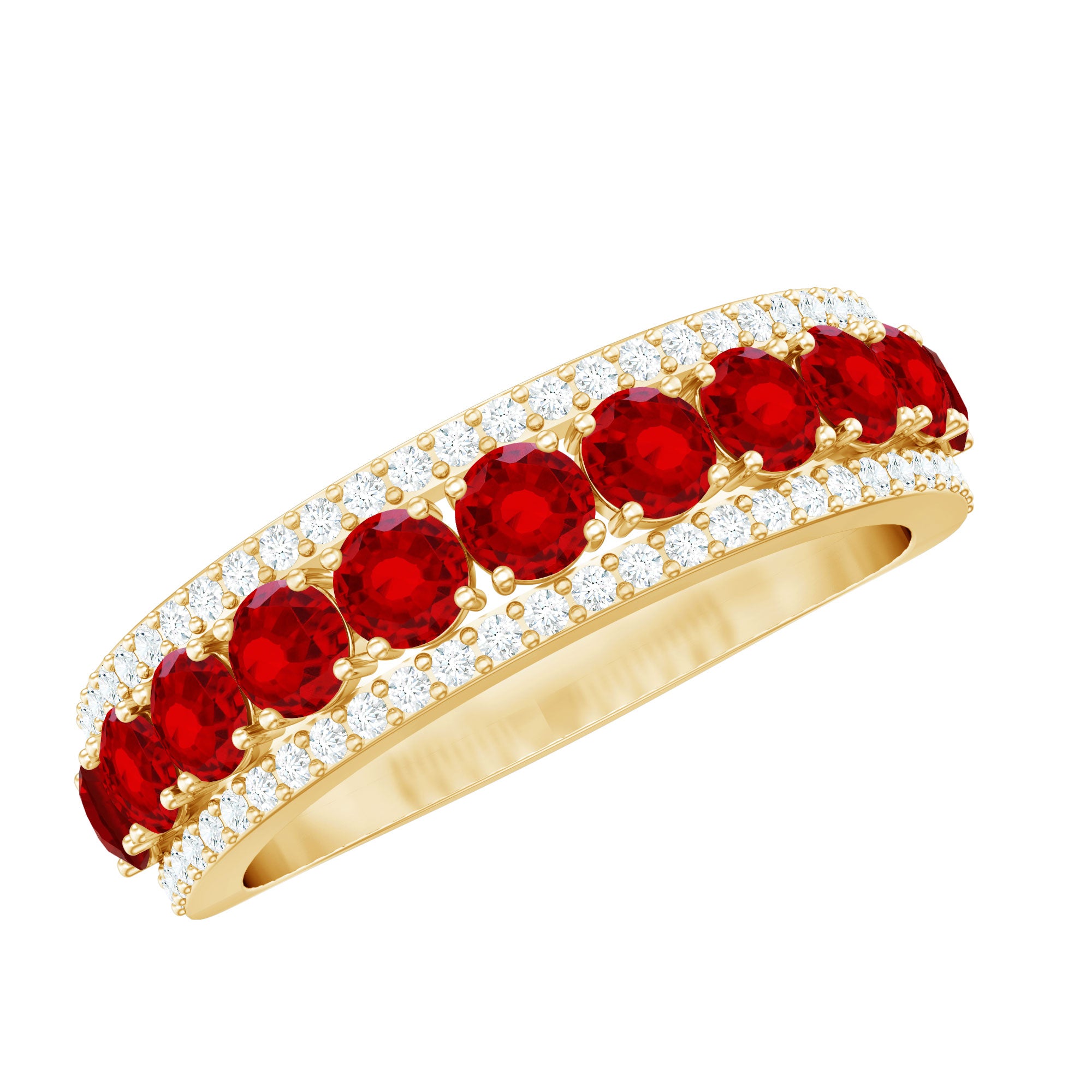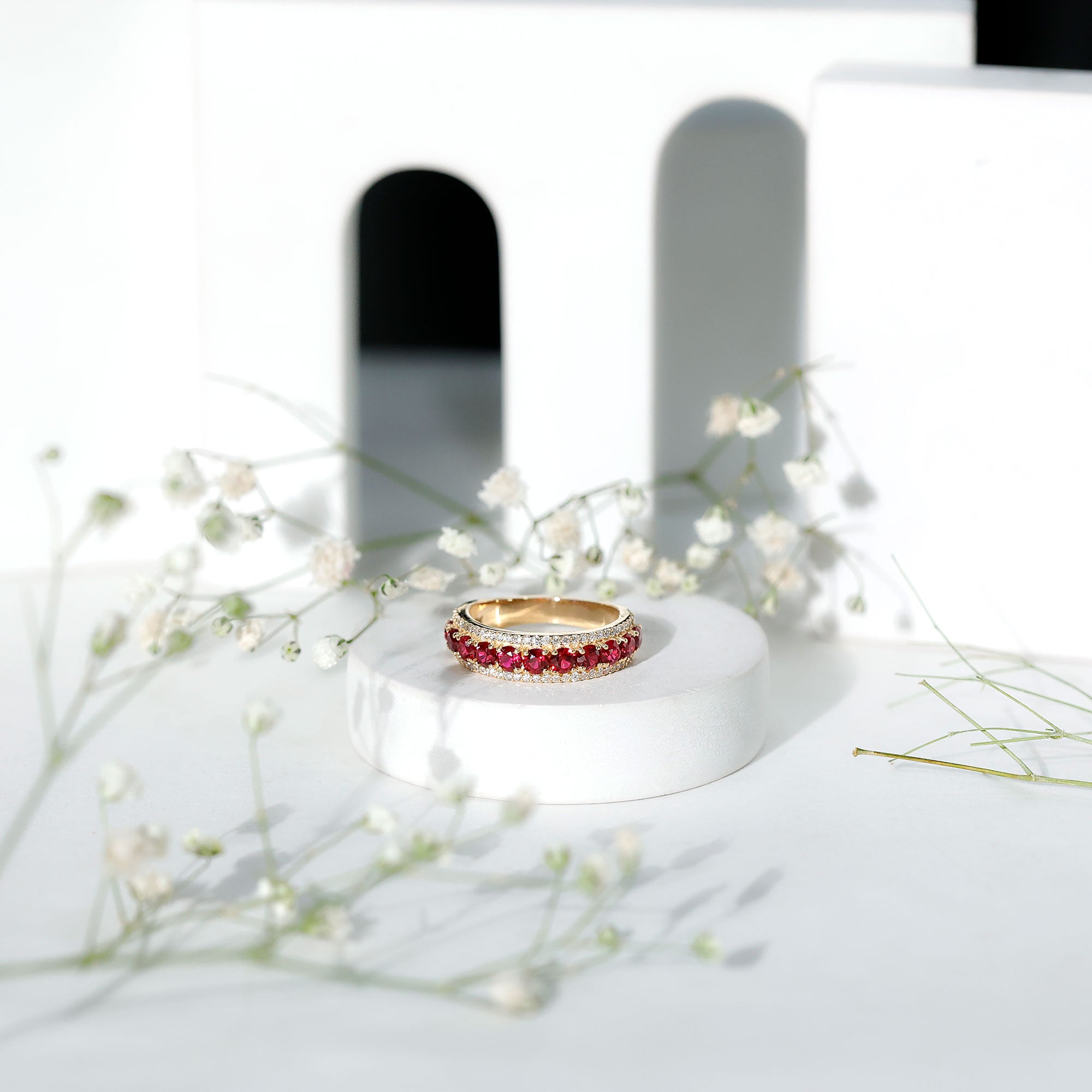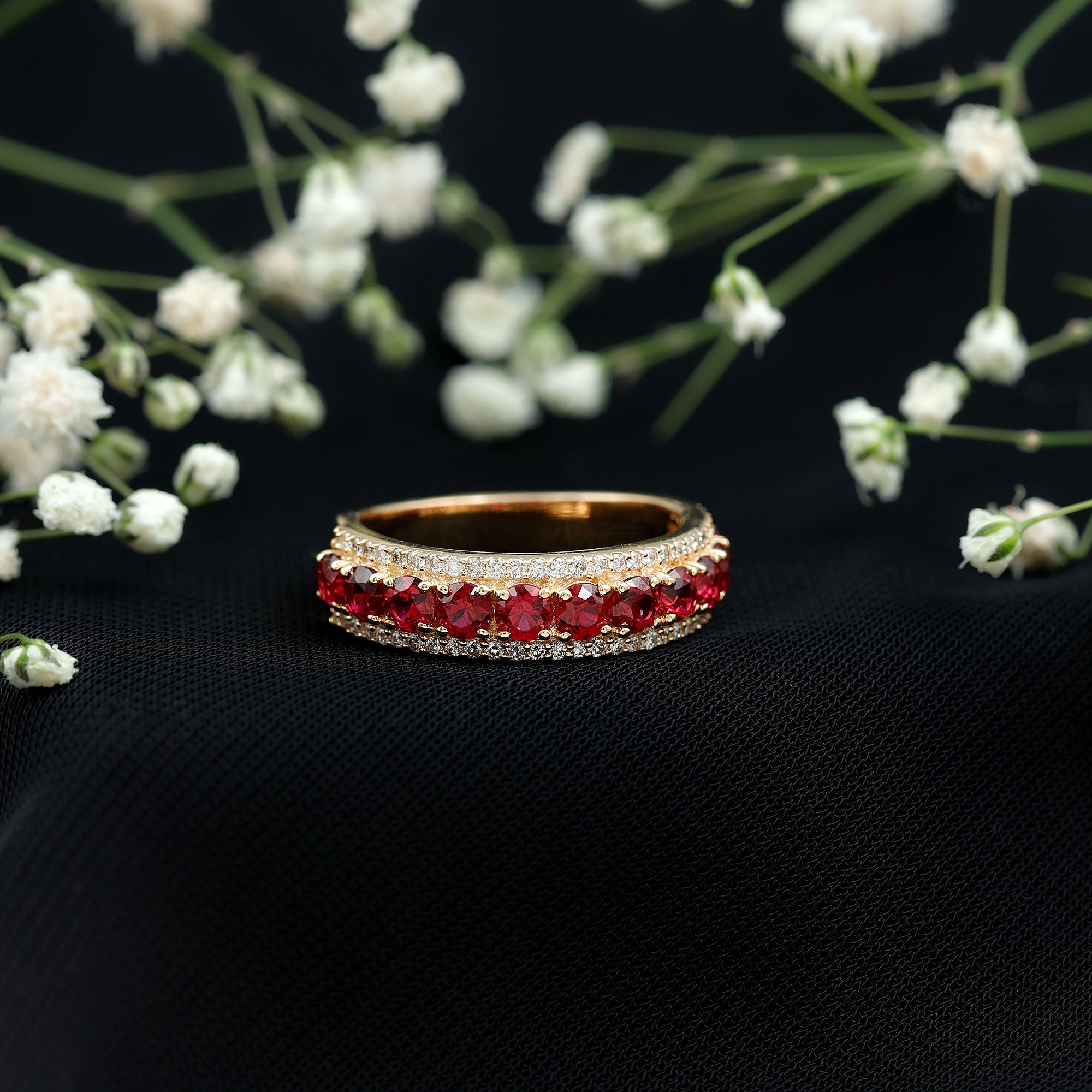 Elegantly designed, this Statement Ring crafted with Solid Gold makes for a beautiful gift for your beloved on the special occasion of your lives. Round Shape Created Ruby and Diamond adorn this Anniversary Ring to offer it a magnificent look.