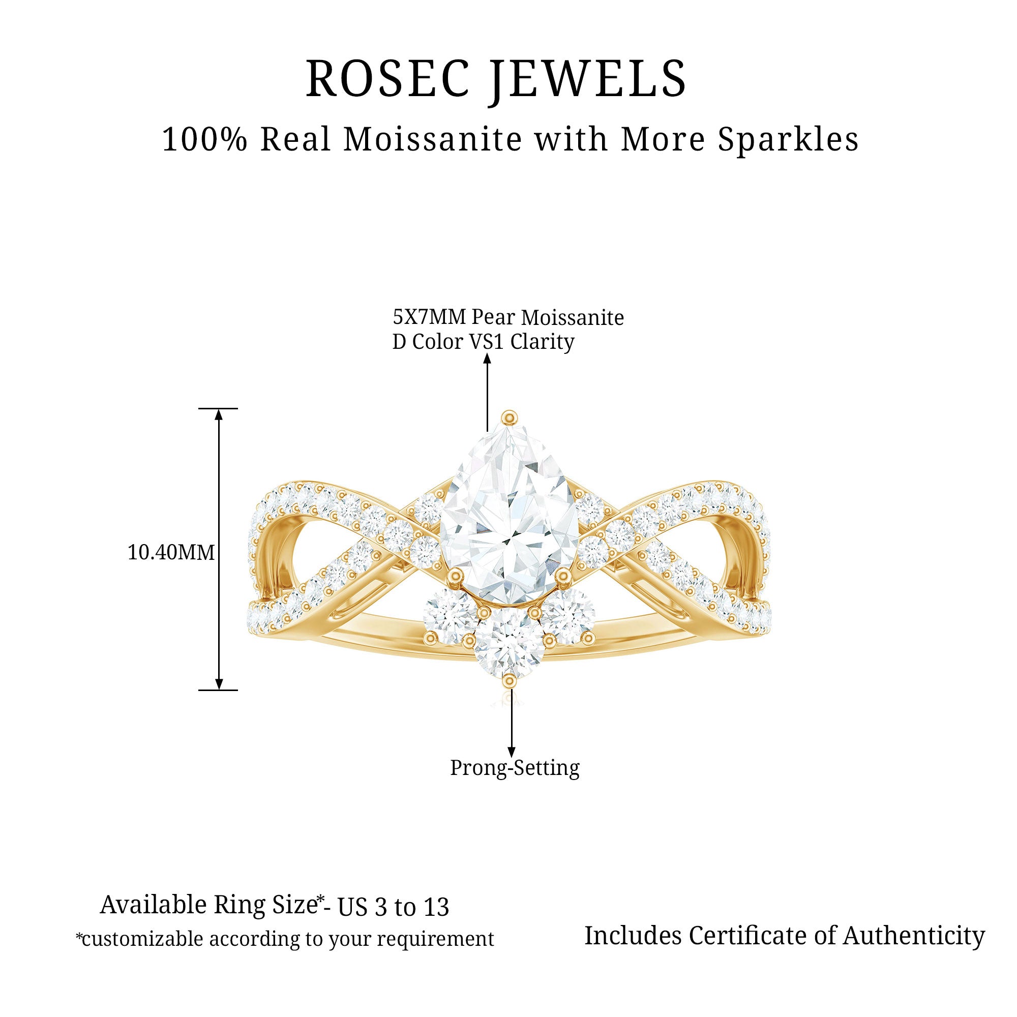 Make your YES moment truly unforgettable with this beautifully crafted Moissanite Engagement Ring, designed to capture the essence of modern love with a timeless twist. At the center shines a brilliant 5X7 MM pear shaped moissanite, securely held in 3 prong setting. With its signature teardrop shape and eye-catching sparkle, the center stone radiates elegance from every angle. The design takes a unique turn with a crossover band, gracefully curving around the finger, like two lives weaving into one. Adorned with petite round moissanites, the band adds just the right amount of shimmer without stealing attention from the striking centerpiece. This Crossover Engagement Ring is both symbolic and stylish, perfect for someone who values meaning as much as beauty. Whether you are proposing, celebrating an anniversary, or marking a meaningful milestone, this Teardrop Engagement Ring tells your love story with heart and sparkle. Handcrafted with care and set in your preferred metal from available options, it blends sophistication with sustainability, thanks to the ethically sourced moissanite. Available in US sizes 3 to 13, and delivered in an elegant jewelry box, this Pear Engagement Ring is a moment, a memory, a promise. If youre looking for a ring that speaks of love, modern style, and a touch of individuality, this one checks every box.