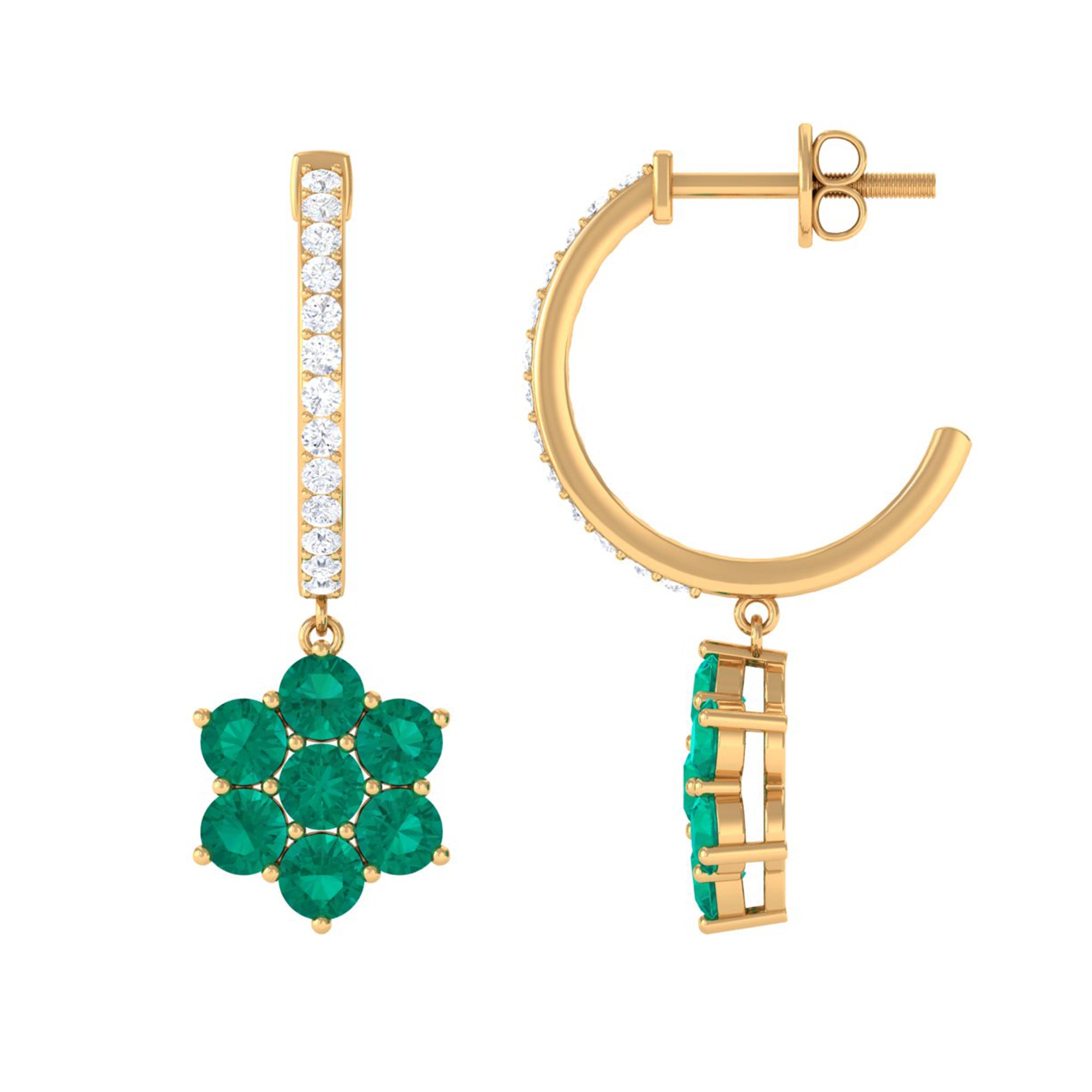 Get lots of compliments with these Flower Drop Earrings, a refreshing blend of vibrant color and timeless sparkle. Designed to captivate, each earring features 3 mm Round Shape Emerald stones arranged in a charming flower pattern that instantly adds a touch of romance and elegance. The flower gently dangles from a sleek Half Hoop, beautifully lined with dainty Diamond stones that shimmer with every move. Secured with Screw Back Closure, these Emerald Diamond Earrings offer comfort and style all in one. Whether you are dressing up for a dinner date, stepping out for a special celebration or simply adding a pop of green to your everyday outfits, these Emerald Drop Earrings make the perfect accessory. Packaged in a signature jewelry box, these Hoop Drop Earrings are also an ideal gift for birthdays, anniversaries or anyone who adores fine jewelry with a natural touch.