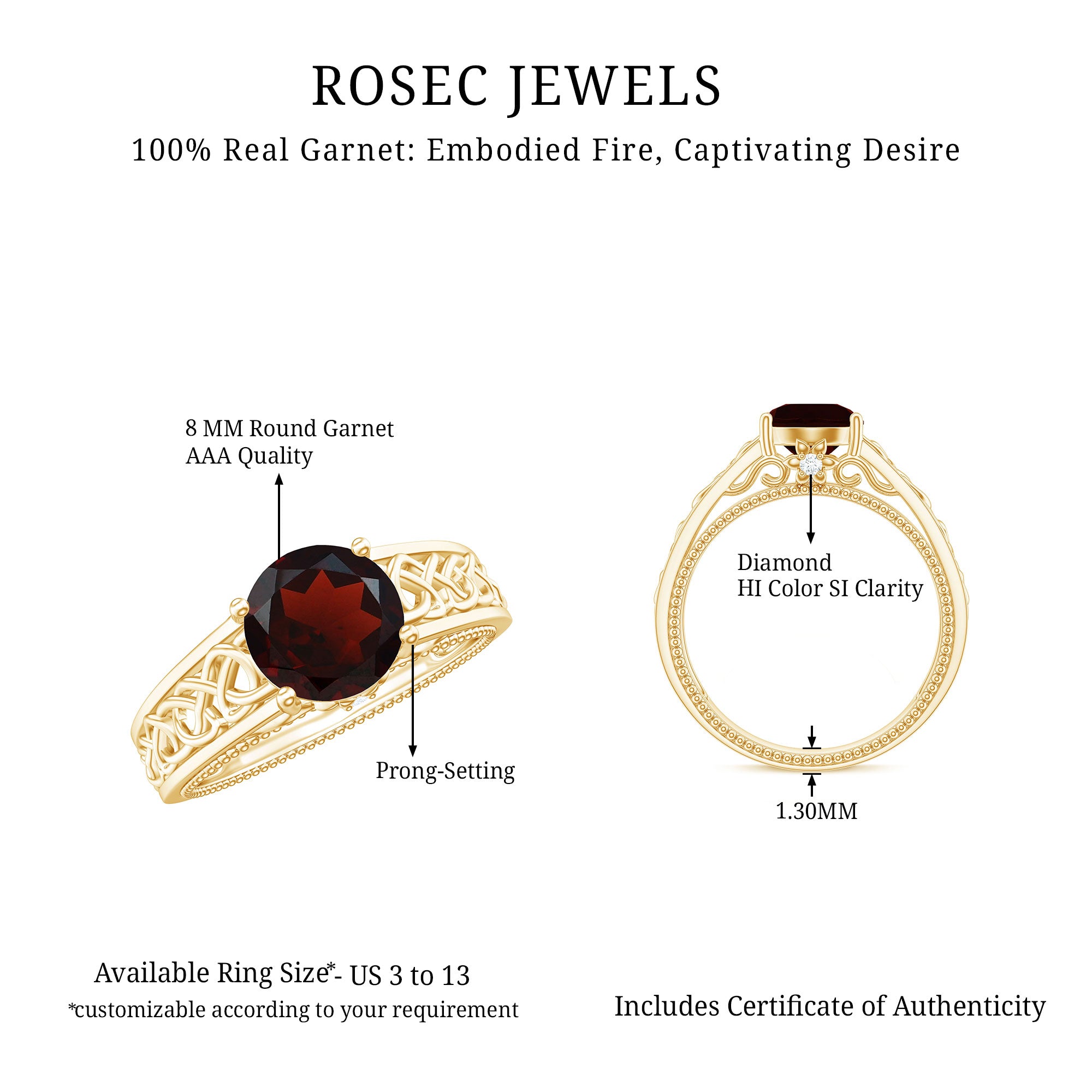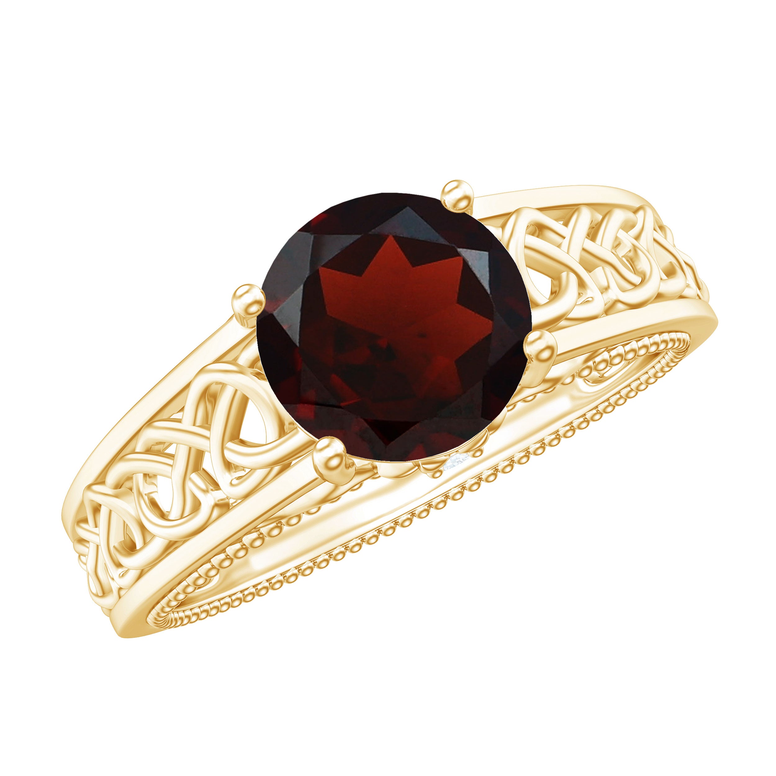 Complement your outfit for the special occasion with this gorgeous Solitaire Band adorned with Round Shape Garnet with Round Shape Diamond. This Solitaire Band Ring is crafted with Solid Gold with Celtic Details for a charming appeal.