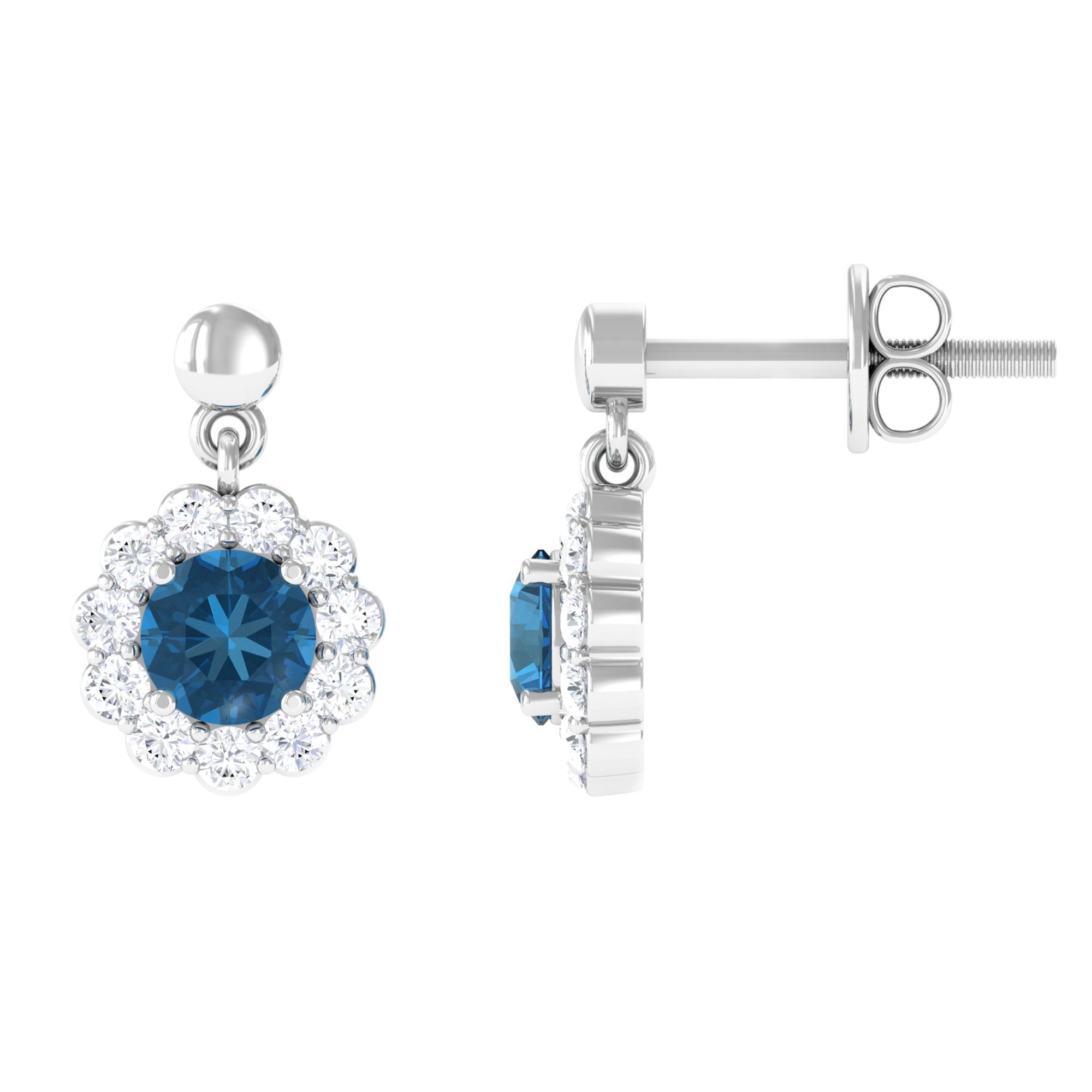 1.75 CT Real London Blue Topaz and Diamond Flower Halo Drop Earrings