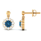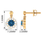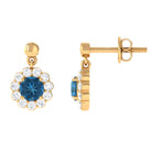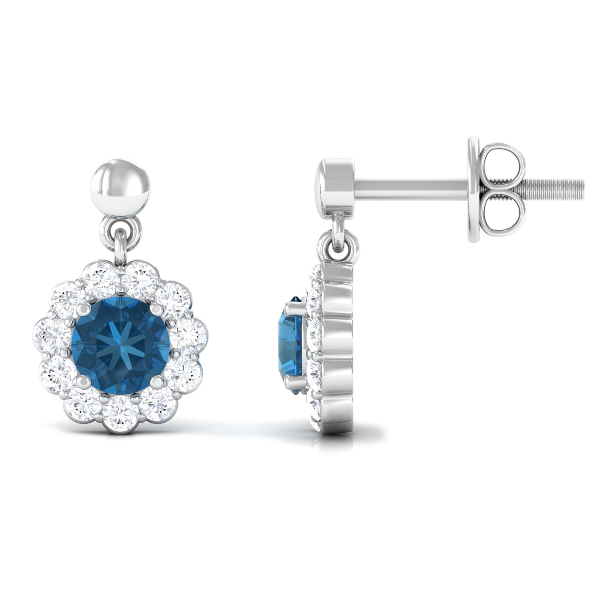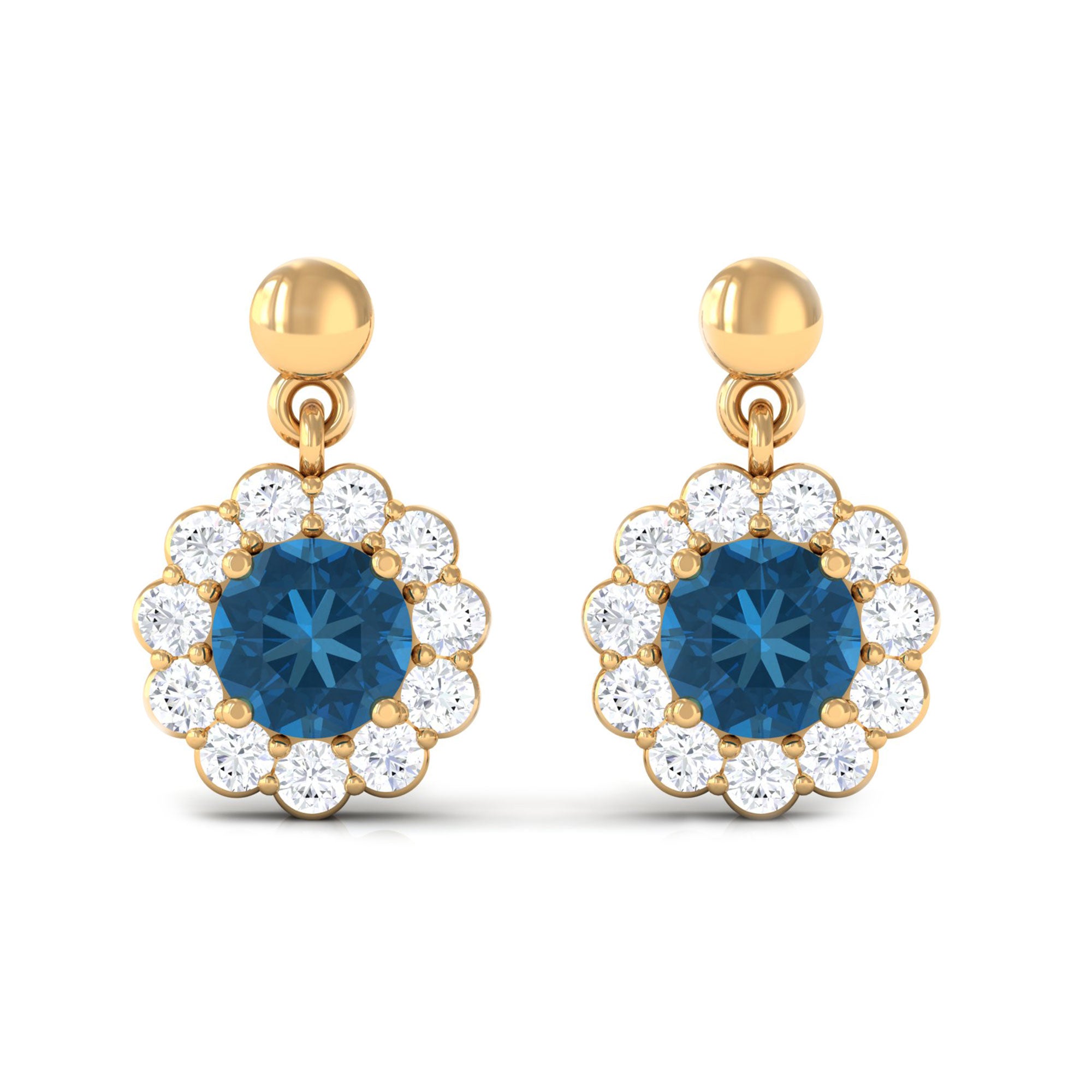 Complete your outfit with this elegantly designed London Blue Topaz Earrings. This Flower Drop Earrings is crafted with Gold and adorned with Round Shape London Blue Topaz with Diamond to make for a lovely choice for different occasions. These Halo Earrings and your love make her eyes glitter.
