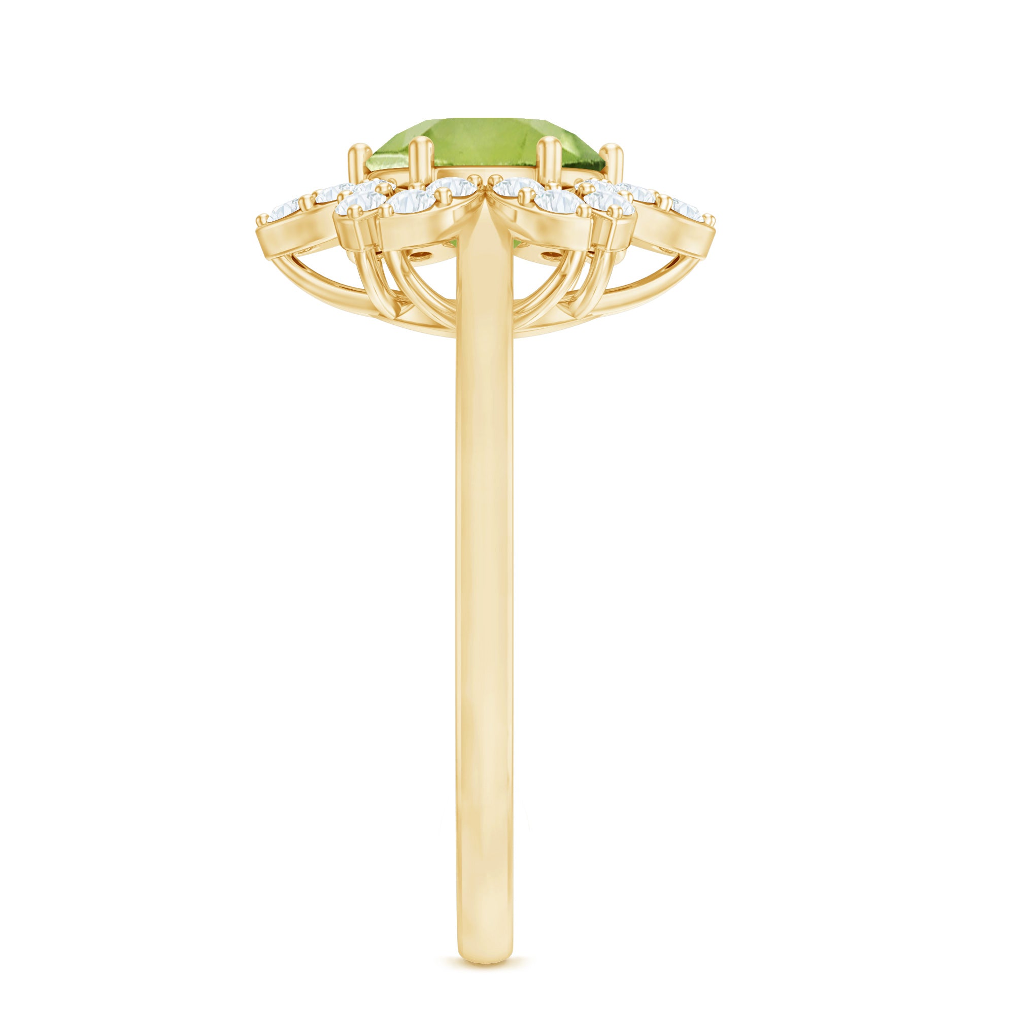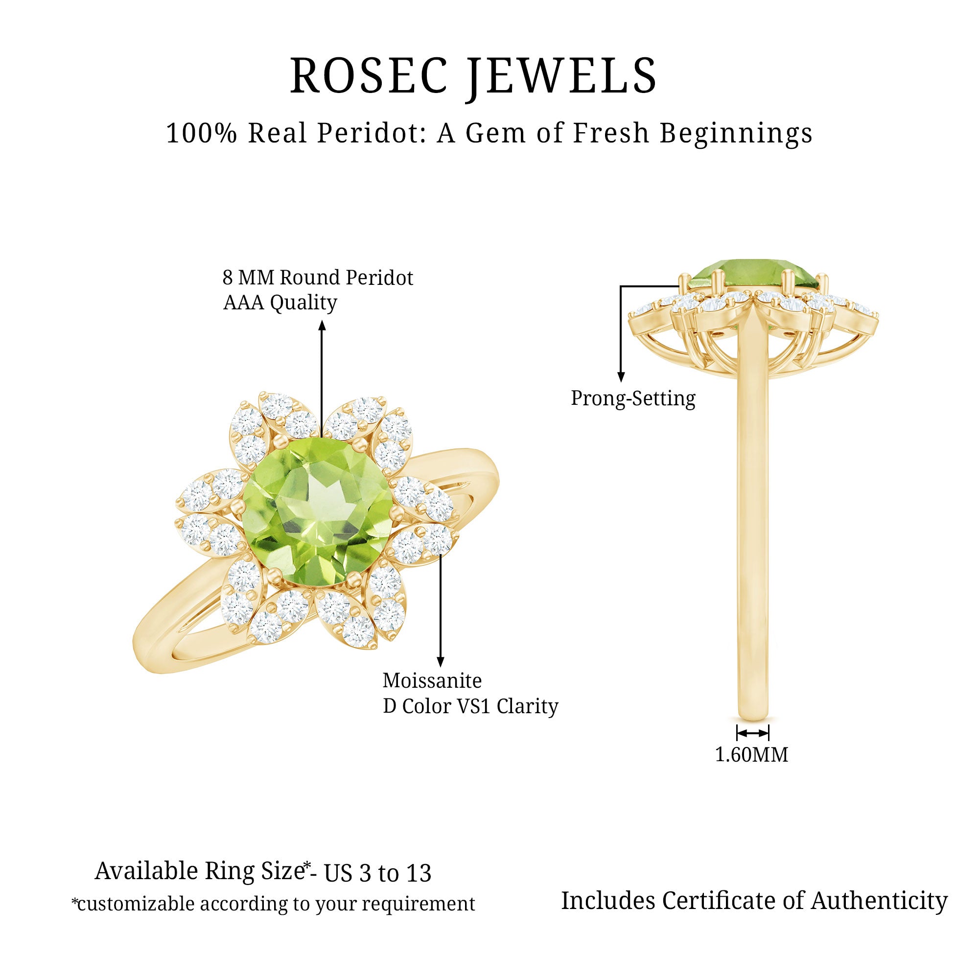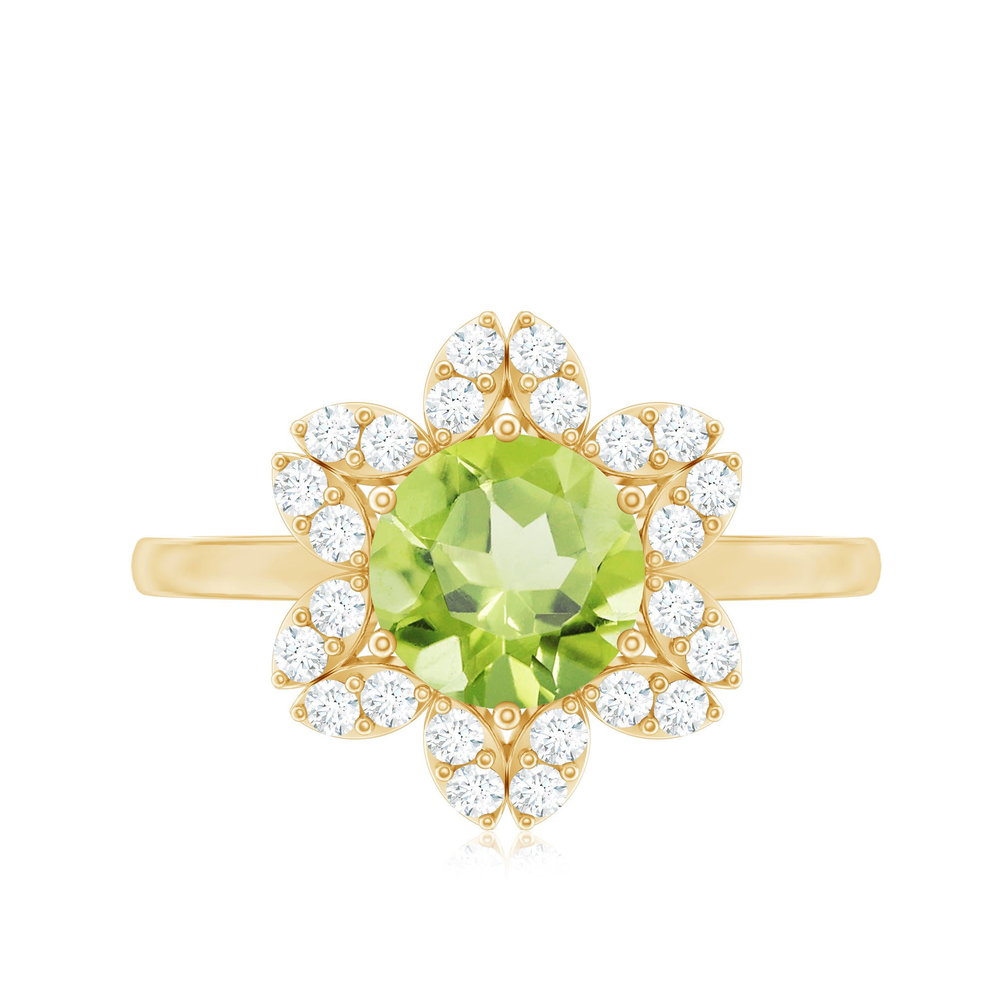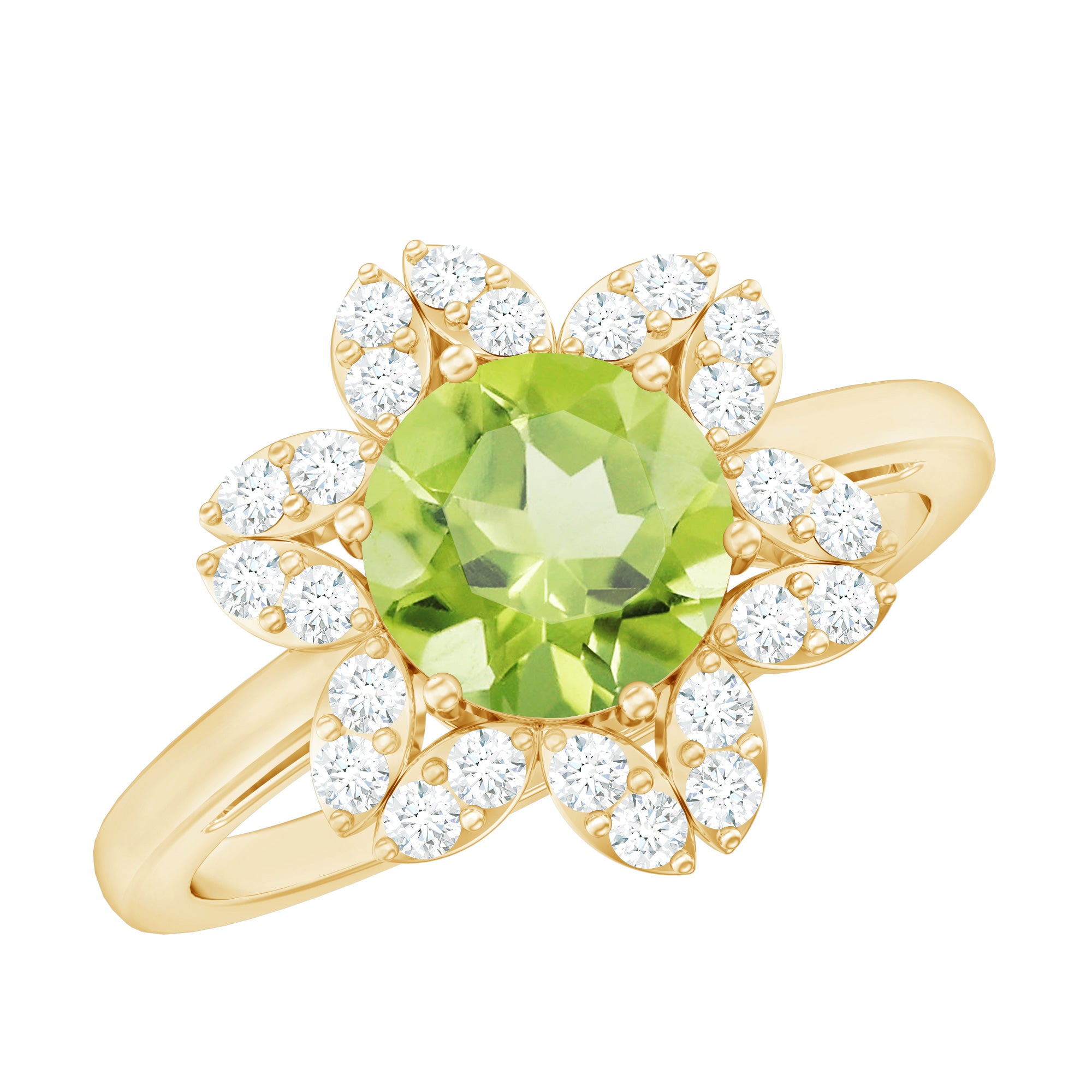 Bloom like a flower with our adorable Flower Ring embellished with Round Cut Peridot in 6 Prong Setting with Moissanite Halo, this Peridot Stone Ring will give you a stand out look from others. This Peridot Green Ring is crafted with Gold for a timelessly luxurious look. Surprise your love with this elegant Peridot Ring and make her heart flutter.