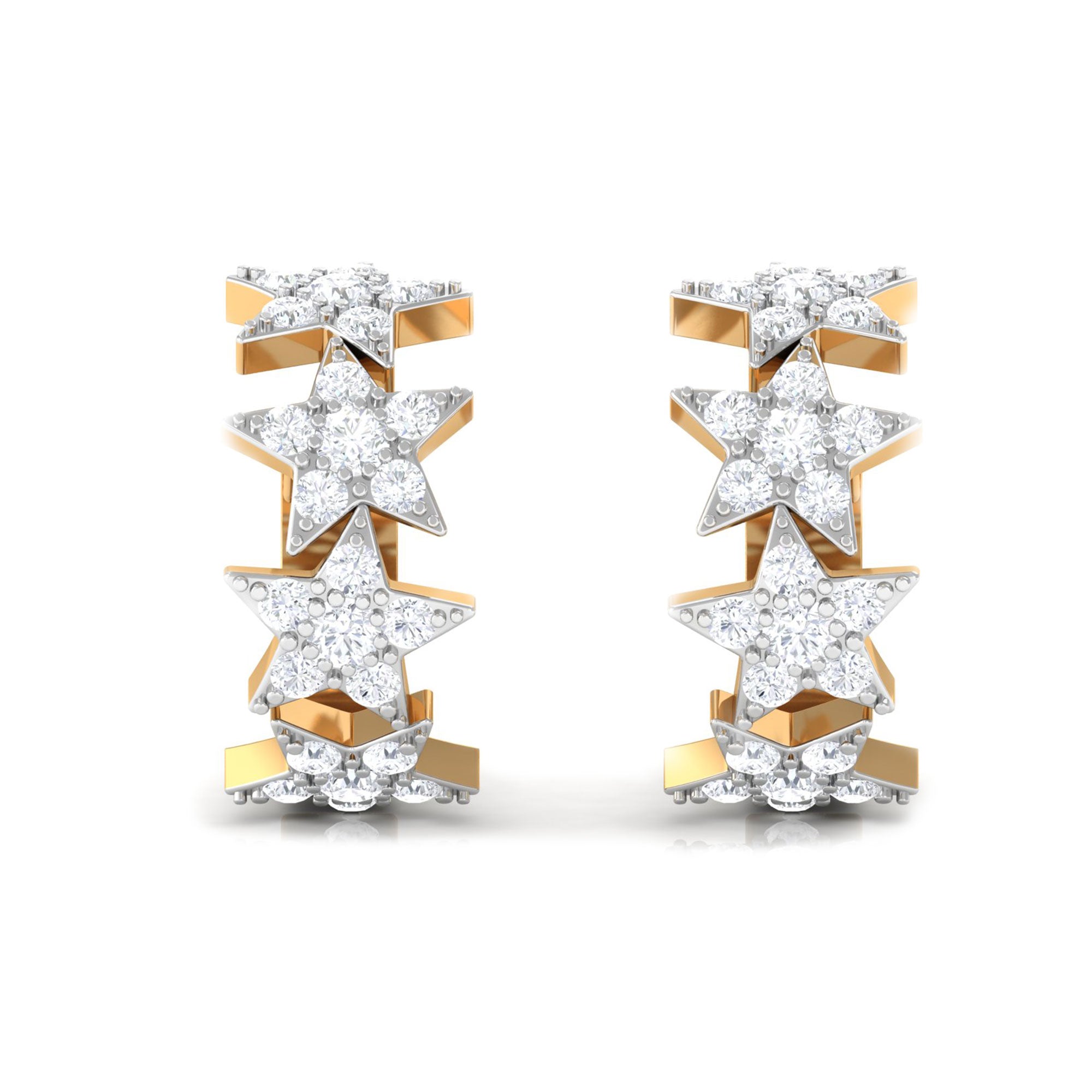 Add a touch of magic to your style with these Star Hoop Earrings. The Gold Hoops feature enchanting stars adorned with scintillating Round Cut Moissanite in a prong setting, secured comfortably with a hinged back. Elevate your casual and party look by wearing these unique Huggie Hoop Earrings. Surprise your beloved on her birthday with these stunning Star Earrings as a gift, and let her sparkle and shine wherever she goes.