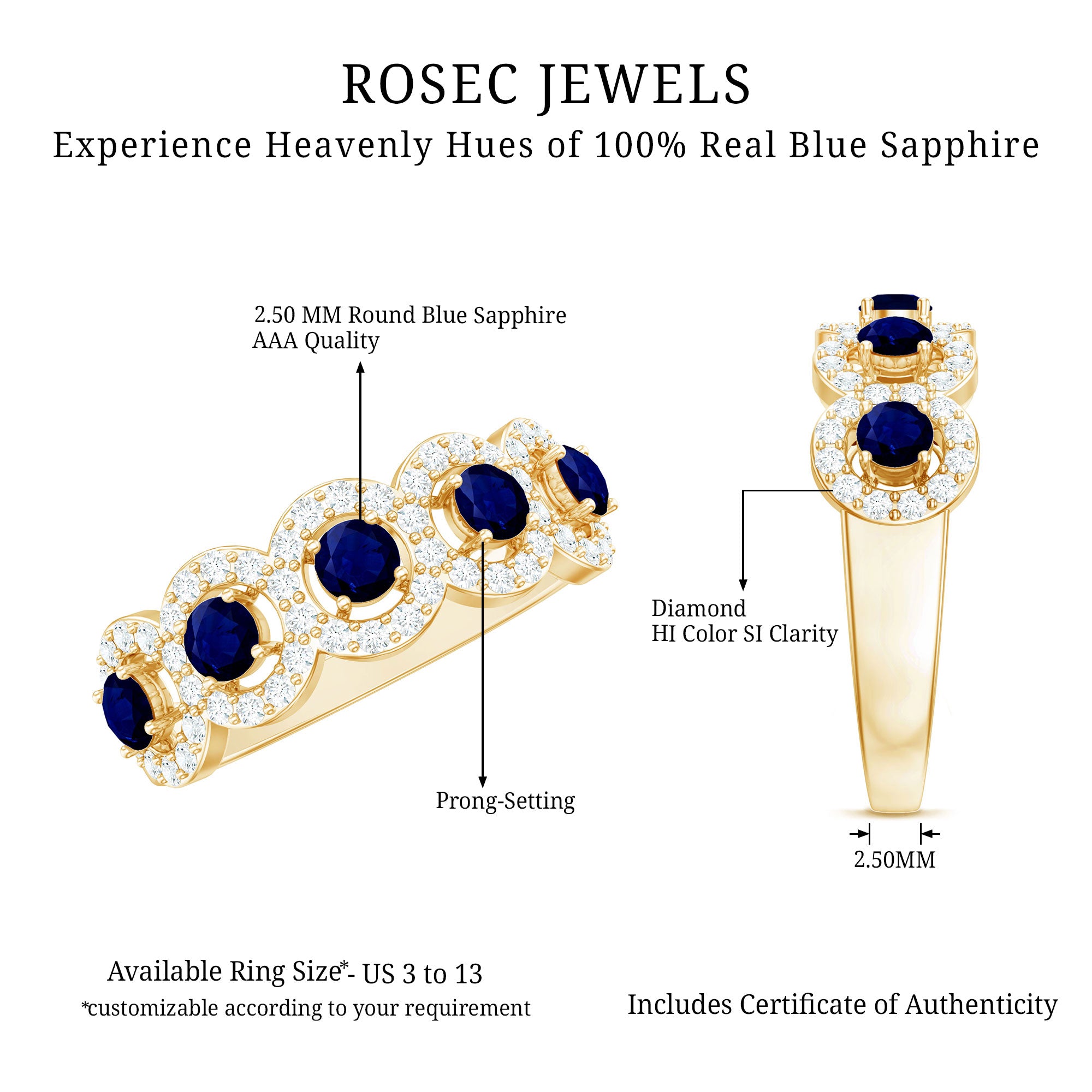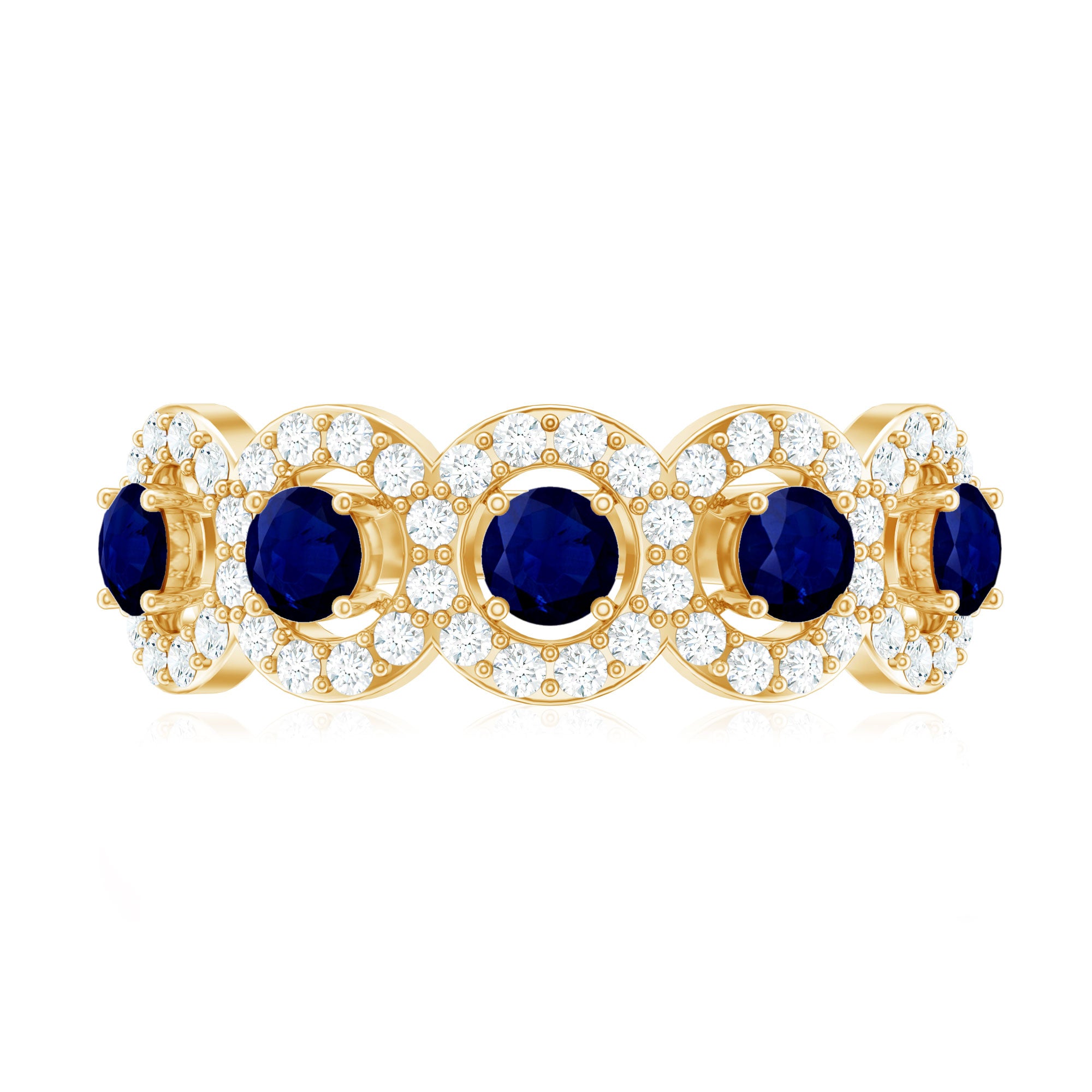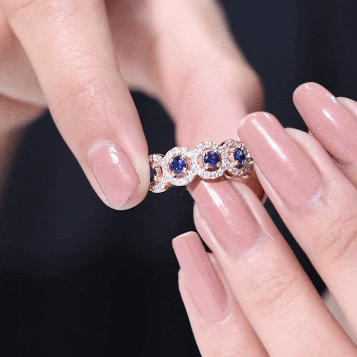 Mark the special day of your life with this Classic Band Ring. This Blue Sapphire Band Ring for Women is adorned with Round Shape Blue Sapphire in Prong Setting with Diamond Halo to make for a stunning choice for your beloved. Crafted with Solid Gold to give it a luxurious appeal.