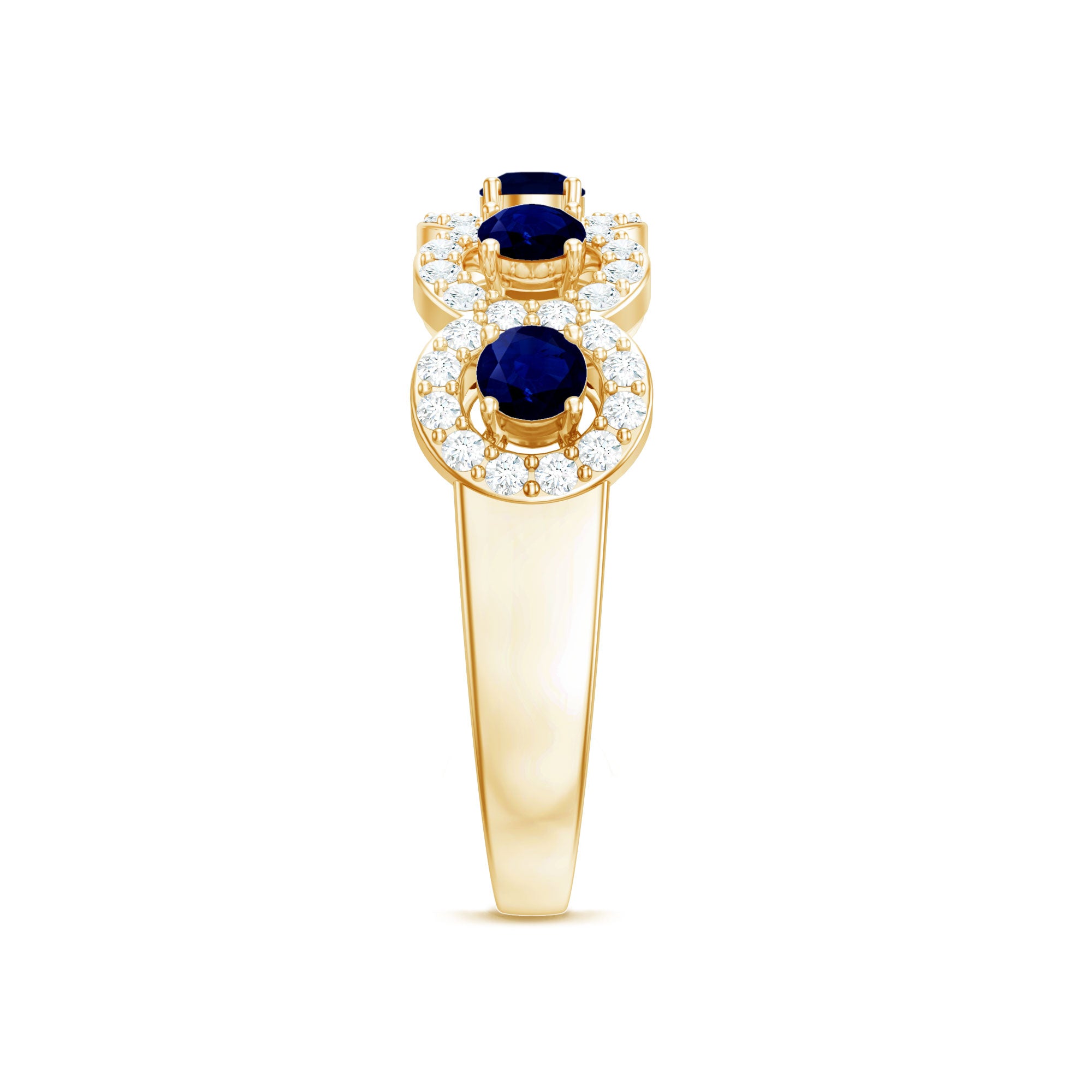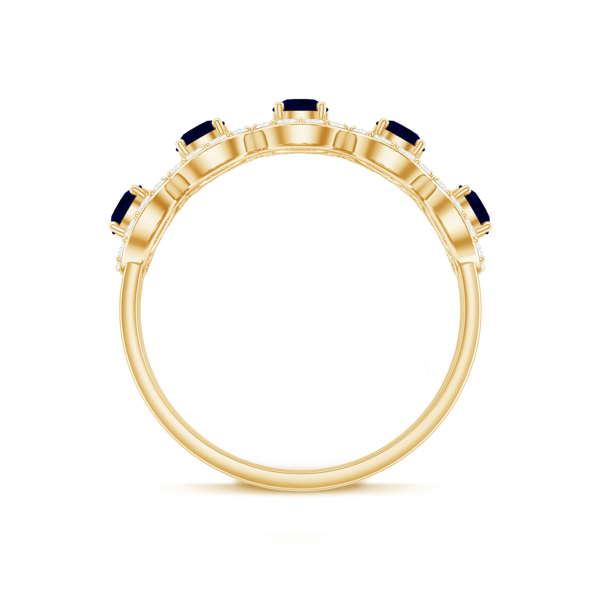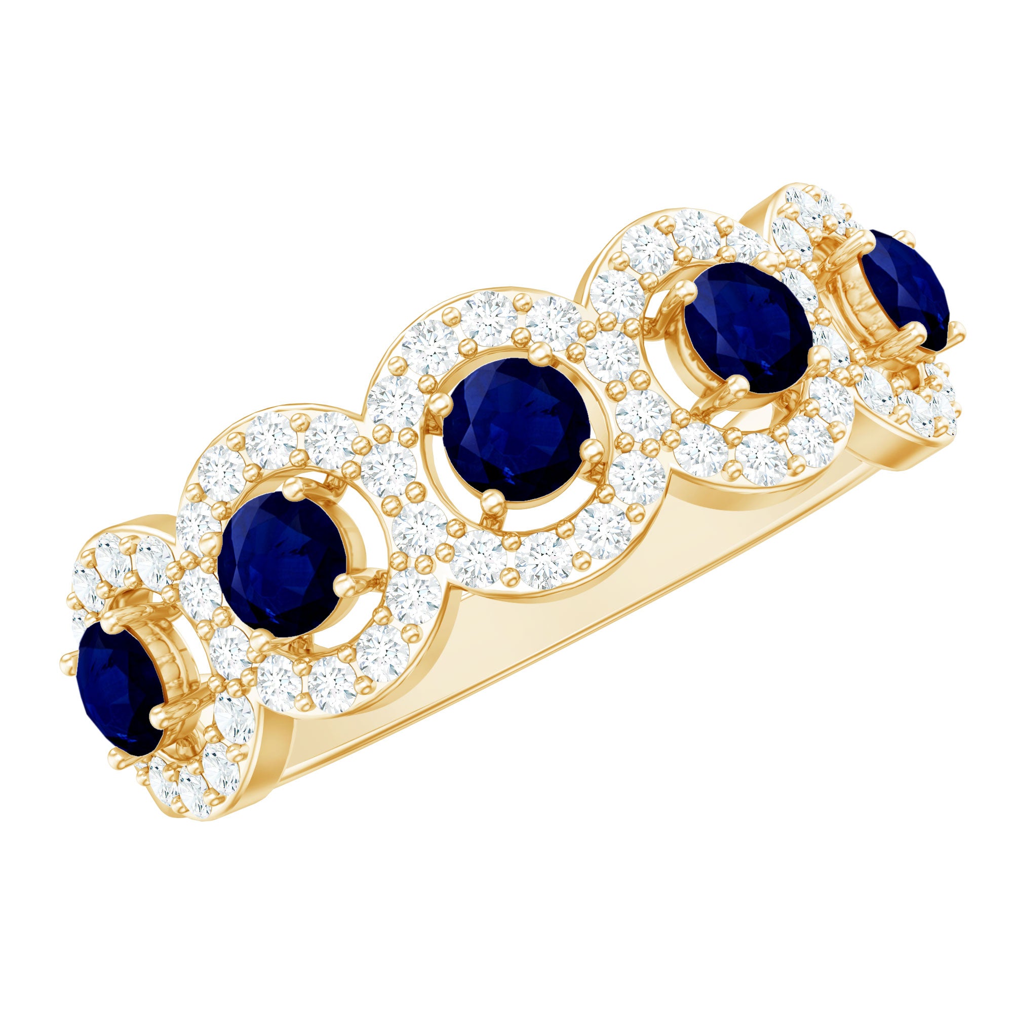 Mark the special day of your life with this Classic Band Ring. This Blue Sapphire Band Ring for Women is adorned with Round Shape Blue Sapphire in Prong Setting with Diamond Halo to make for a stunning choice for your beloved. Crafted with Solid Gold to give it a luxurious appeal.
