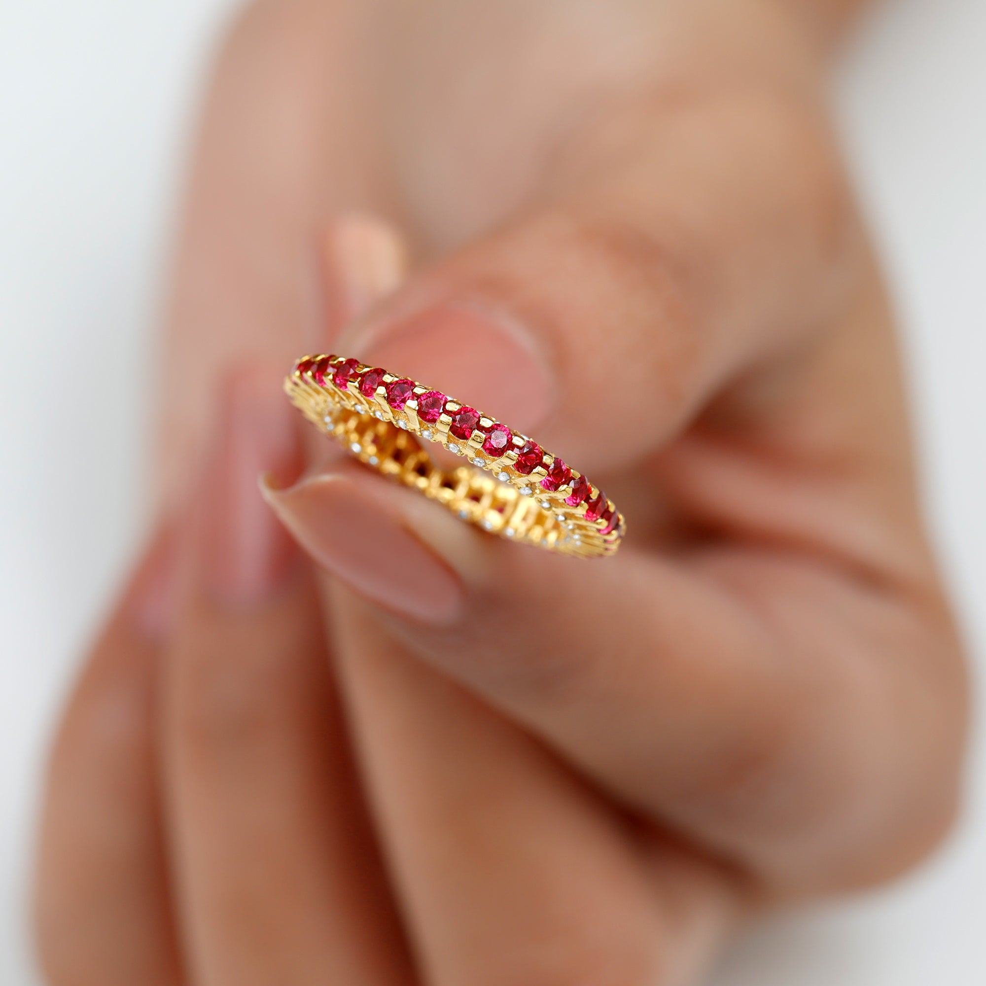 Enhance your beauty with this utterly Classic Lab Created Ruby and Diamond Eternity Wedding Band. It is embellished with Round Shape Lab Created Ruby and sparkling Round Diamond studded beautifully on the entire Eternity Band Ring.