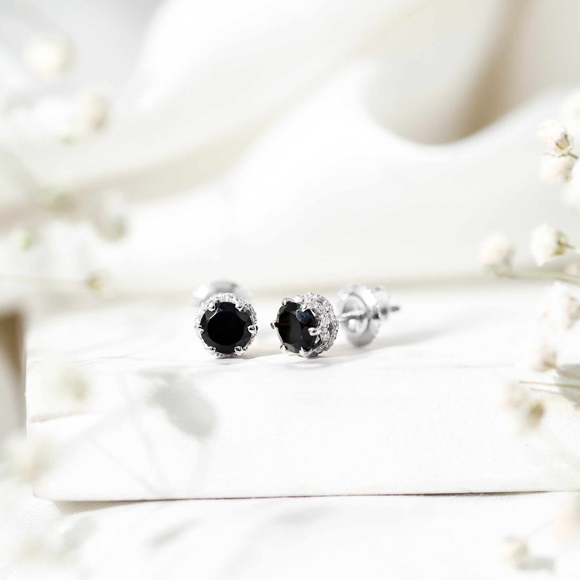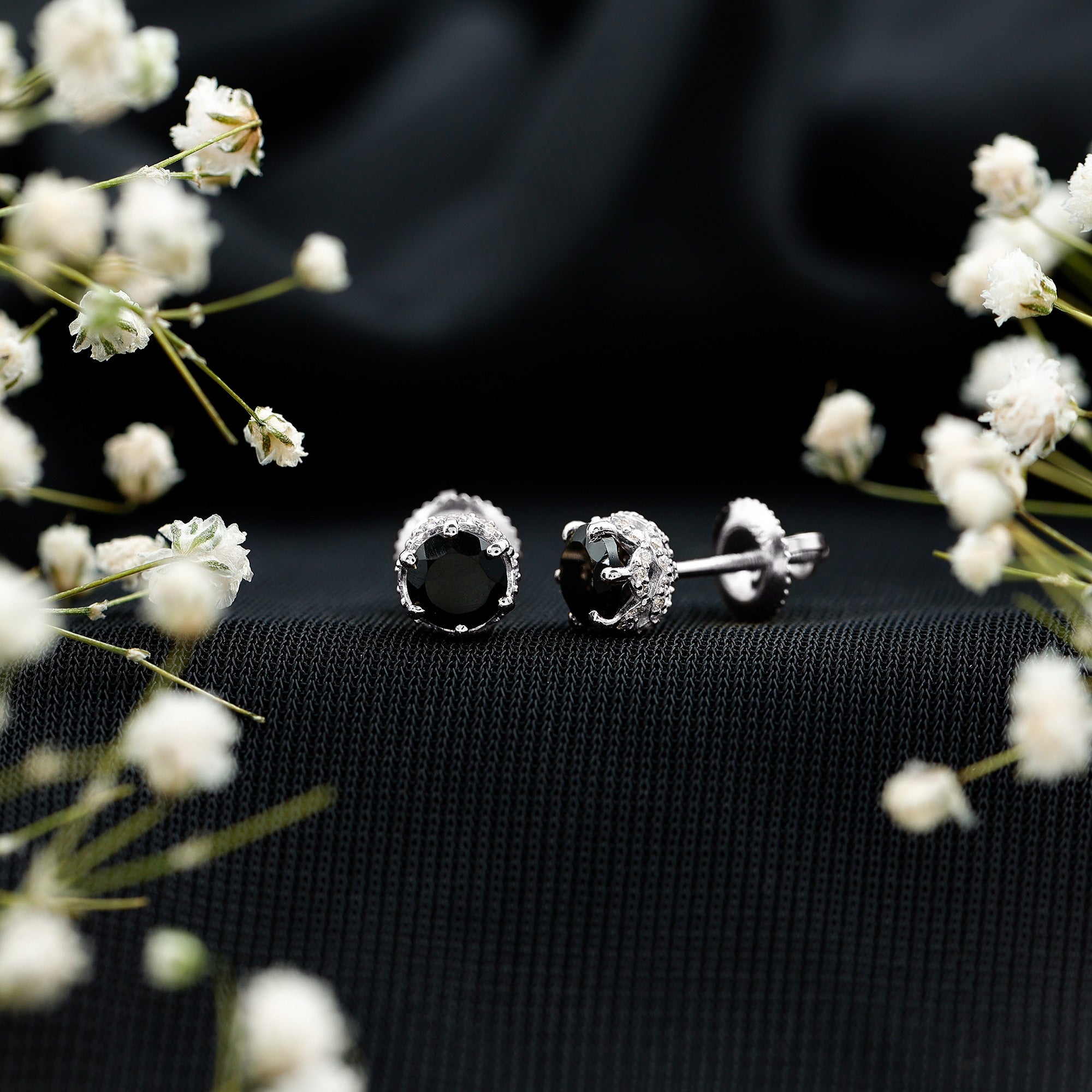 These stunning Black Spinel Earrings are designed to reflect timeless beauty and strong feelings. At the center of each earring is a vibrant 5 MM round shaped black spinel in a secure 6-claw prong setting. Set in a delicate floral-inspired design, the Black Spinel Stud Earrings are further enhanced with shimmering diamond accents. The diamonds add a soft sparkle around the center stone, highlighting the beauty of the black spinel and giving the design a romantic and graceful touch. The detailed setting adds charm and sophistication, perfect for women who love jewelry that feels special and meaningful. These Black Spinel and Diamond Earrings are a thoughtful gift for birthdays, anniversaries, Valentine’s Day, or any moment worth celebrating. They offer striking beauty and excellent quality while remaining elegant and versatile. Designed to complement any outfit, these Black Spinel Studs pair beautifully with evening dresses for a glamorous look. They can also add a bold pop of contrast to your everyday style. Whether worn day or night, they bring confidence and shine to every occasion.