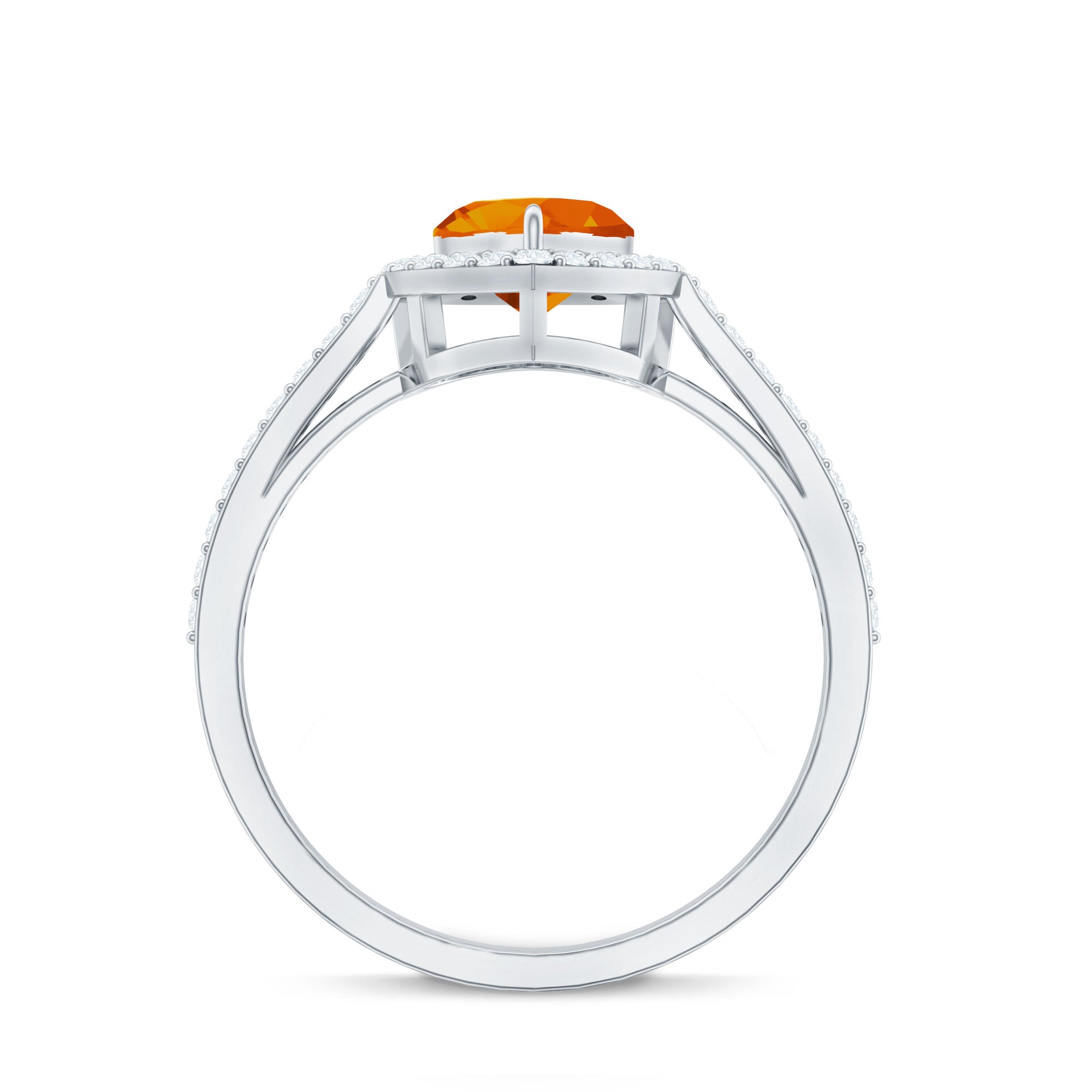 Get ready to receive plenty of compliments when you showcase this Fire Opal Engagement Ring. It features a stunning 6 MM heart shape fire opal held securely in claw setting. Surrounding the fire opal is a floating halo of round diamonds, with additional diamonds adorning the band to enhance the sparkle from every angle. The heart shape of the center stone beautifully complements the timeless design of the Halo Engagement Ring, creating a piece that is modern, elegant, and full of character. Whether worn as an engagement ring, a promise ring, or an anniversary gift, it brings a vibrant and meaningful touch to any occasion. Crafted from high-quality materials, this Heart Engagement Ring is the perfect present for her to cherish and wear for years to come. The heart shape also symbolizes deep love and connection, making it ideal for any romantic occasion. Its eye-catching style also makes it a perfect choice for cocktail parties or any time you want to make a statement. Delivered in a lovely jewelry box, the Fire Opal and Diamond Engagement Ring is ready for gifting or to elevate your personal collection.