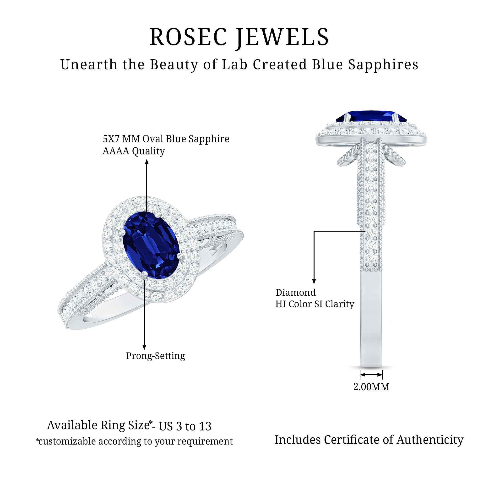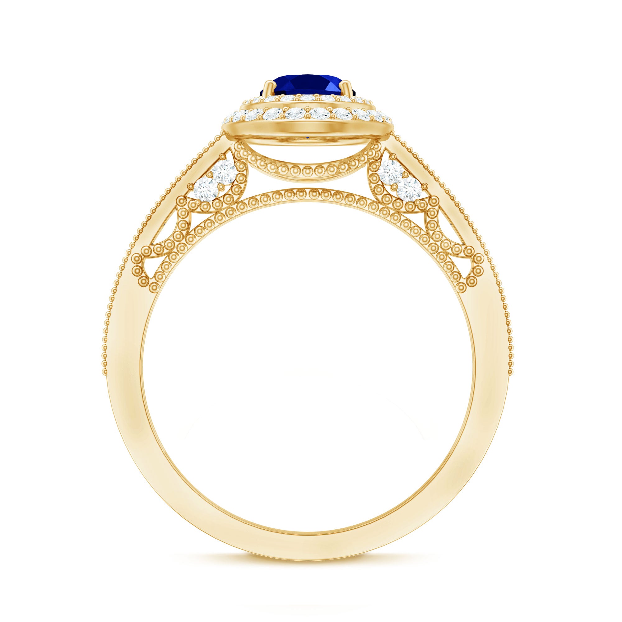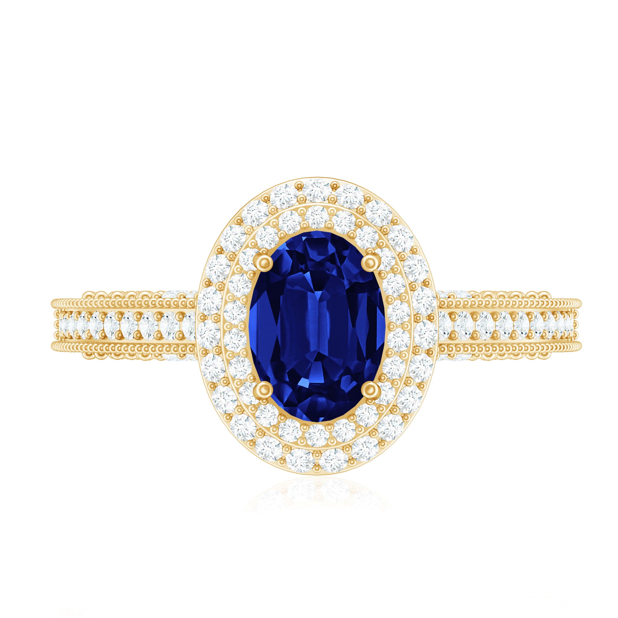 Timeless yet undeniably captivating, this Vintage Inspired Engagement Ring brings romance and elegance together in the most enchanting way. At the center of this stunning piece rests a brilliant 5X7 mm Oval Shape Lab Created Blue Sapphire set in Prong Setting, glowing with deep, royal blue tones that symbolize loyalty, passion and everlasting devotion. Surrounding the center stone is a dazzling Double Halo of sparkling Diamond stones that amplify its beauty, creating a radiant frame that catches the light from every angle. The band itself is adorned with shimmering Diamond stones and intricate Beaded detailing, adding texture and a touch of antique charm that makes the design truly special. Every element of this Oval Engagement Ring is thoughtfully crafted to celebrate love stories that deserve something extraordinary. Whether it marks the beginning of a forever journey or becomes a treasured symbol of commitment, this Lab Grown Blue Sapphire Engagement Ring speaks of romance in the most beautiful way. Presented in a signature jewelry box and available in multiple ring sizes, this Double Halo Engagement Ring is ready to become part of a moment that will be remembered for a lifetime.