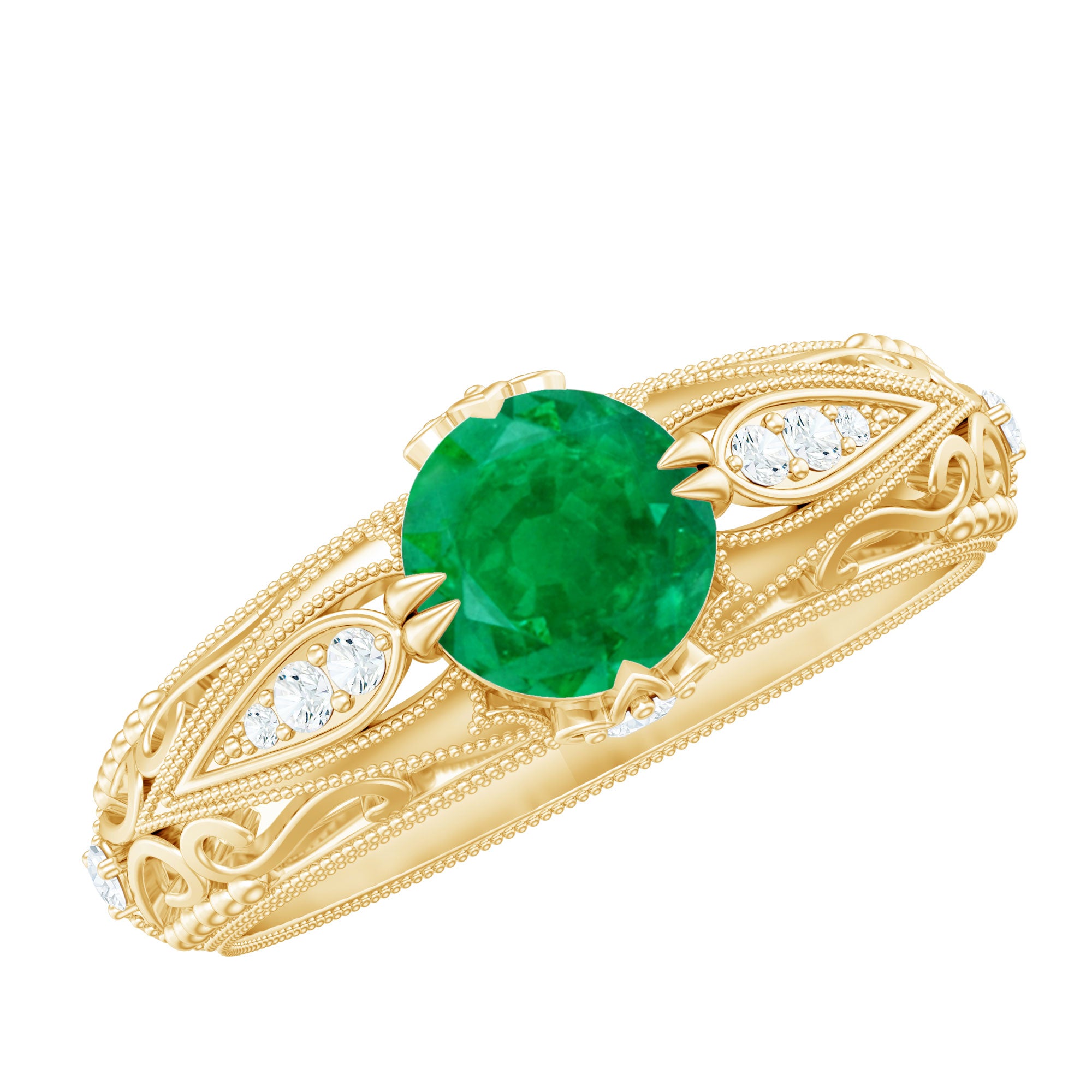 Step back in time with this Vintage Looking Engagement Ring, where vintage charm meets modern elegance. This stunning Solitaire Engagement Ring features a rich 5 mm Round Shape Emerald, its deep green hue exuding timeless romance and strength, accentuated by sparkling Diamond stones. The intricate Beaded Detailing along the band adds a touch of old-world craftsmanship, elevating the design with a sense of history and sophistication. This Vintage Emerald Engagement Ring is carefully crafted to tell a story of love that transcends time, capturing the essence of a vintage masterpiece. Whether you are proposing or celebrating an anniversary, this Emerald Diamond Ring is a symbol of eternal devotion, designed to make the moment unforgettable. Presented in a signature jewelry box and available in a range of sizes, this Real Emerald Engagement Ring is ready to be a part of your journey together.