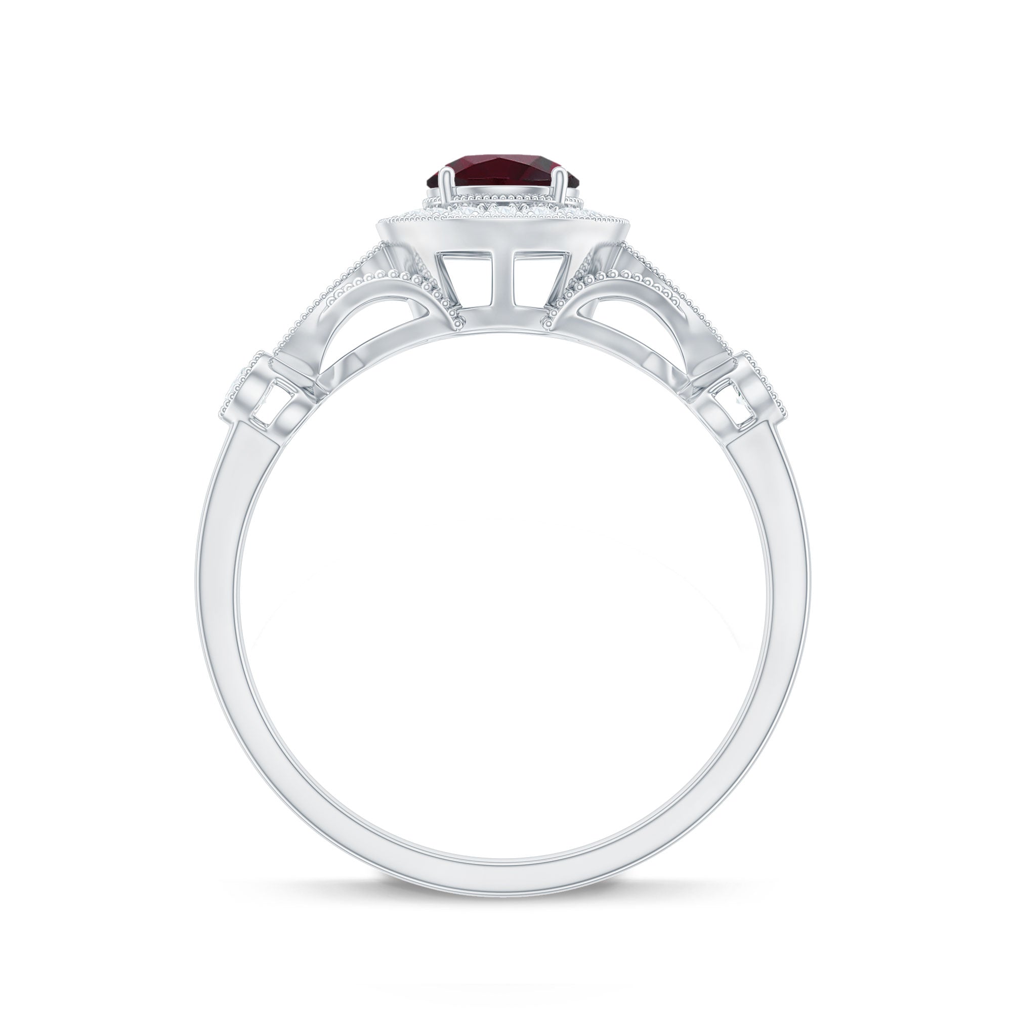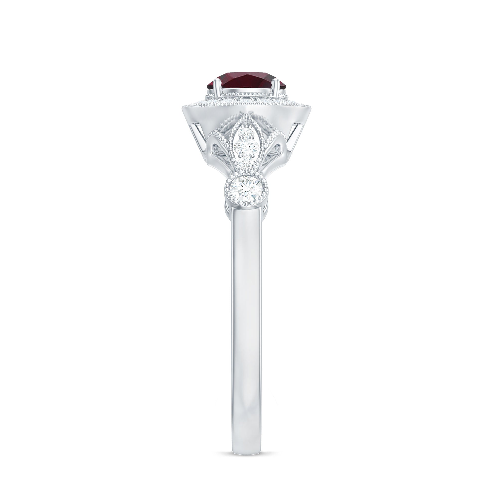 The Vintage Engagement Ring is adorned with 5 MM Round Shape Rhodolite in 4 Prong Setting mounted in Solid Gold and embellished with Round Diamond arranged in Halo on the Solitaire Ring. The Engagement Ring is also decorated with Milgrain for a Vintage look.