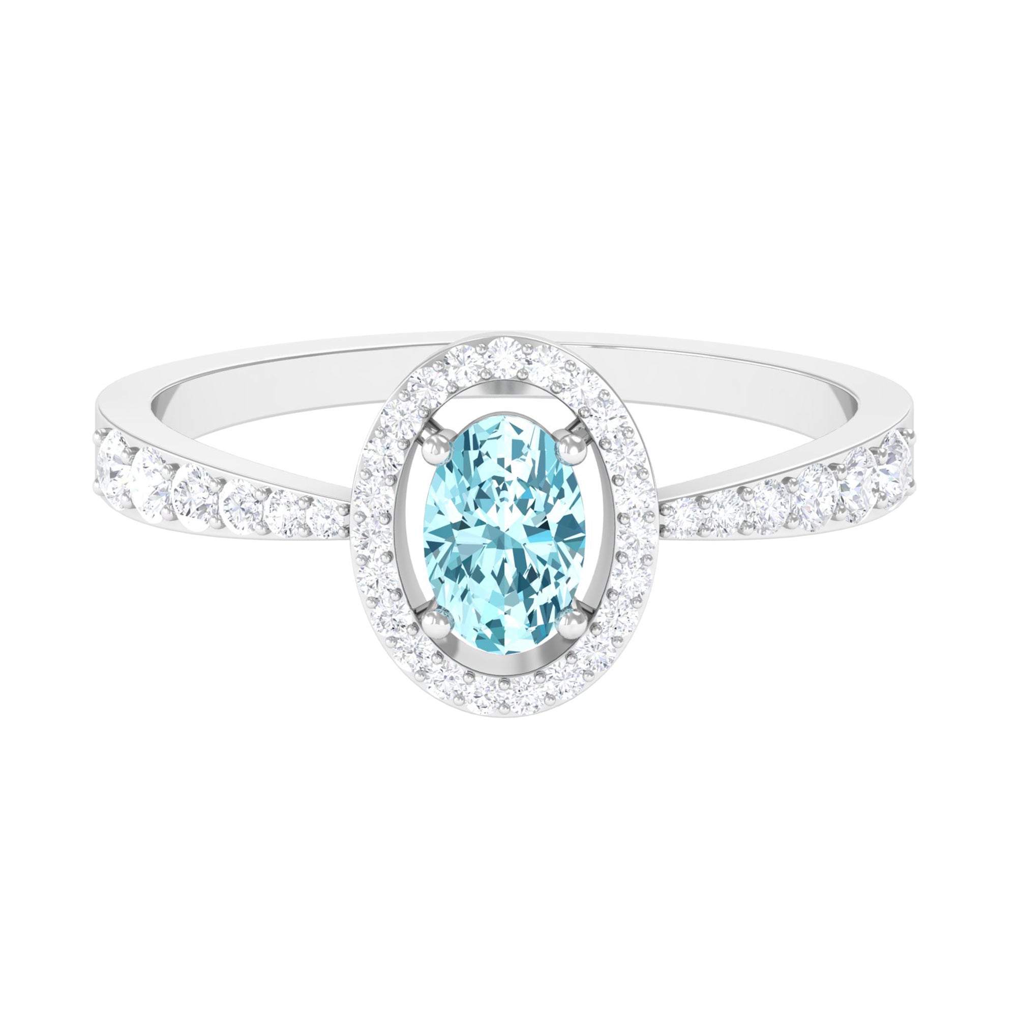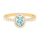 Start your journey of love with this Beautiful Aquamarine and Diamond Engagement Ring. It is embellished with Oval cut Aquamarine in Prong Setting and Round Shape Diamond creating a Floating Halo with Side Stones on the half Shank. This Aquamarine Engagement Ring is Crafted in Gold to make it a piece of women Fine jewelry.