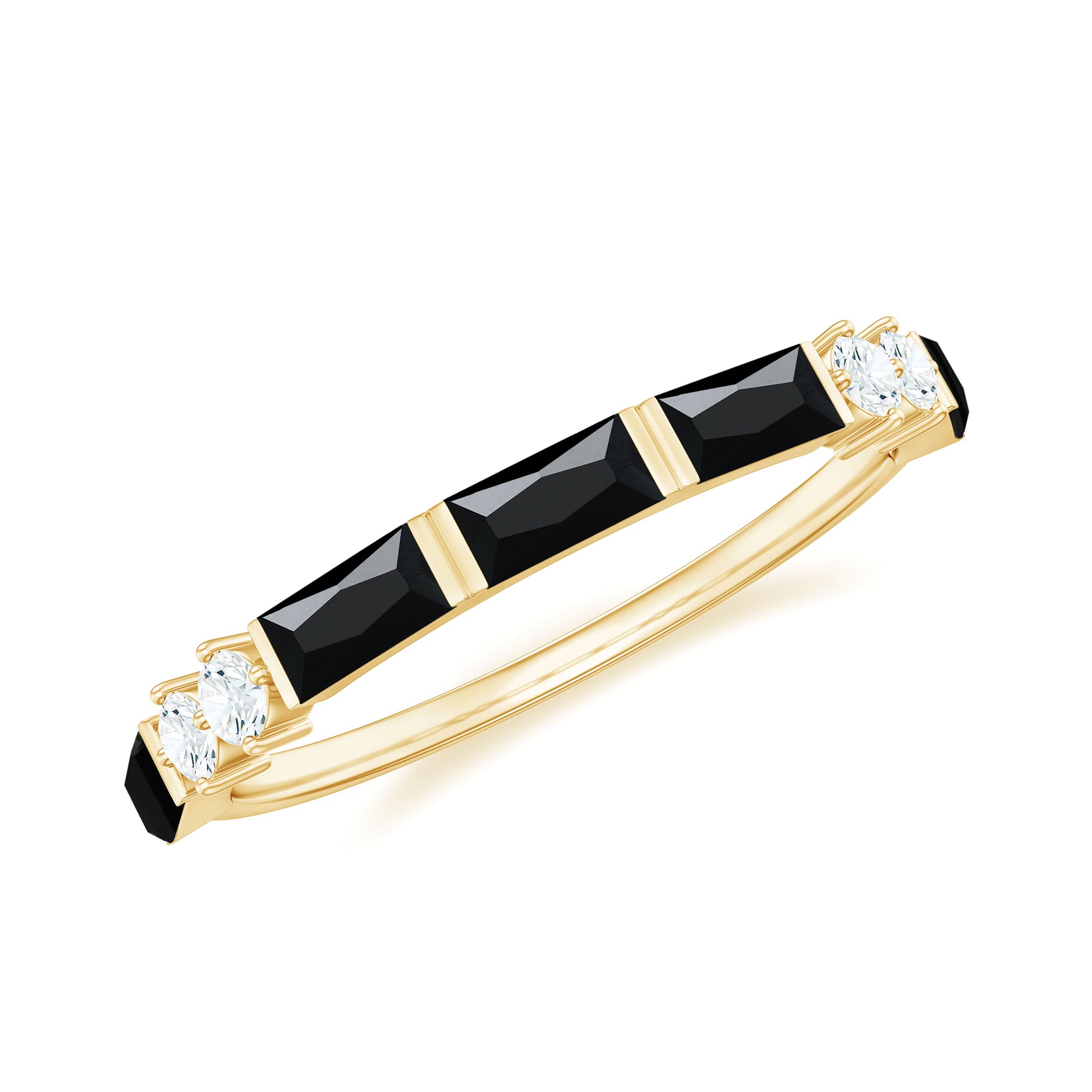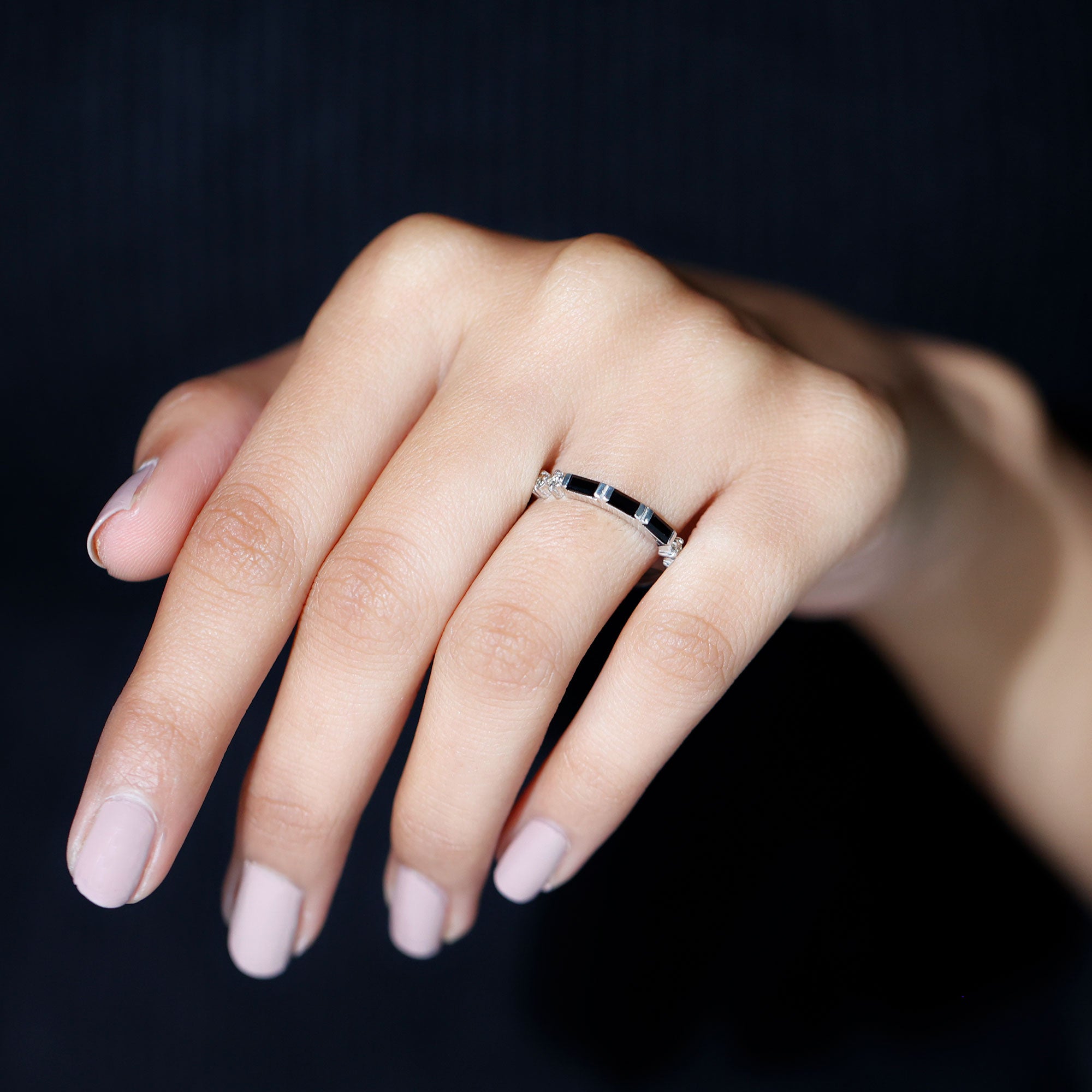 Strike out a wonderful statement on any special occasion by wearing this elegant Half Eternity Ring adorned with Baguette Shape Created Black Diamond and Round Shape White Diamond gemstones.Lab Created Black Diamond - Brilliant Cut Lab Created Black Diamond Gemstone exhibits AAAA Quality and possess vibrant color. It is Certified and inclusion free, which makes it a preferable and highly desirable gem. It is a perfect alternate option of Black Diamond in budget. Exceptional Durability and vitreous Luster of this stone makes it a popular cost-friendly choice. Diamond - HI Color SI Clarity and precise Carat Weight possessed by Brilliant Cut Diamond indicates its preciousness. April Birthstone summons good fortune, serenity, and wealth. It is Real and Certified, helps in enhancing physical health and evokes emotions. Diamond shows great Durability and Luster, forever sparkling nature of diamond makes it the most desirable stone of all times.
