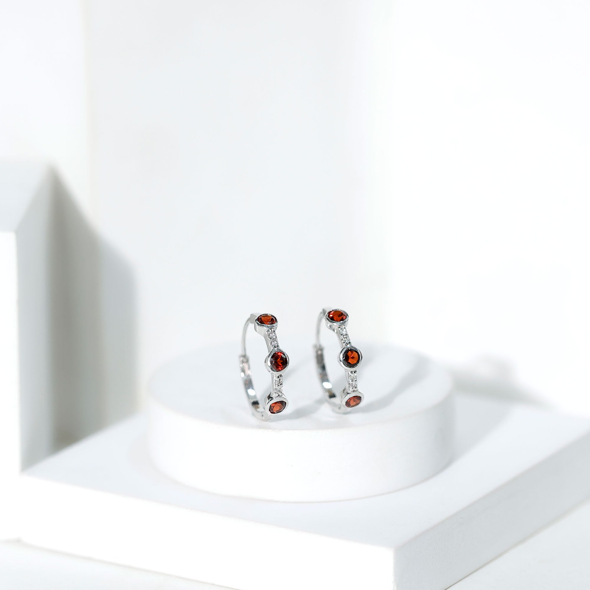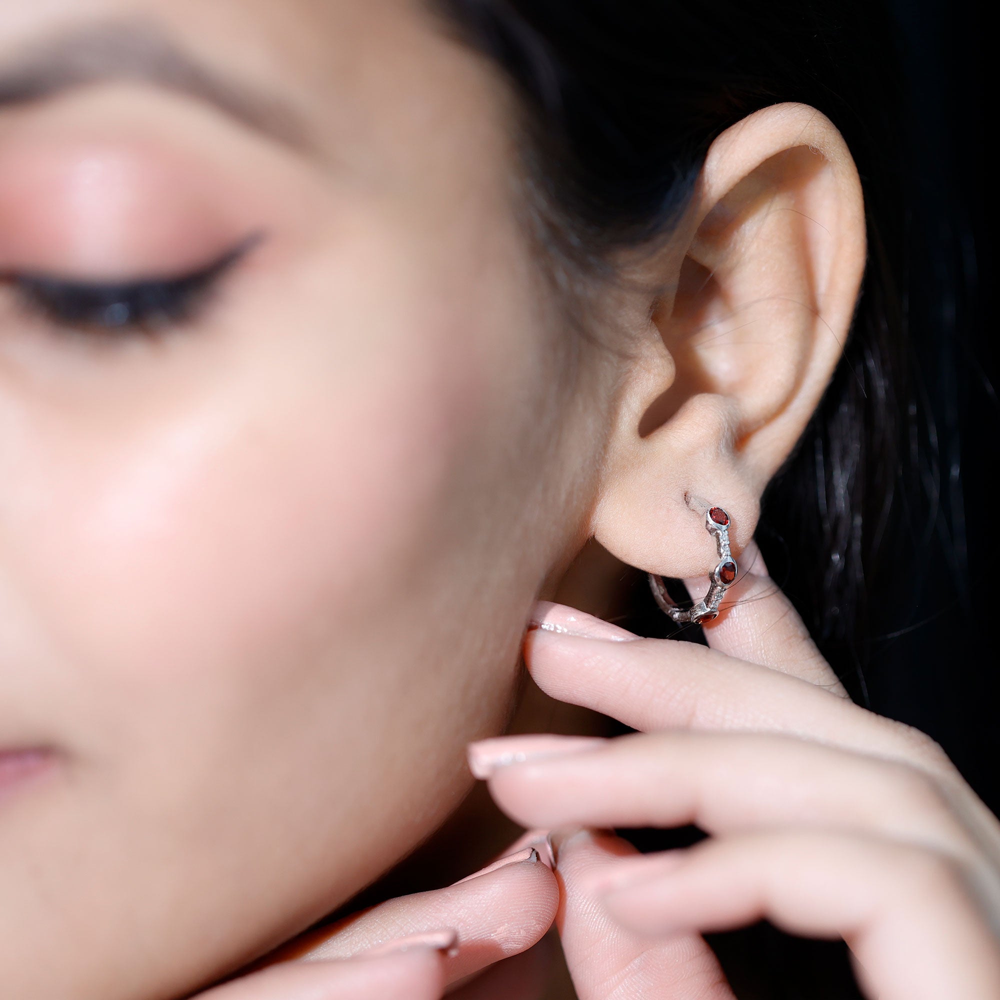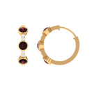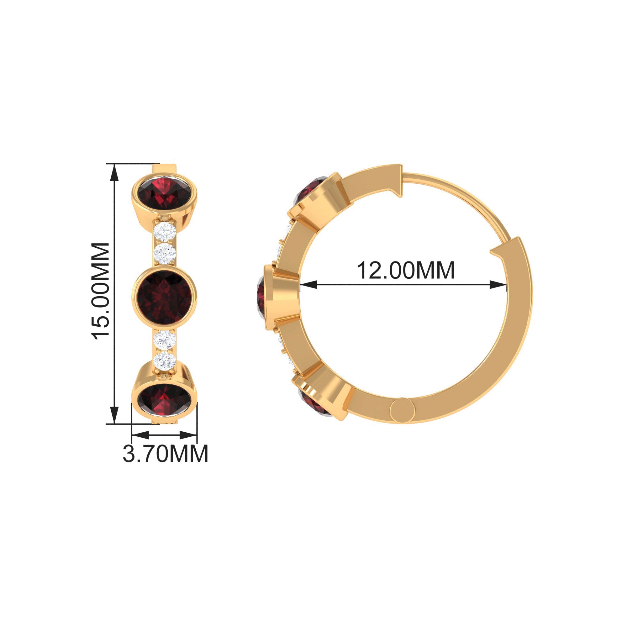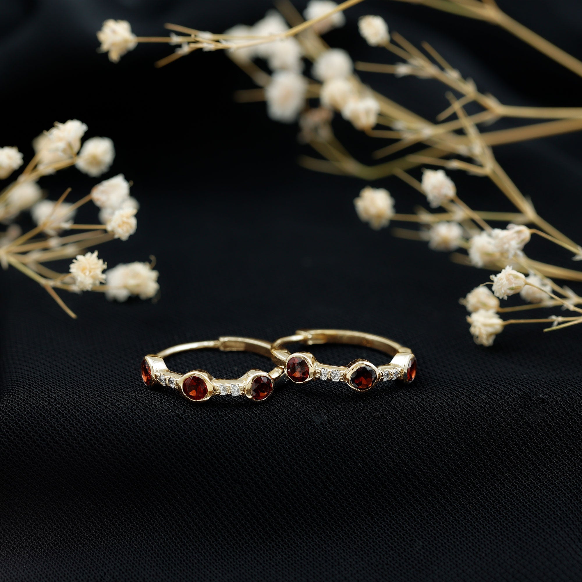 Behold the allure of these Hinged Hoop Earrings, adorned with Brilliant Round Cut Garnet gems, carefully set in a Bezel Setting. The addition of Diamond accents creates a truly captivating and breathtaking look. These earrings exude a sense of luxury and elegance. Embrace the enchanting appeal of this stunning combination, guaranteed to make a statement and enhance your beauty on any occasion.
