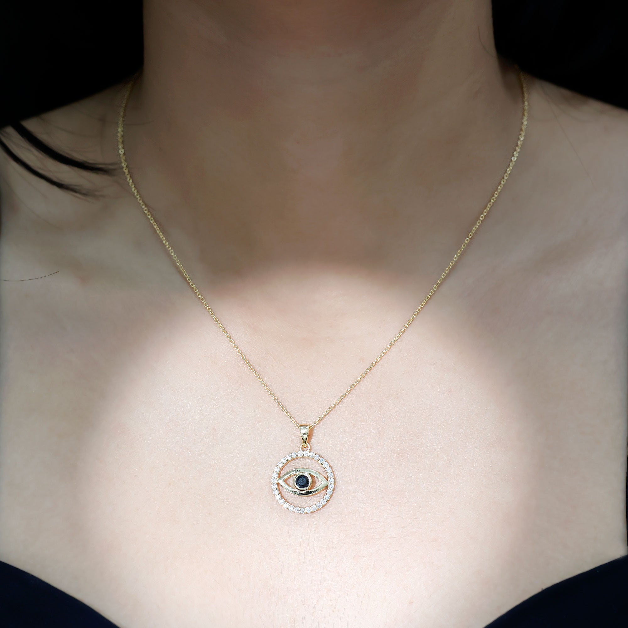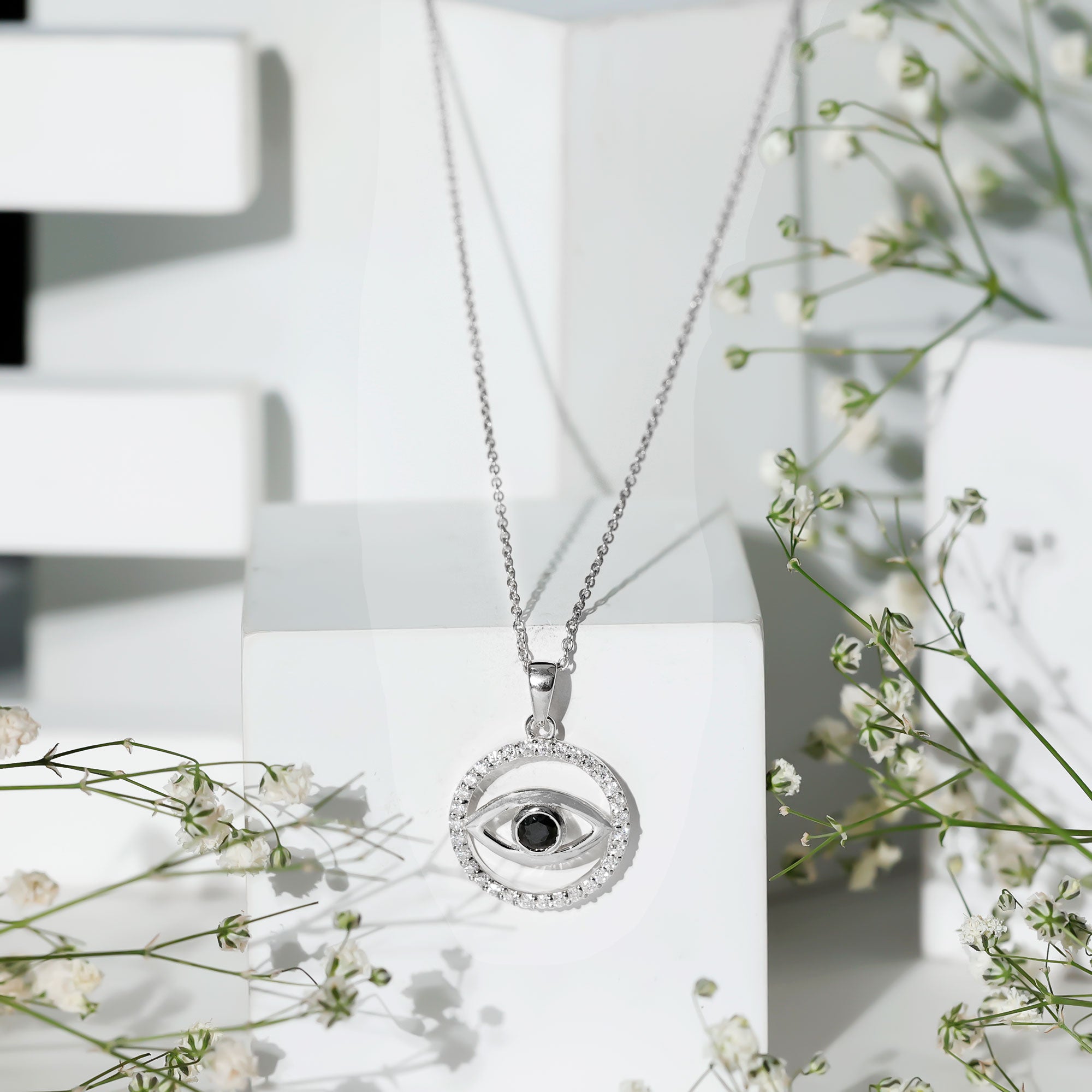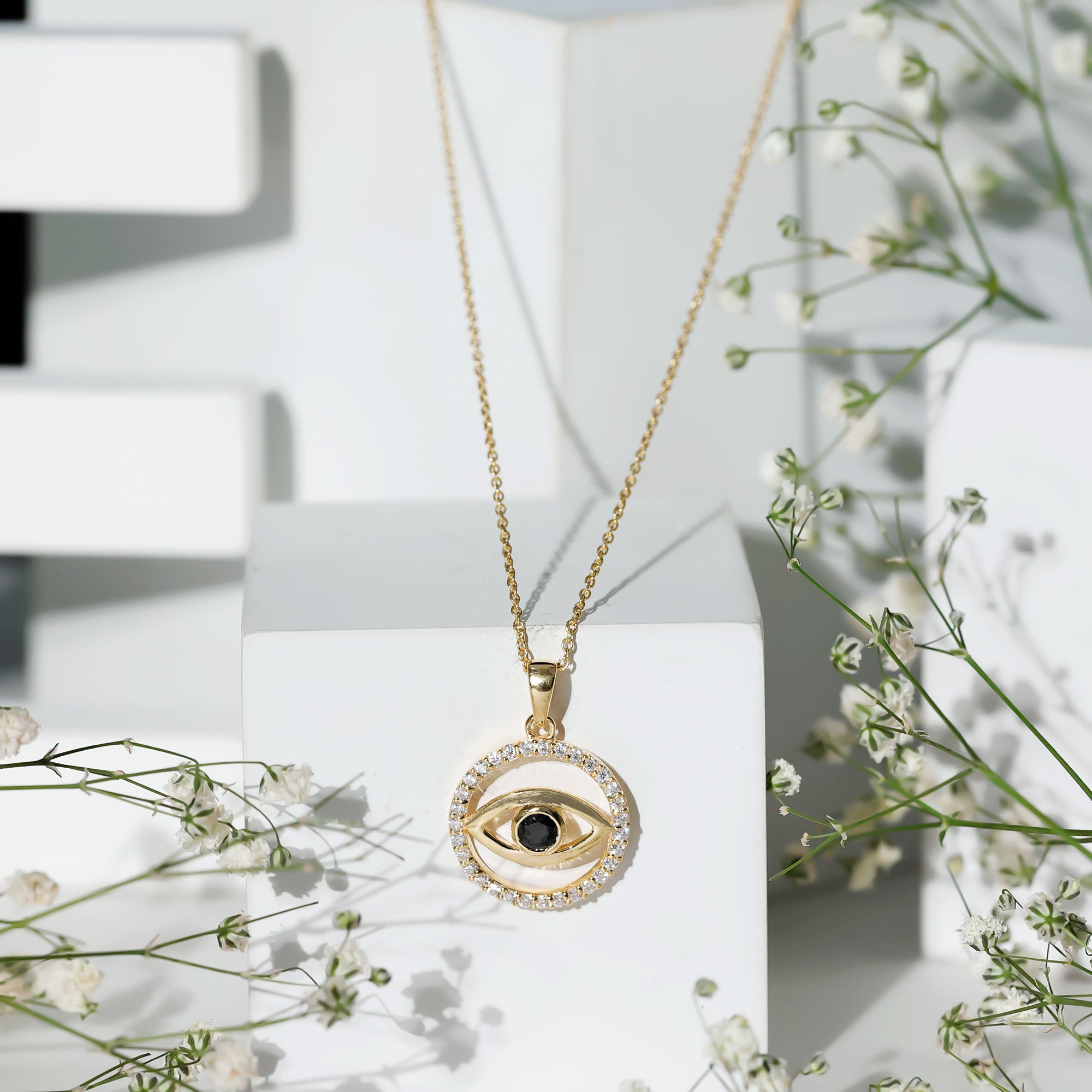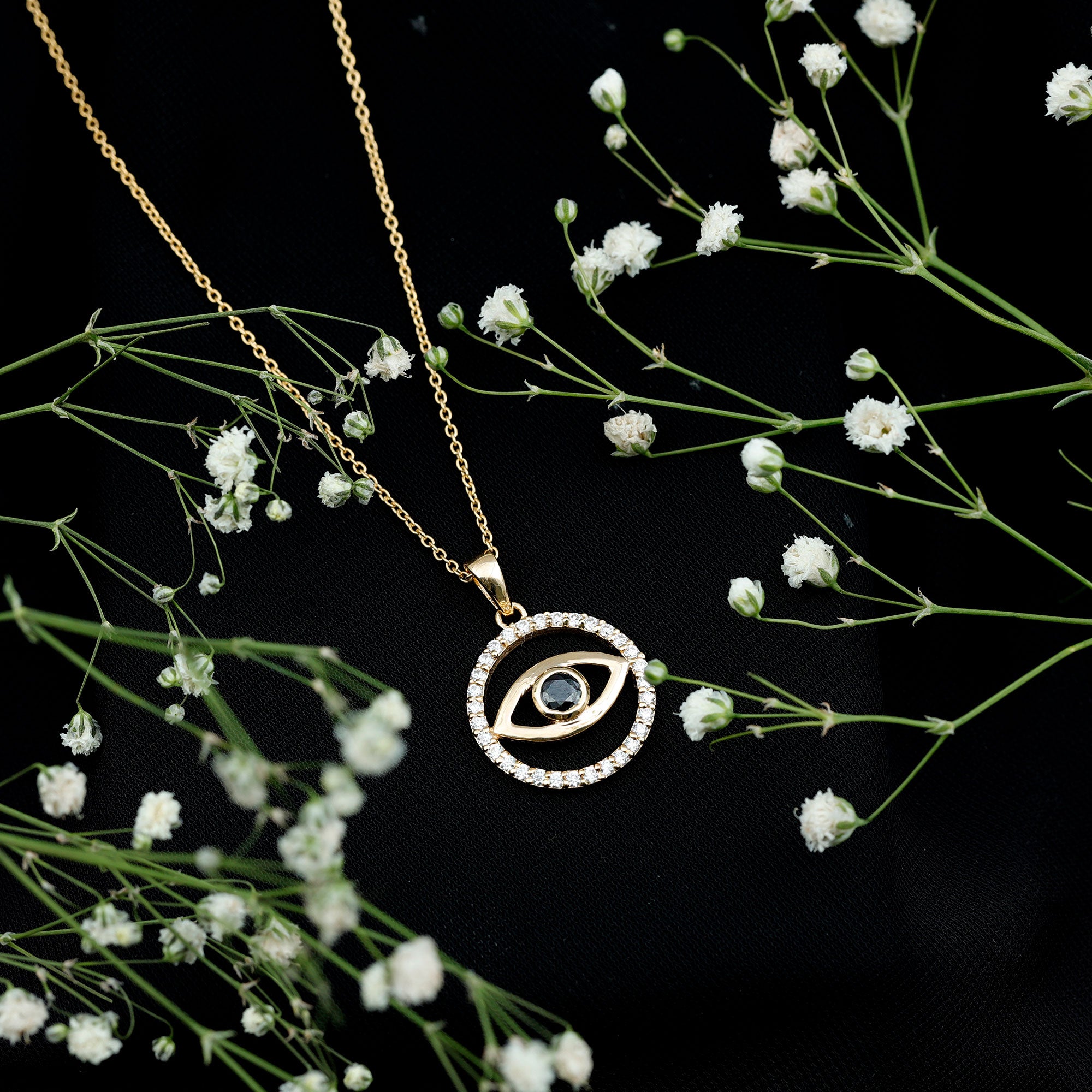 This exquisite pendant showcasing the Evil Eye design exudes just the right amount of charm and would make an excellent present for someone special. The Black Onyx pendant is crafted with a circular eternity design encrusted with dazzling round-cut Black Onyx gemstone in a secure bezel setting. The eternity circle is further accentuated with brilliant-cut Moissanite stones, enhancing the overall elegance and sophistication of the piece. This evil eye pendant necklace is a perfect accessory to add a touch of glamour and refinement to any outfit.
