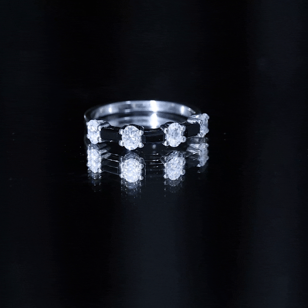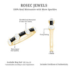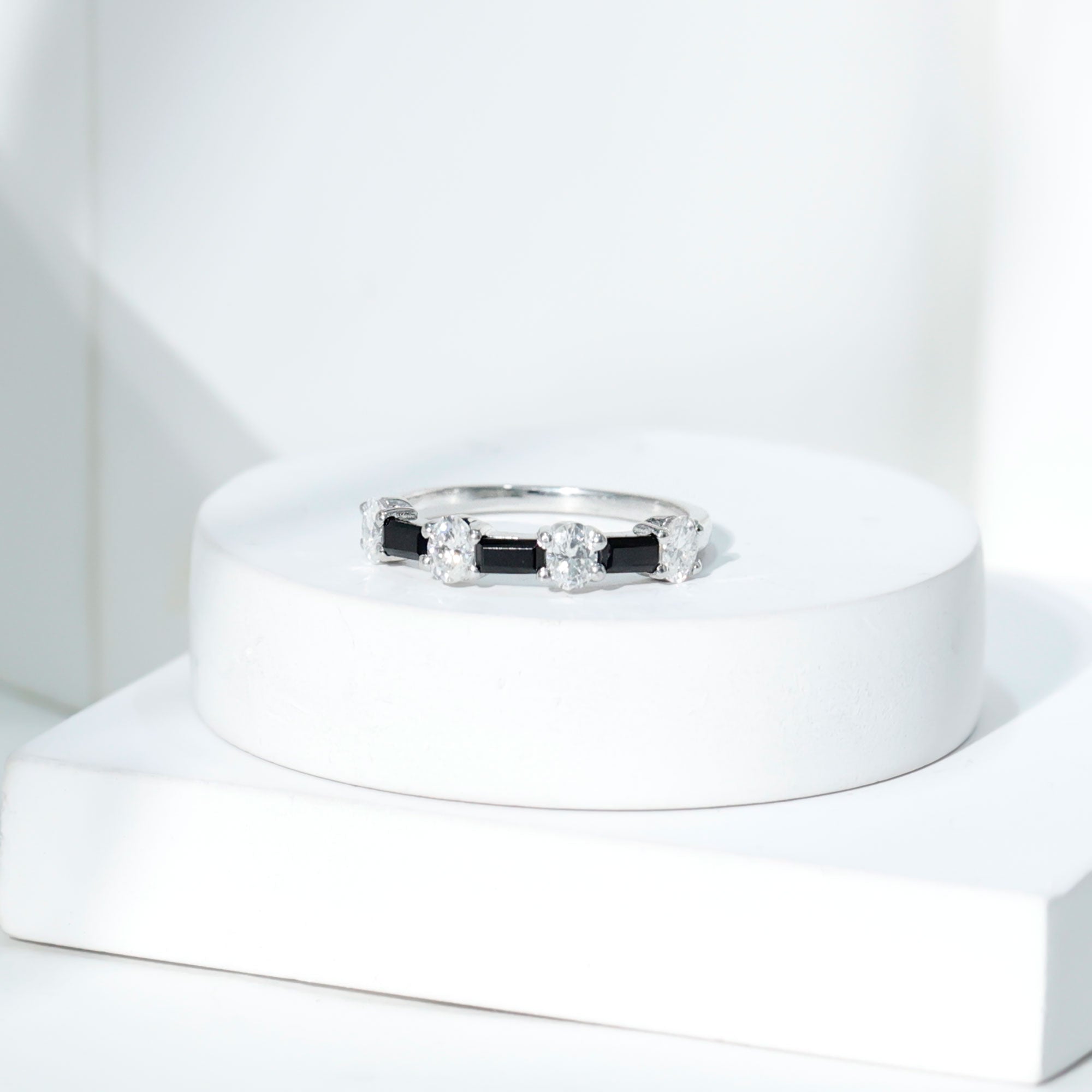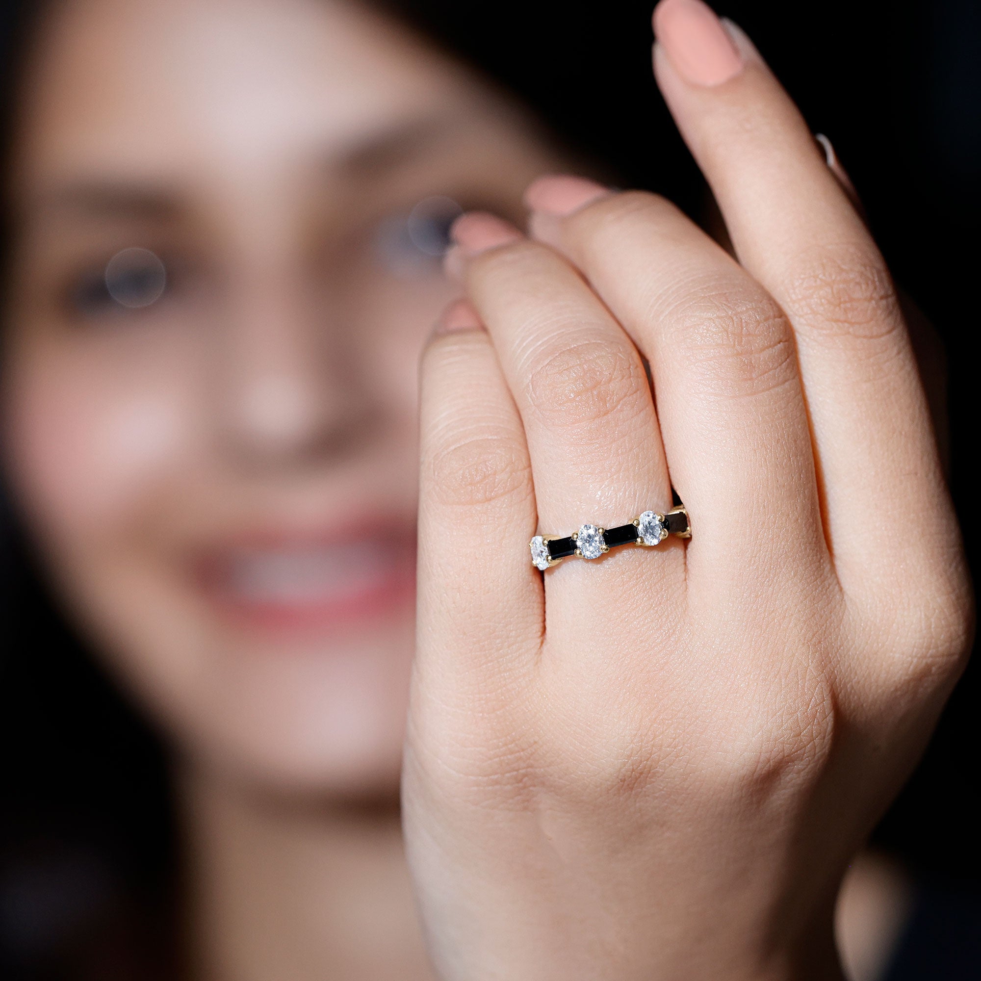 Lift up your look with this Half Eternity Ring, it is featuring Baguette Cut Black Spinel and Oval Cut Moissanite, held in Prong Setting to give this ring enchanting appeal. The Black Spinel and Moissanite are held alternative to each other. This Semi Eternity Ring will add effortless grace and charm to your look.