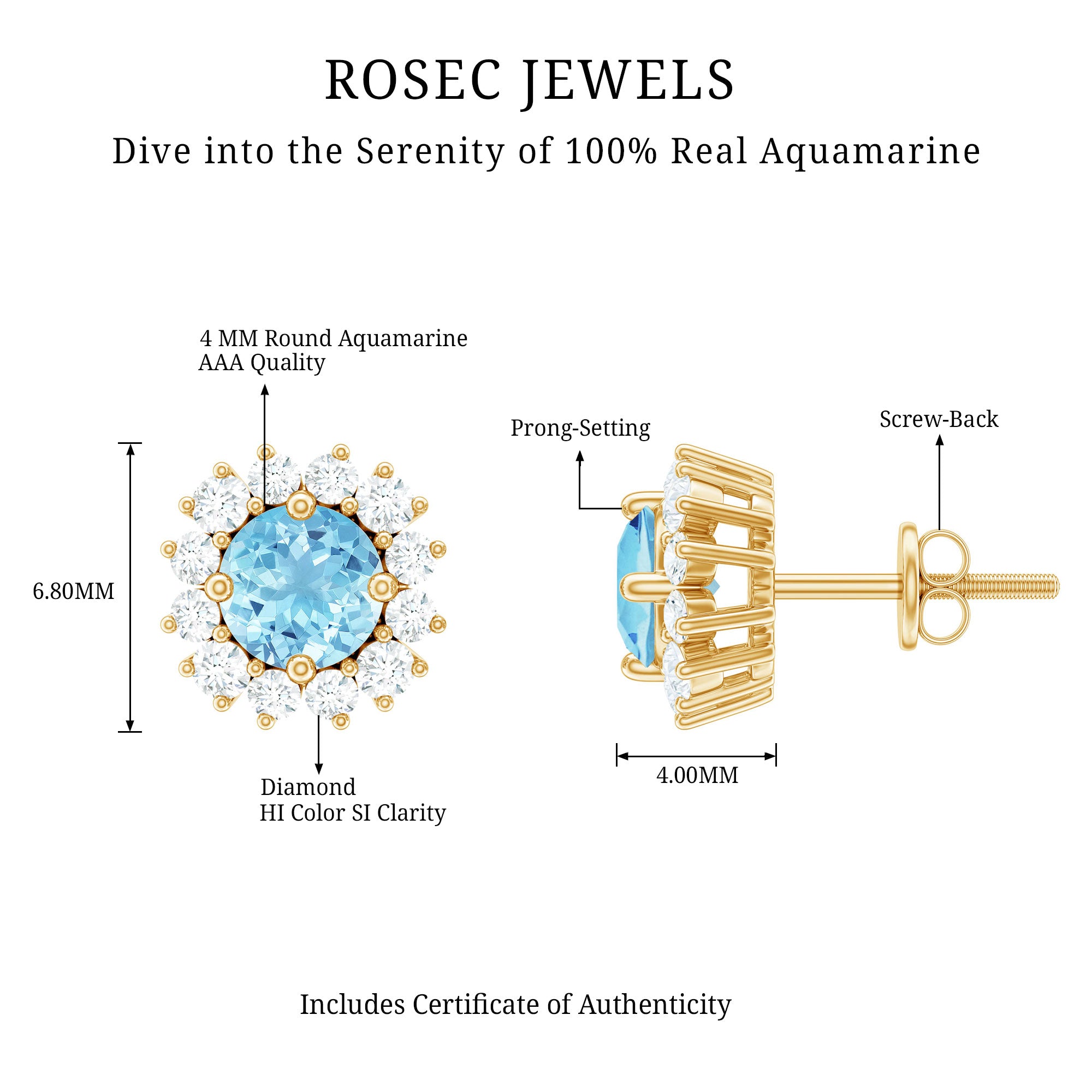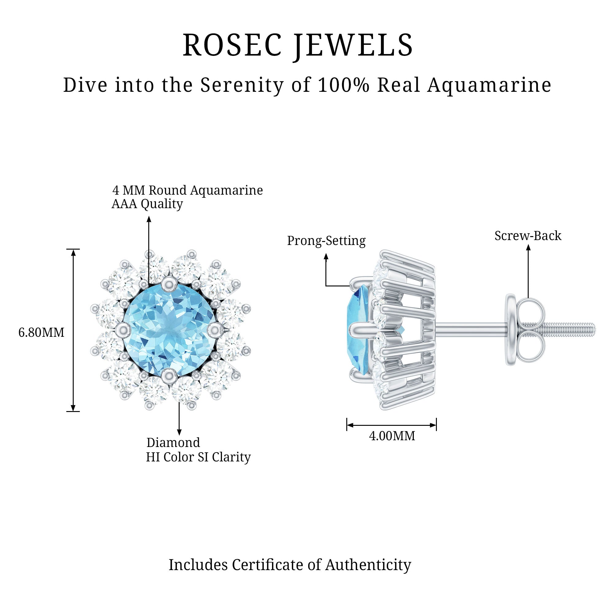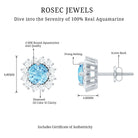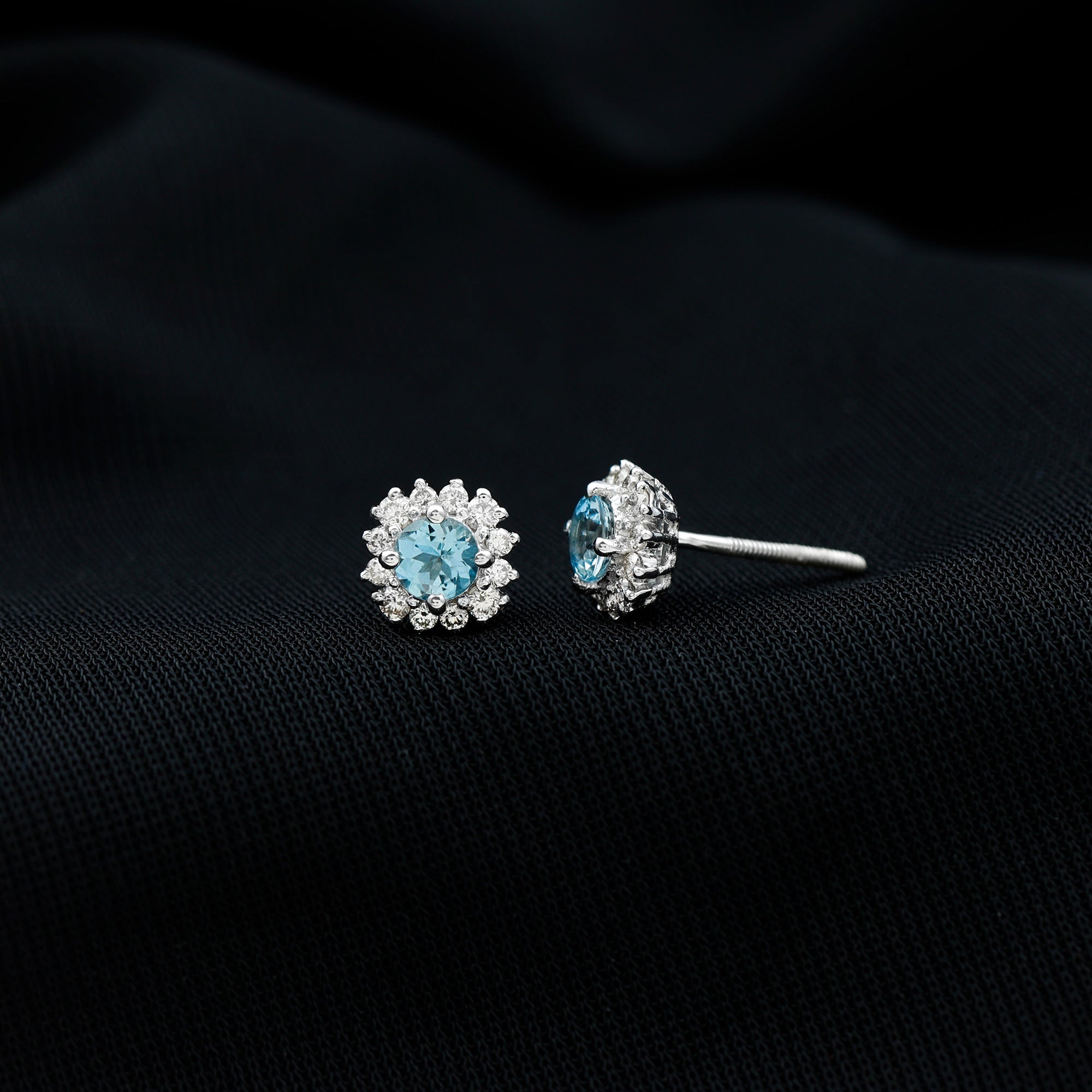 These classic earrings for women feature a Round Shape aquamarine gemstone set in a prong setting, surrounded by Round Shape Diamond Stones set in a halo. The combination of aquamarine and Diamond Stones adds a touch of elegance and sophistication to the overall design. The prong setting of the halo stud adds a unique and timeless look to the earrings.