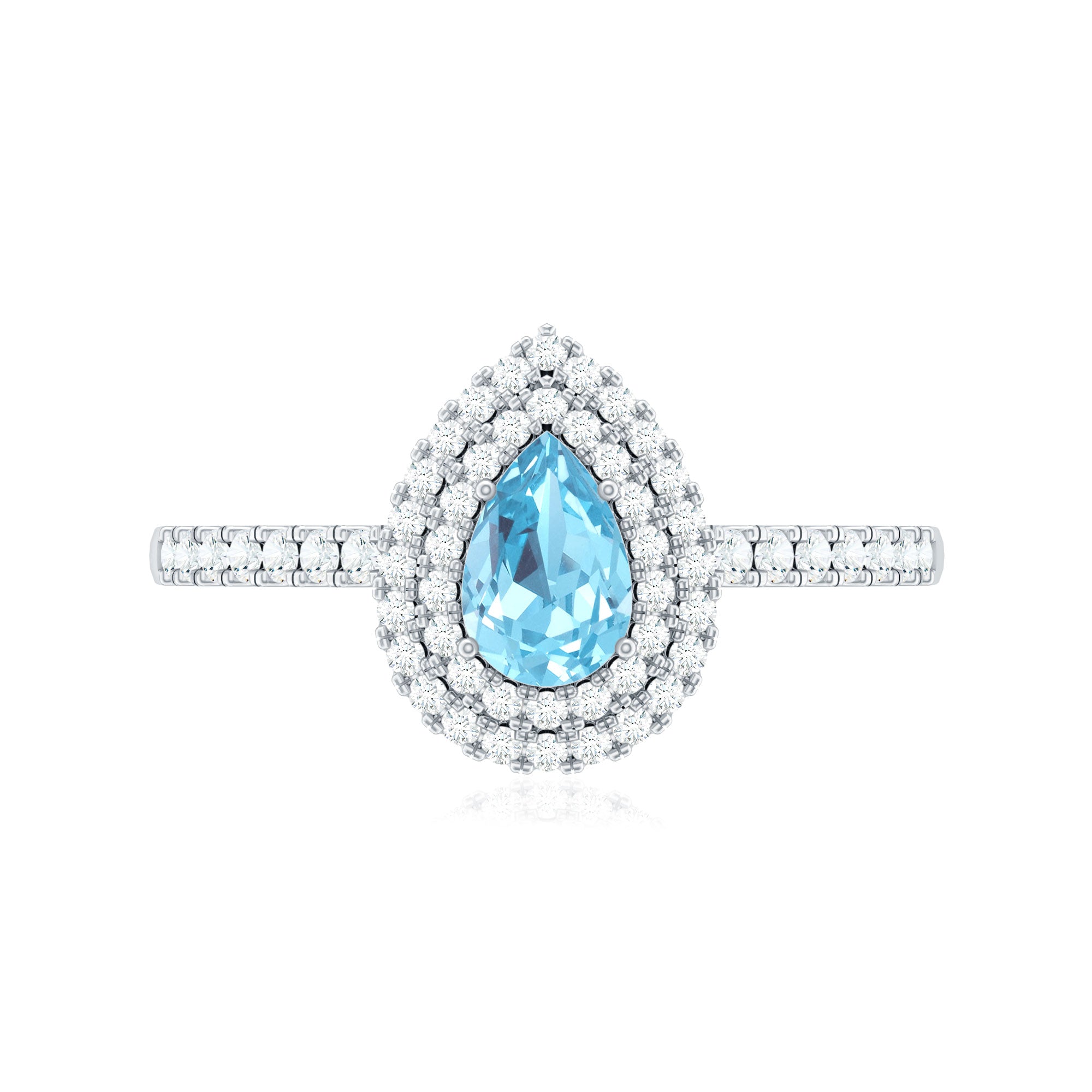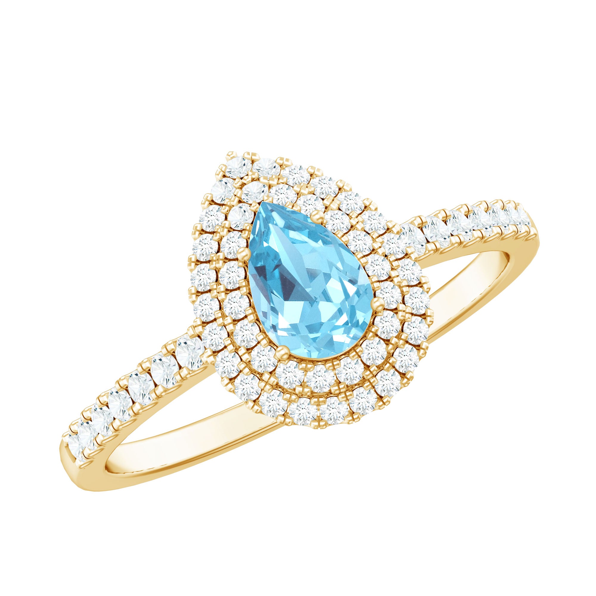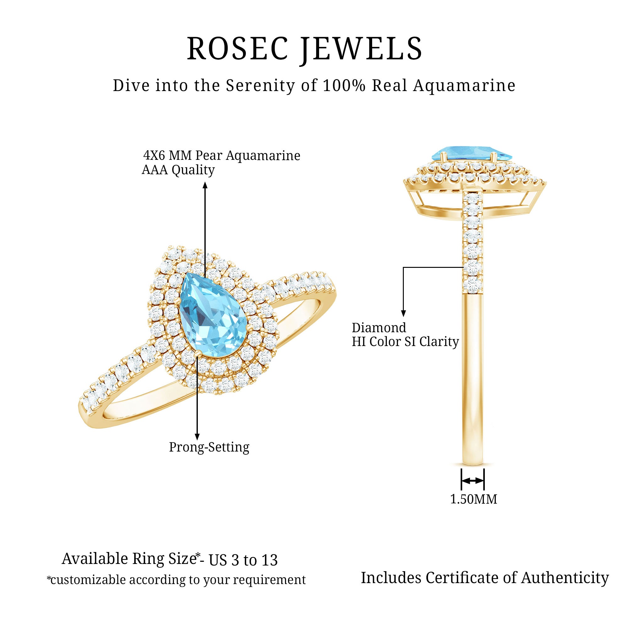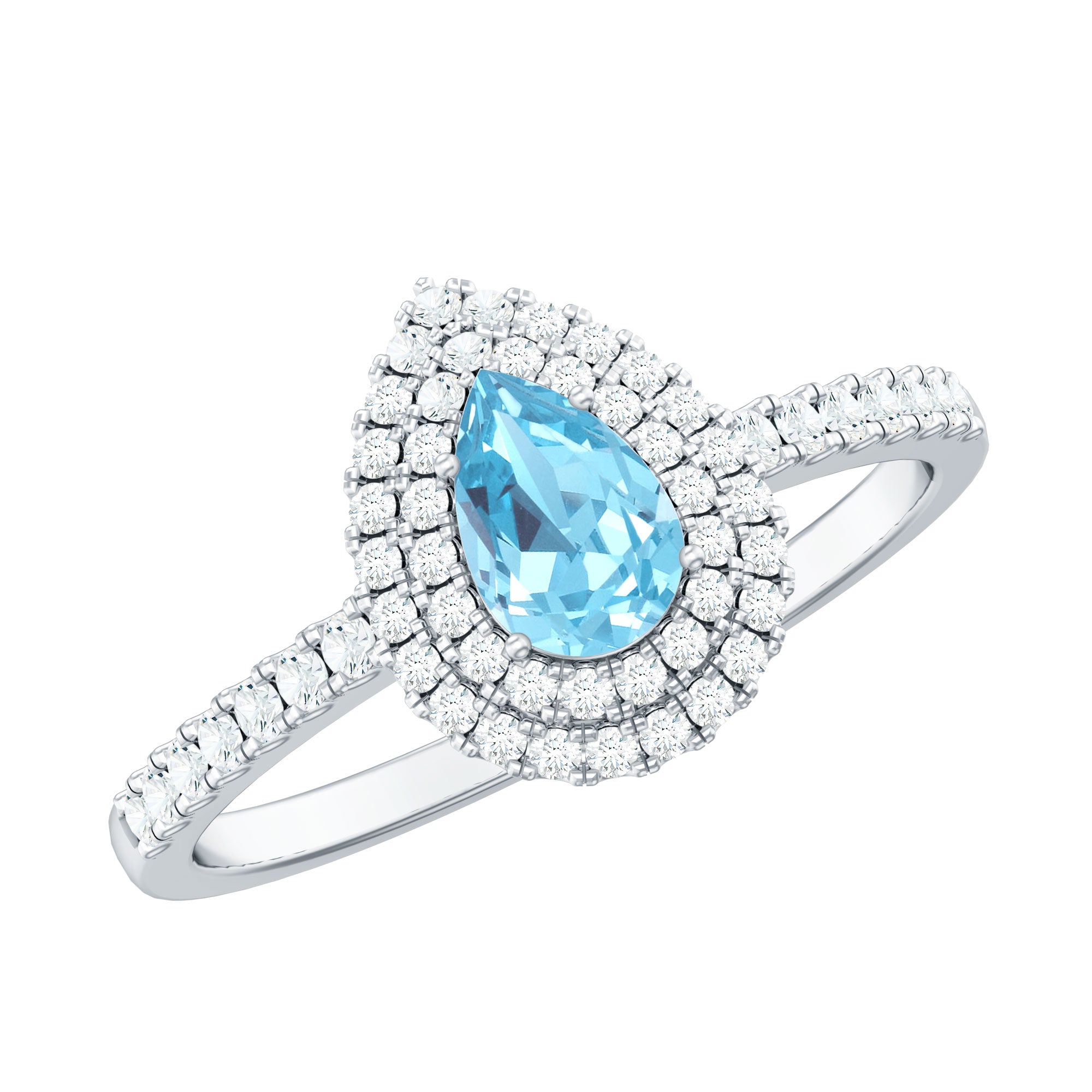 A Perfect and Classic Teardrop Engagement Ring is adorned with Pear Shape Aquamarine is set as a solitaire in a prong setting and Round Shape Diamond in a Double Halo and Side Stones. This Teardrop Engagement Ring is crafted in solid gold.