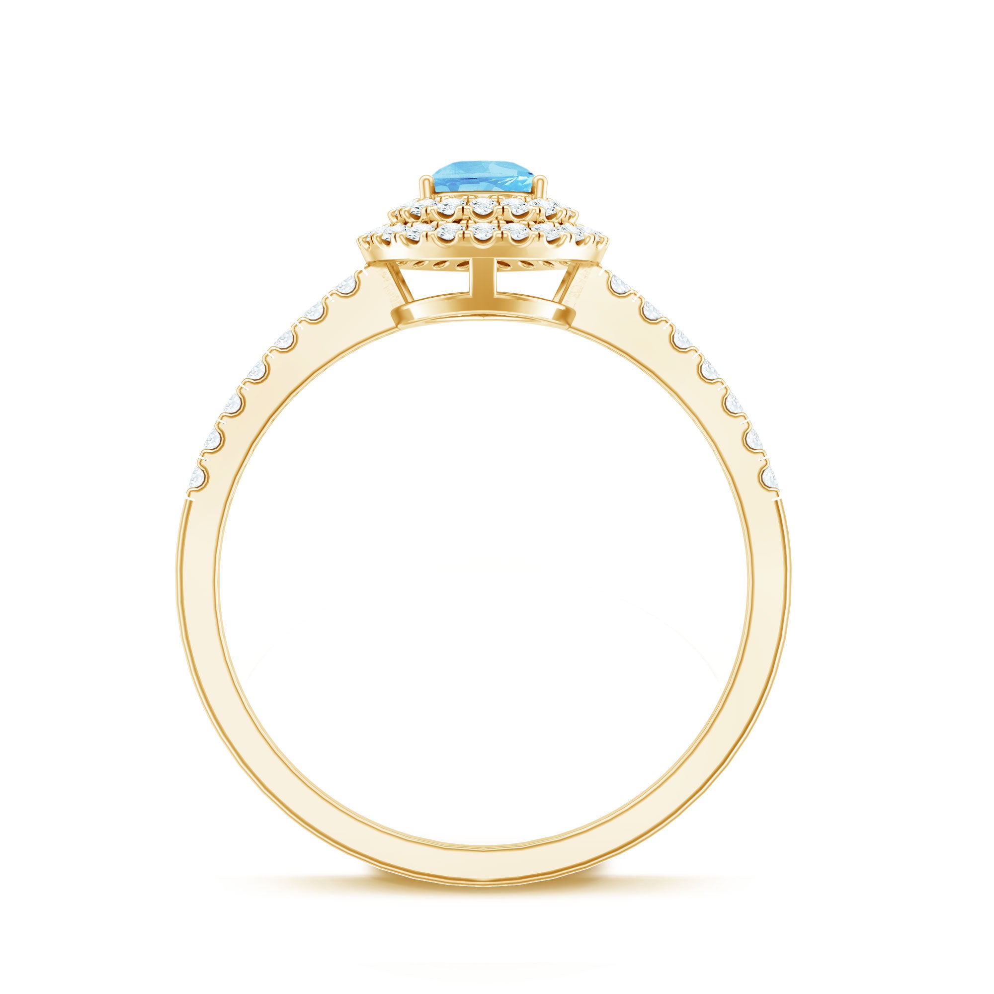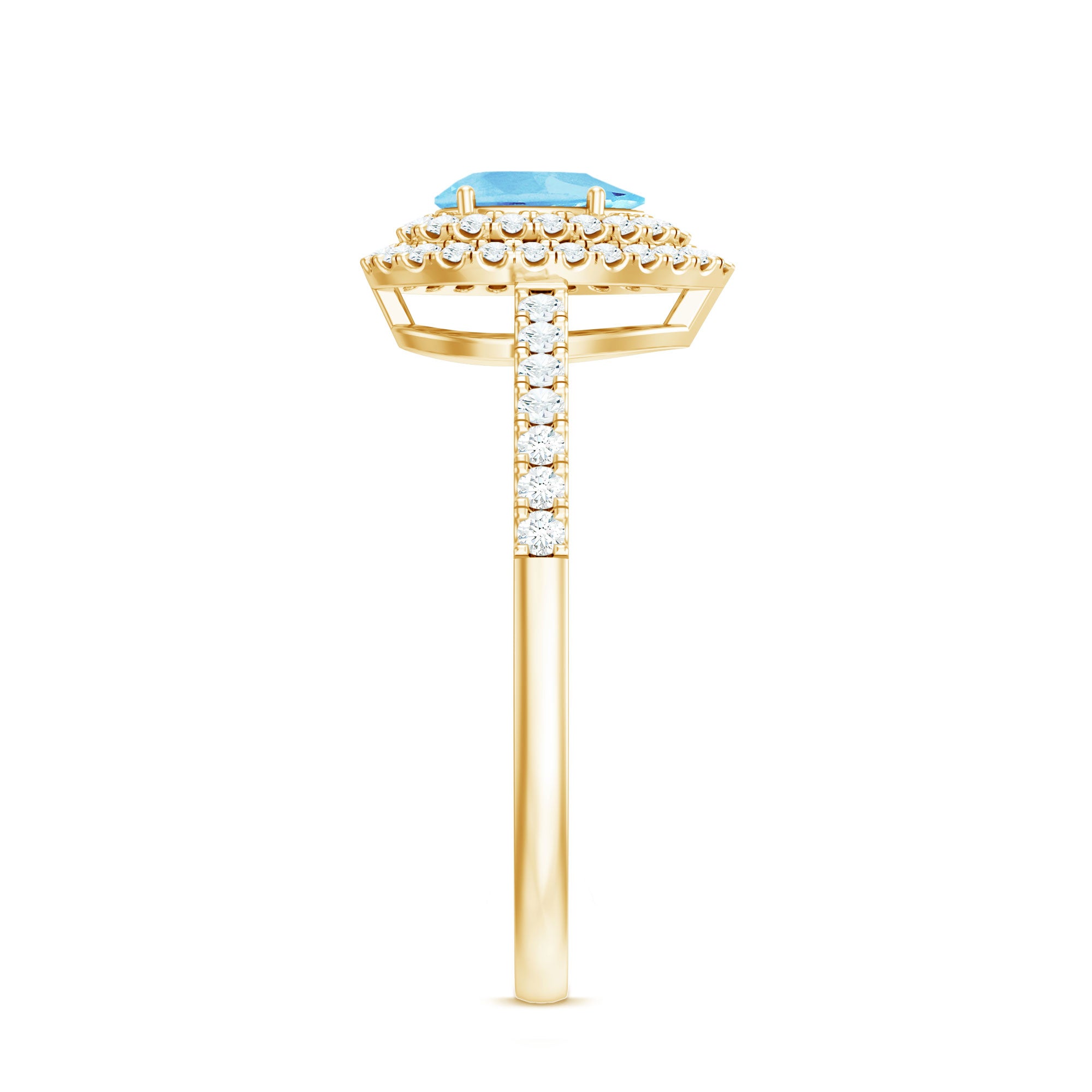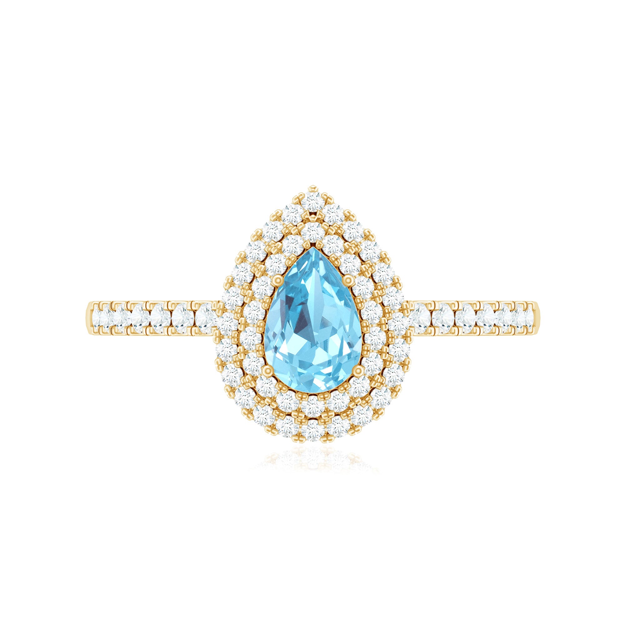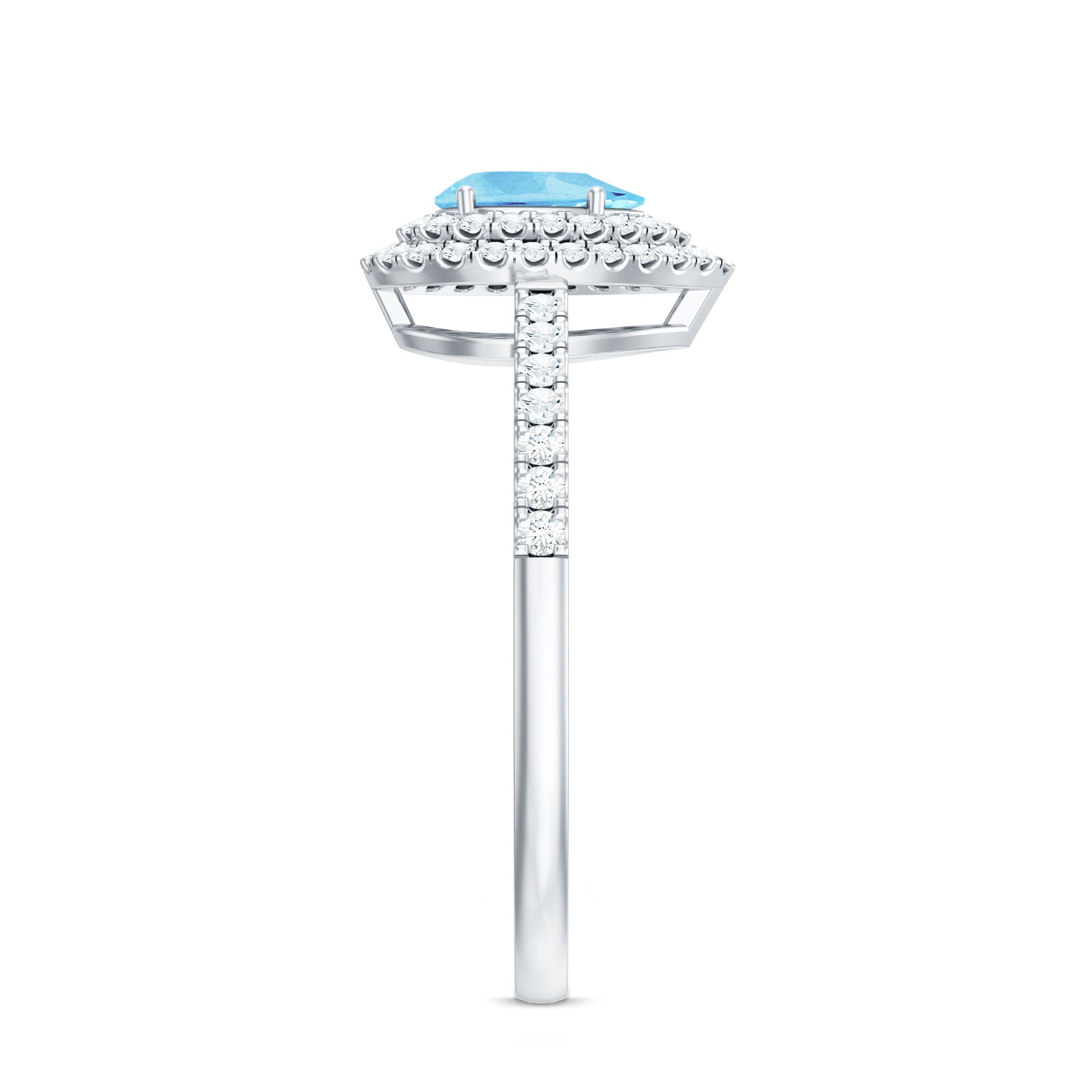 A Perfect and Classic Teardrop Engagement Ring is adorned with Pear Shape Aquamarine is set as a solitaire in a prong setting and Round Shape Diamond in a Double Halo and Side Stones. This Teardrop Engagement Ring is crafted in solid gold.