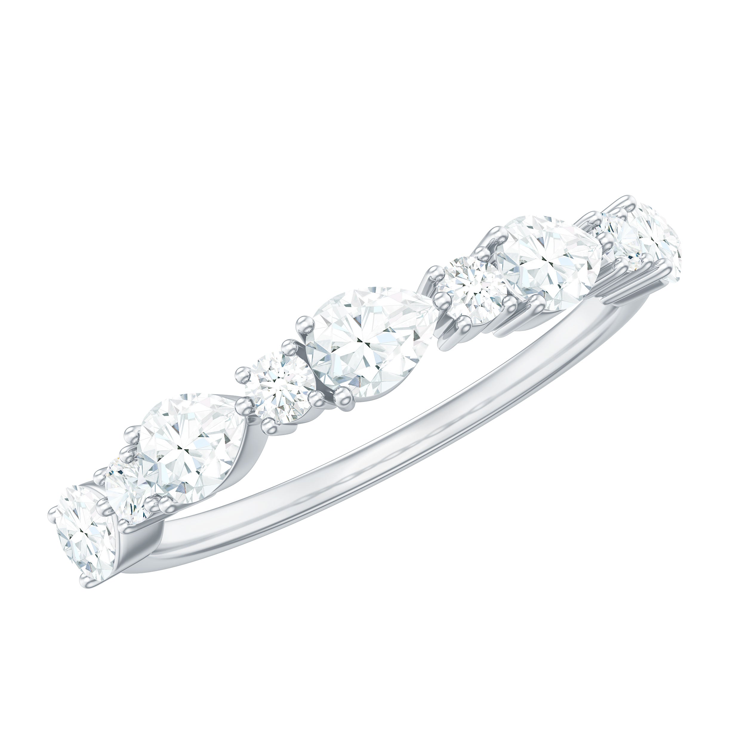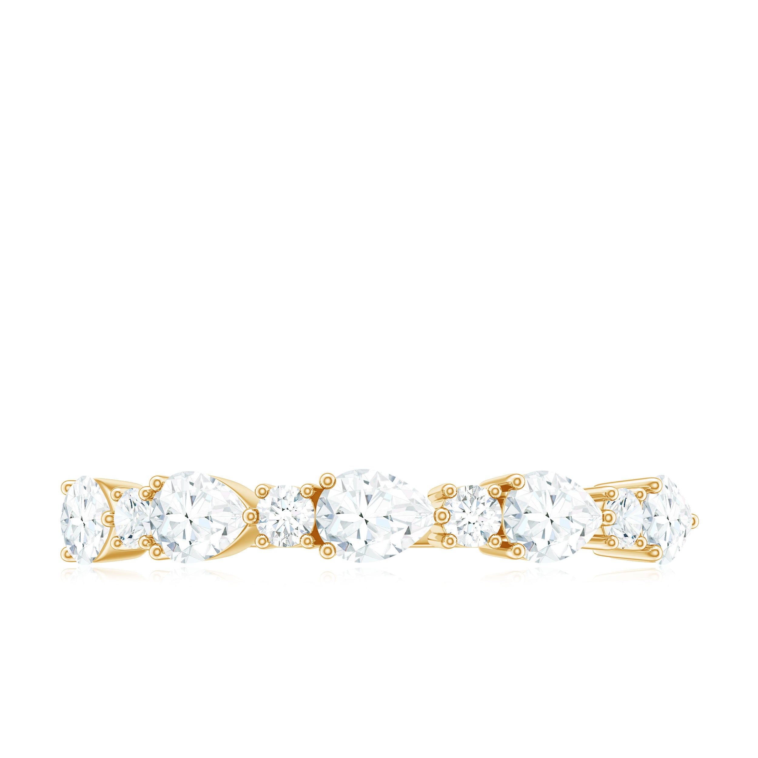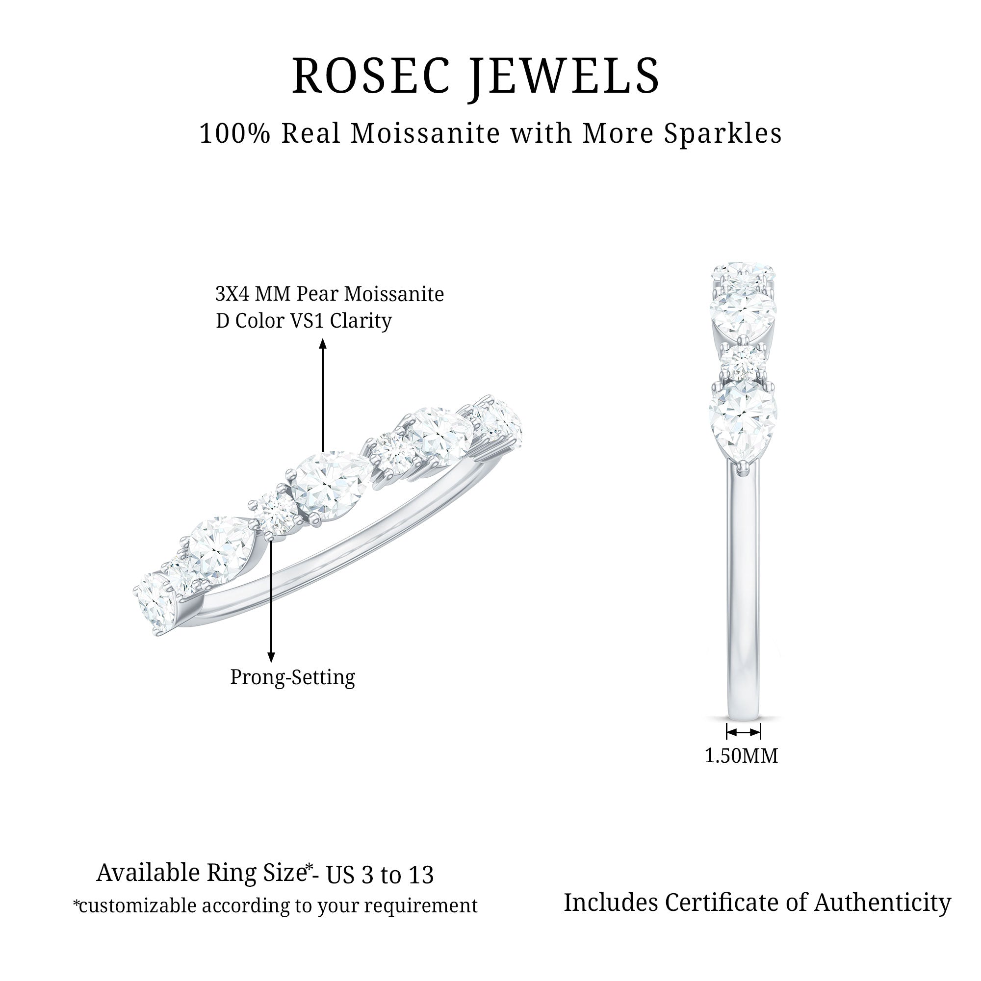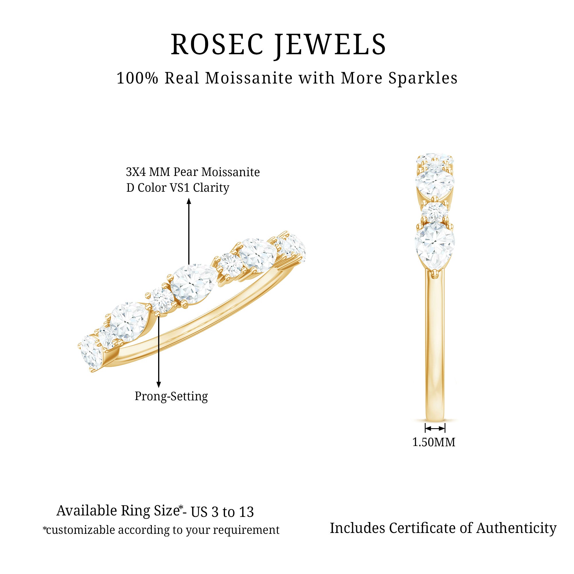 This Moissanite Half Eternity Band perfectly blends unique design with everyday elegance. It is crafted for those who appreciate modern sparkle with a touch of tradition. This Eternity Wedding Band showcases a stunning row of alternating pear and round moissanite stones. The pear shaped stones are set horizontally or we can say in East West Style, giving the ring a chic twist, while the smaller round stones add extra shine in between. Each stone boasts D color and VS1 clarity, meaning they are incredibly clean and full of brilliance. Expertly prong set, these gems reflect light beautifully from every angle, making this Stackable Eternity Ring a standout piece whether worn solo or stacked with other rings. Perfect as a wedding band, anniversary band, or a special stacking ring, this piece is versatile and easy to wear every day. Its half eternity design ensures that the top of the Wedding Anniversary Band sparkles, while the back remains smooth and comfortable, making it practical for daily wear without losing any shine. Whether you are celebrating a milestone or simply want to treat yourself to something timeless yet trendy, this Moissanite Wedding Band is an excellent choice. Its minimal yet eye-catching design makes it a favorite among modern brides and jewelry enthusiasts alike.