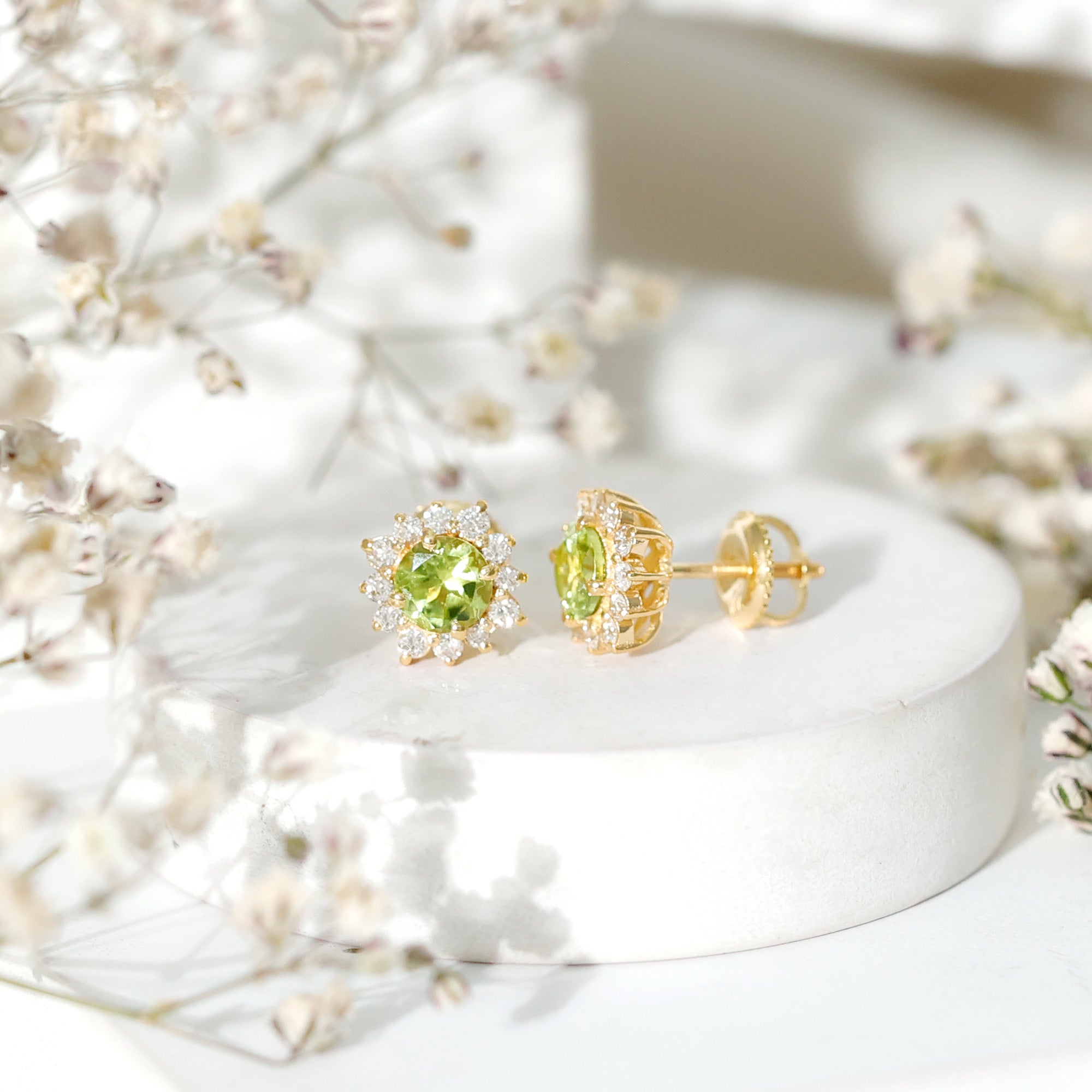 Look as stunning as ever while flaunting this pair of Halo Stud Earrings featuring a Round Shape Peridot Gemstone in the center set in prong setting encircled by a Halo of sparkling Round Shape Diamond. The Classic Stud Earrings beautifully crafted in Solid Gold will make you the center of attraction at all your parties.