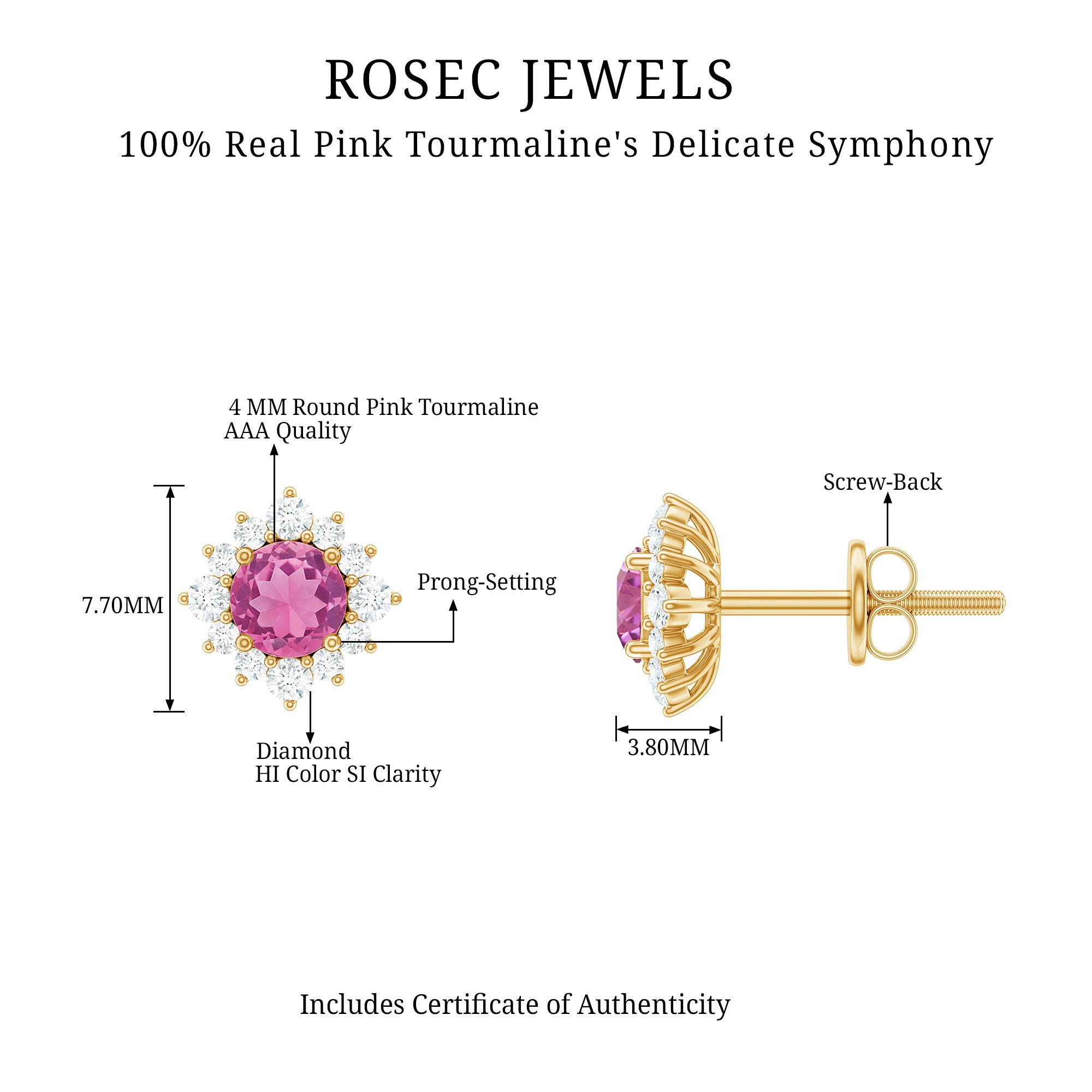 Look as stunning as ever while flaunting this pair of Halo Stud Earrings featuring a Round Shape Pink Tourmaline Gemstone in the center set in prong setting encircled by a Halo of sparkling Round Shape Diamond. The Classic Stud Earrings beautifully crafted in Solid Gold will make you the center of attraction at all your parties.