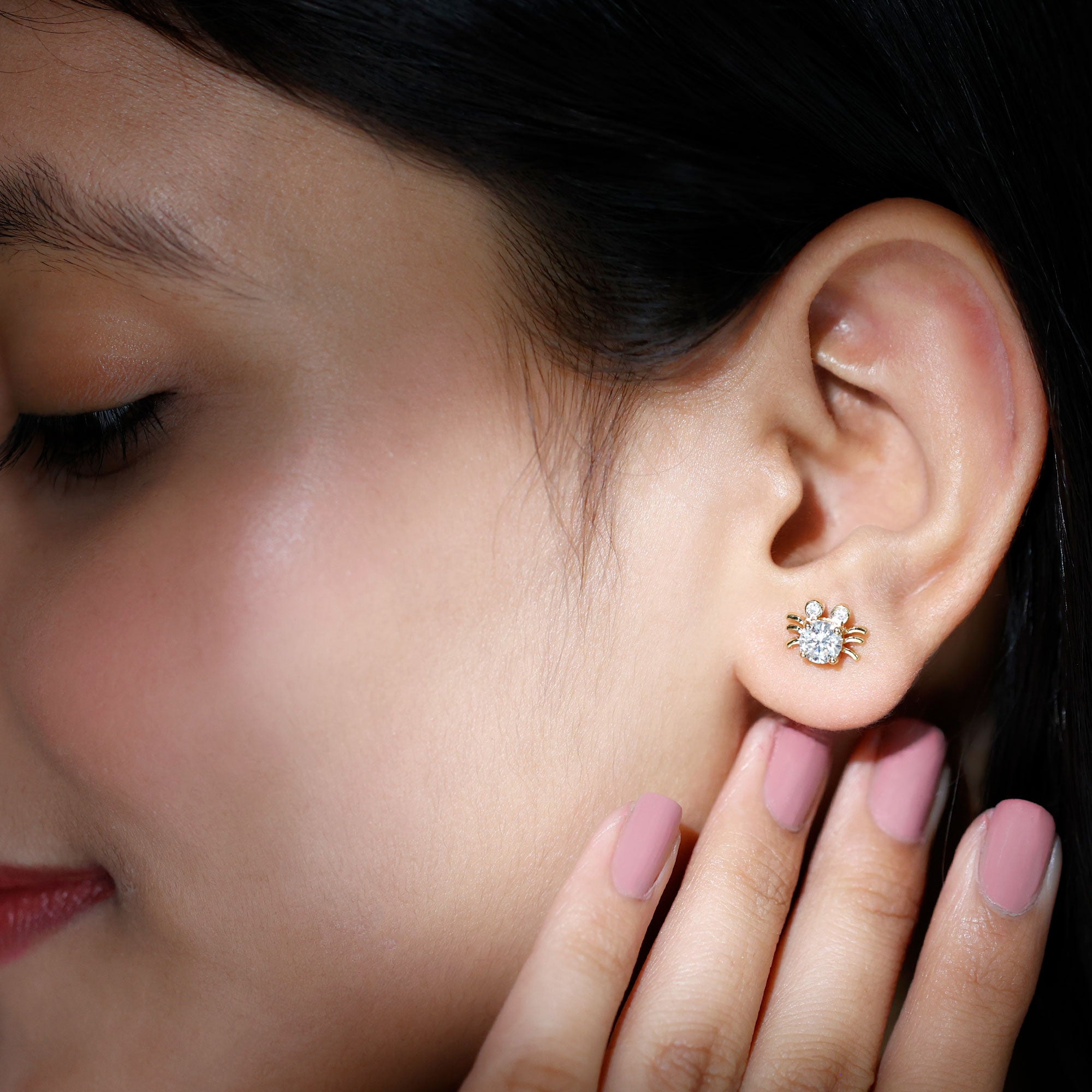 This Cute Crab Stud Earrings are embellished with one Brilliant round shape Moissanite is set at the center in a Prong Setting and two small Brilliant round shape Moissanite are set on the eyes in a Bezel Setting.