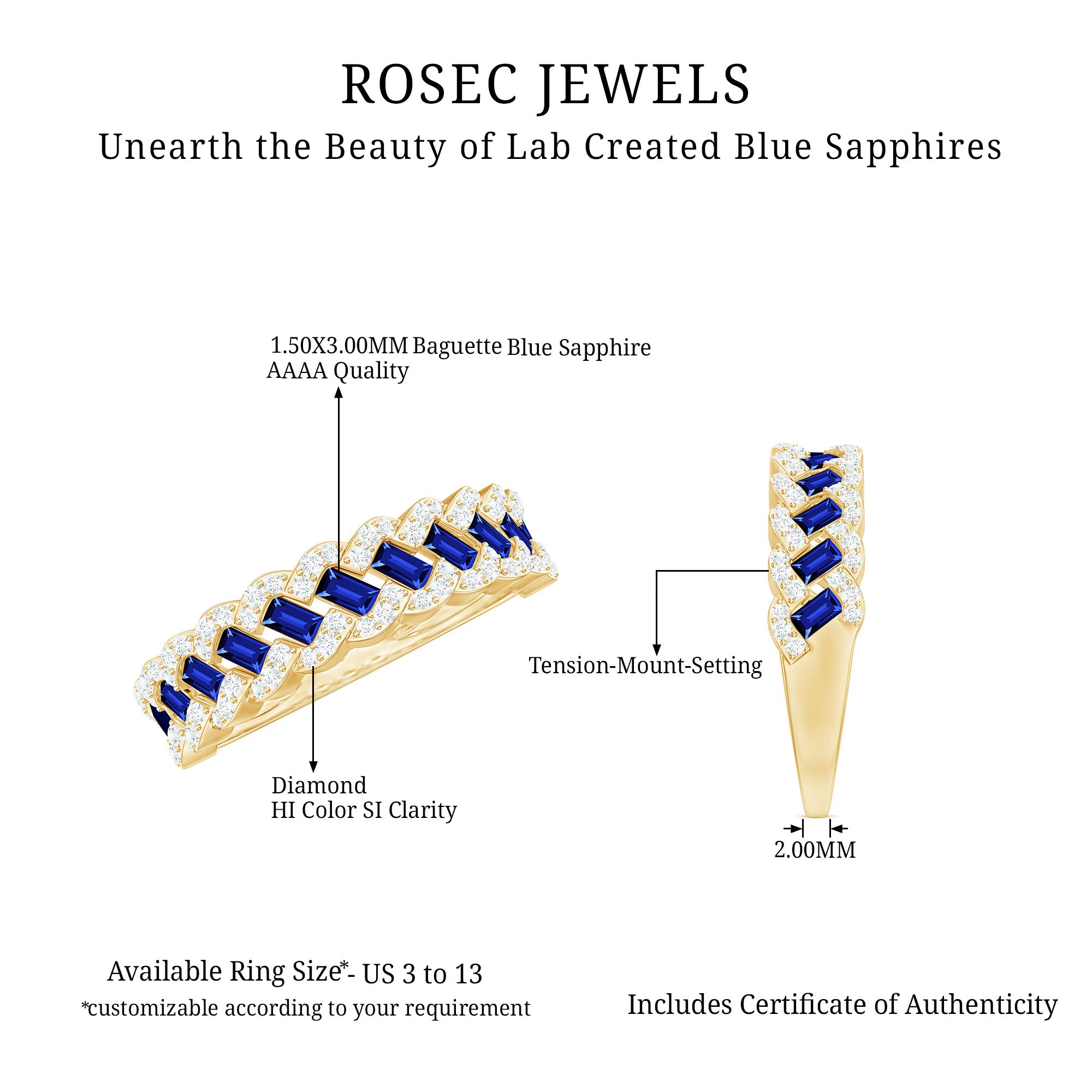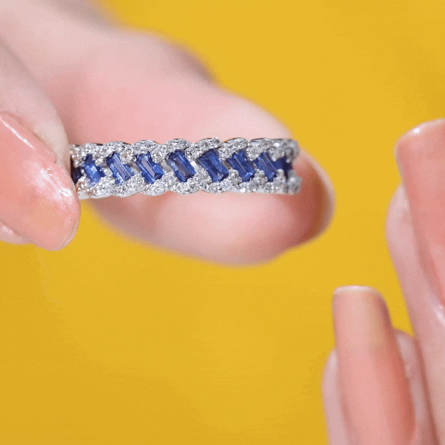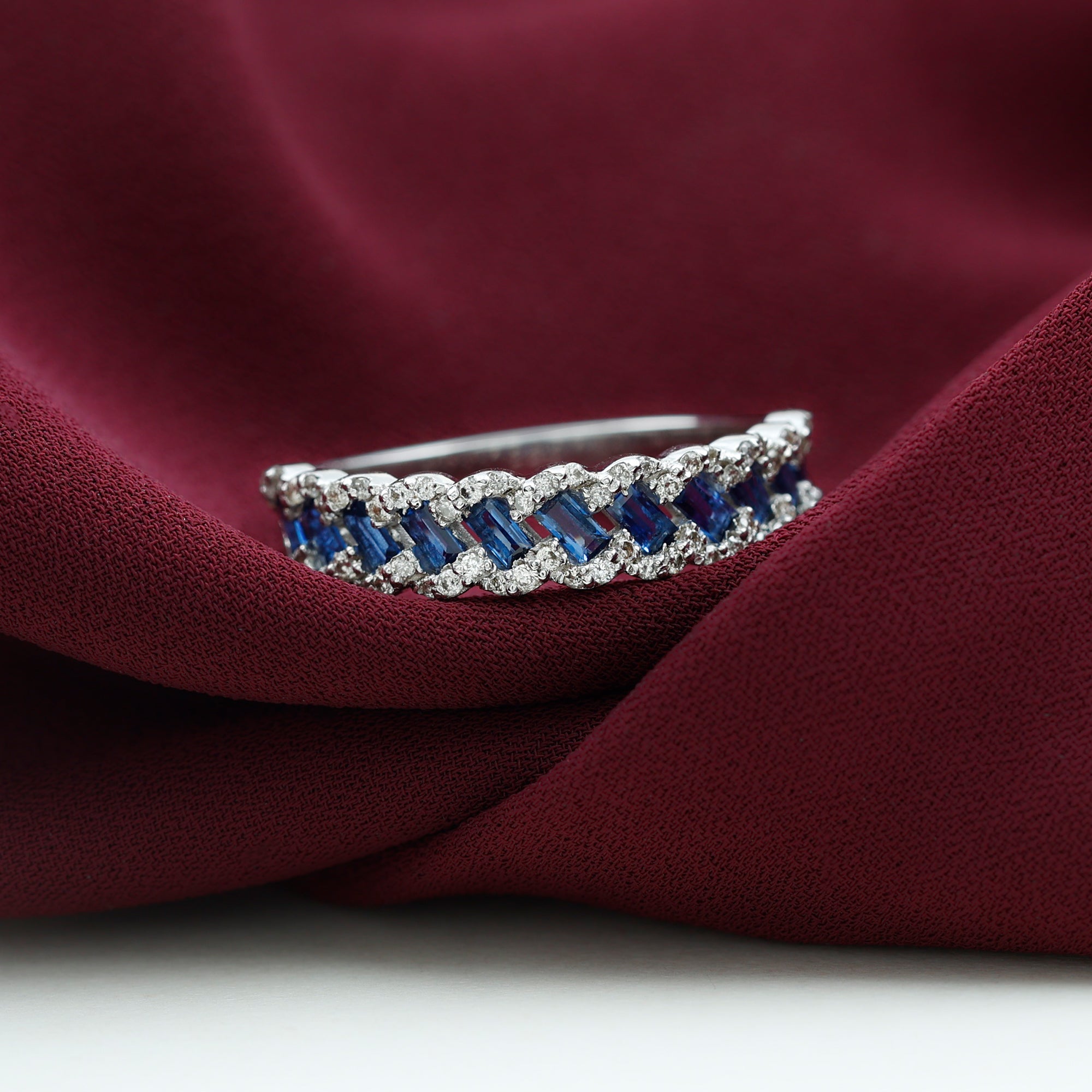 This Braided Band Ring is designed with Baguette Cut Lab Created Blue Sapphires and Round Diamonds in channel and prong setting. This Diamond Wedding Ring is mounted in Solid Gold. Make your bond more strong by presenting this ring as an anniversary gift.
