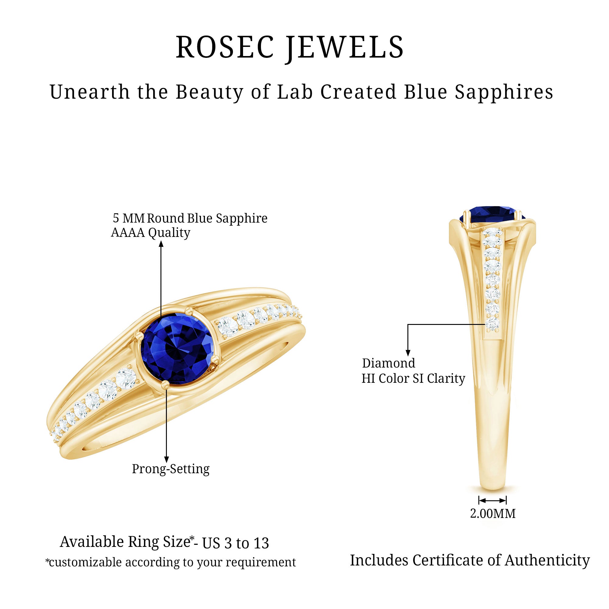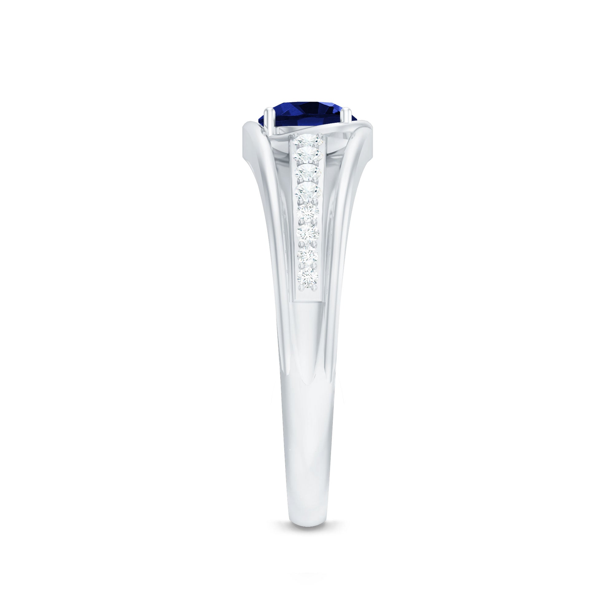 Classic Solitaire Engagement Ring is set with Precious Round Shape Lab Created Blue Sapphire as Solitaire and Diamond in Side Stones in the Prong Setting. It has a Bypass Shank setting with Solid Gold Metal which enhances the charm and beauty of the Ring. Solitaire Split Ring is crafted in Solid Gold. Perfect Engagement Ring for her and surprise your lady with this beautiful ring.