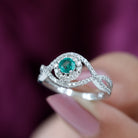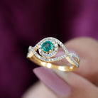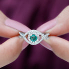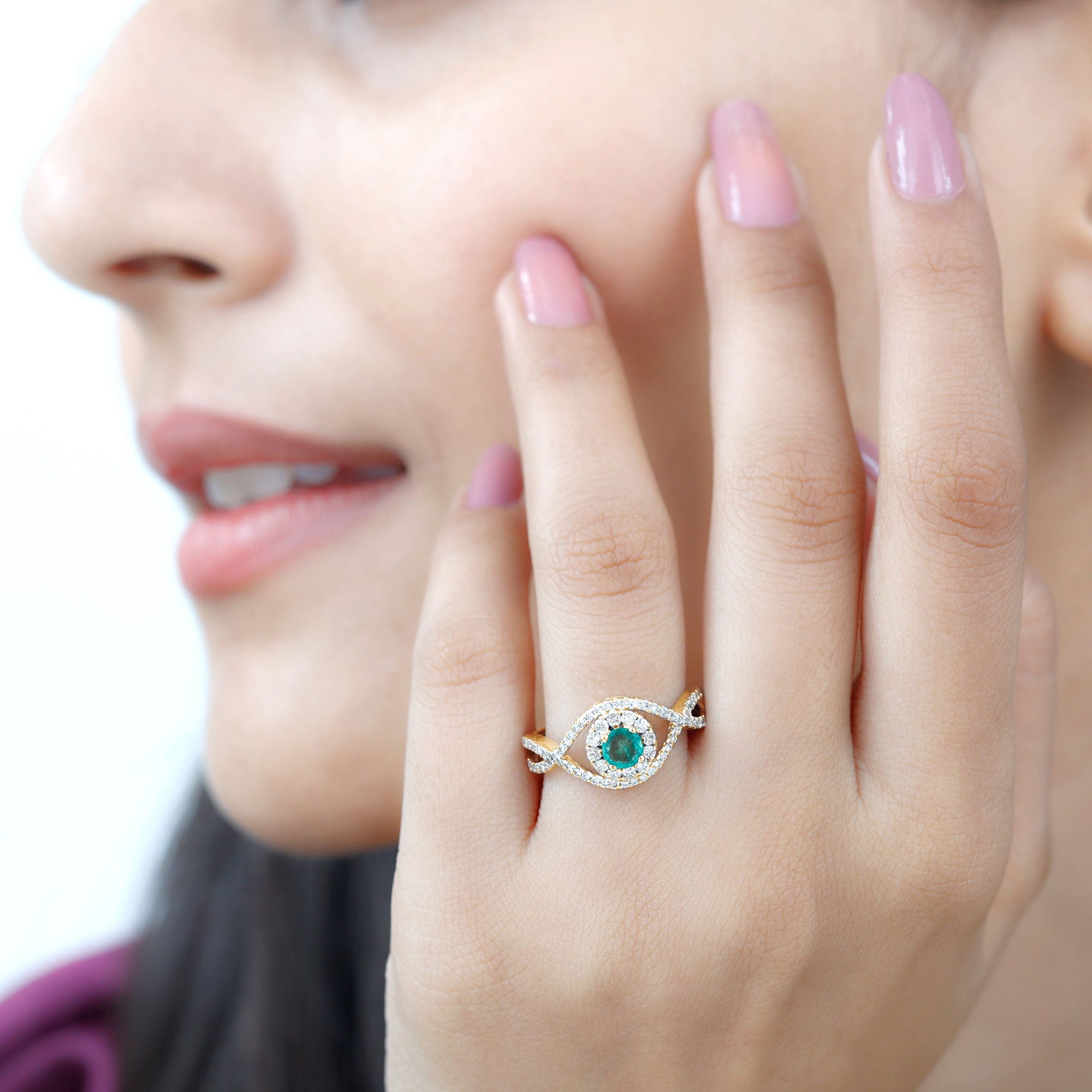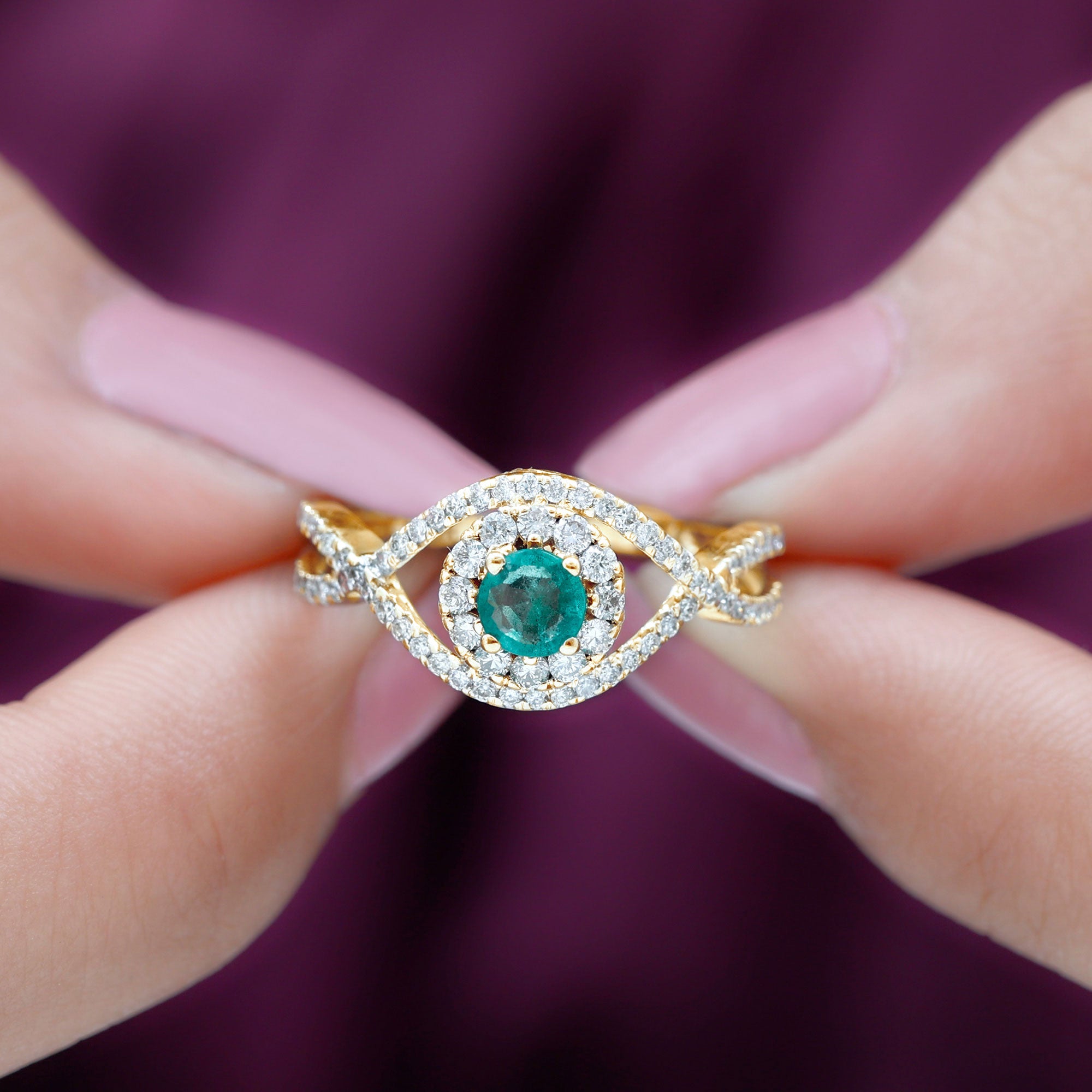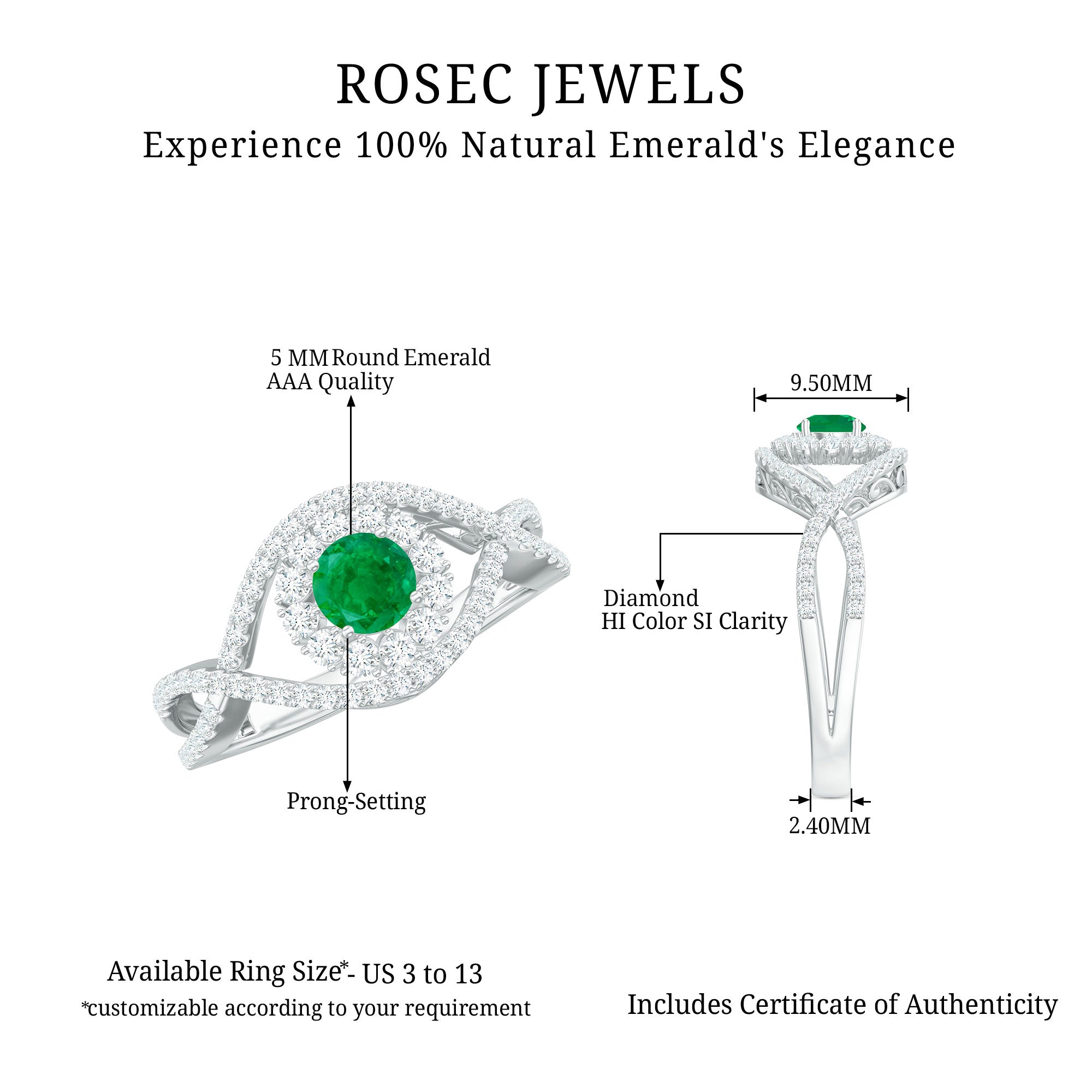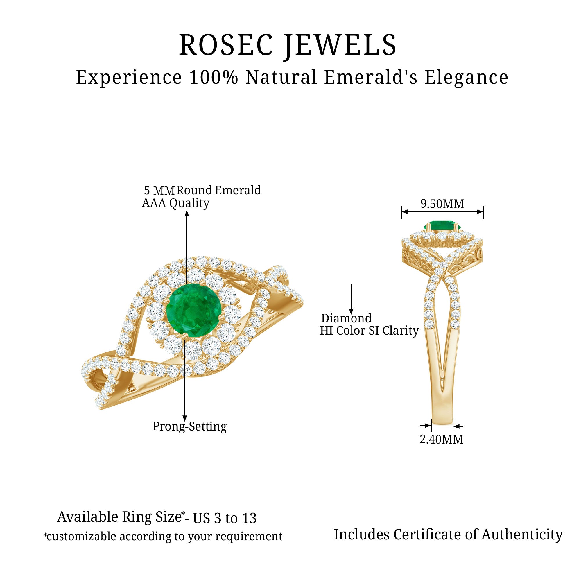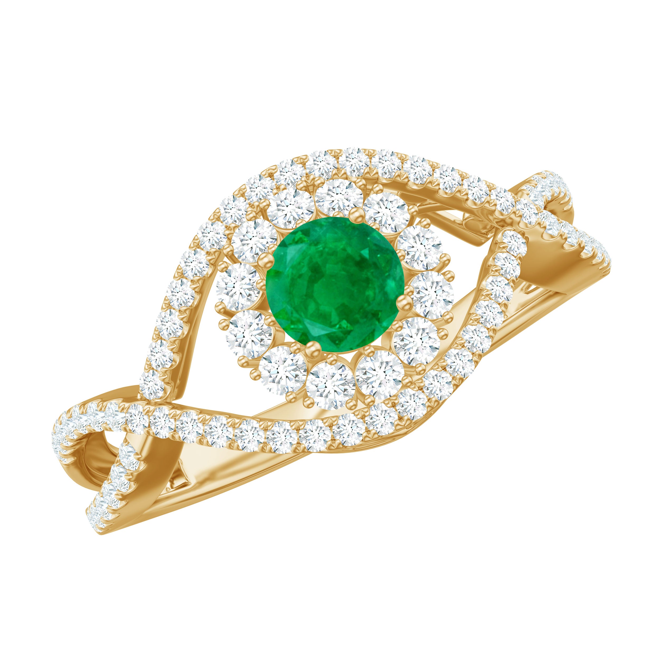 An Eye-Catching Designer Engagement Ring embellished with Round Shape Emerald as Solitaire encircled with Round Shape diamond in the Halo Style and Crossover Shank Filled with diamond as Side Stones. Statement Interlocking Shank Ring is composed of Gold. An adorable gift for any special occasion.