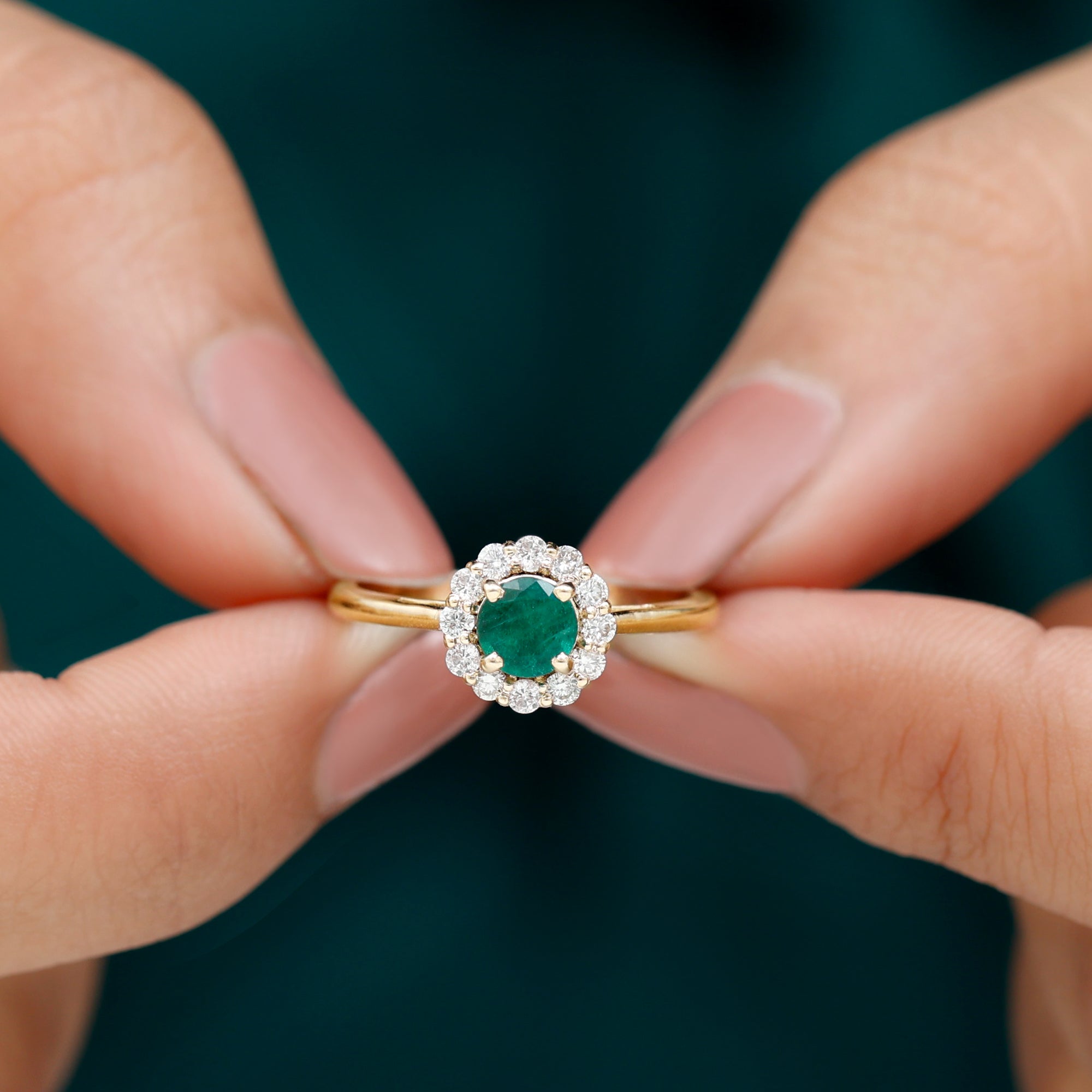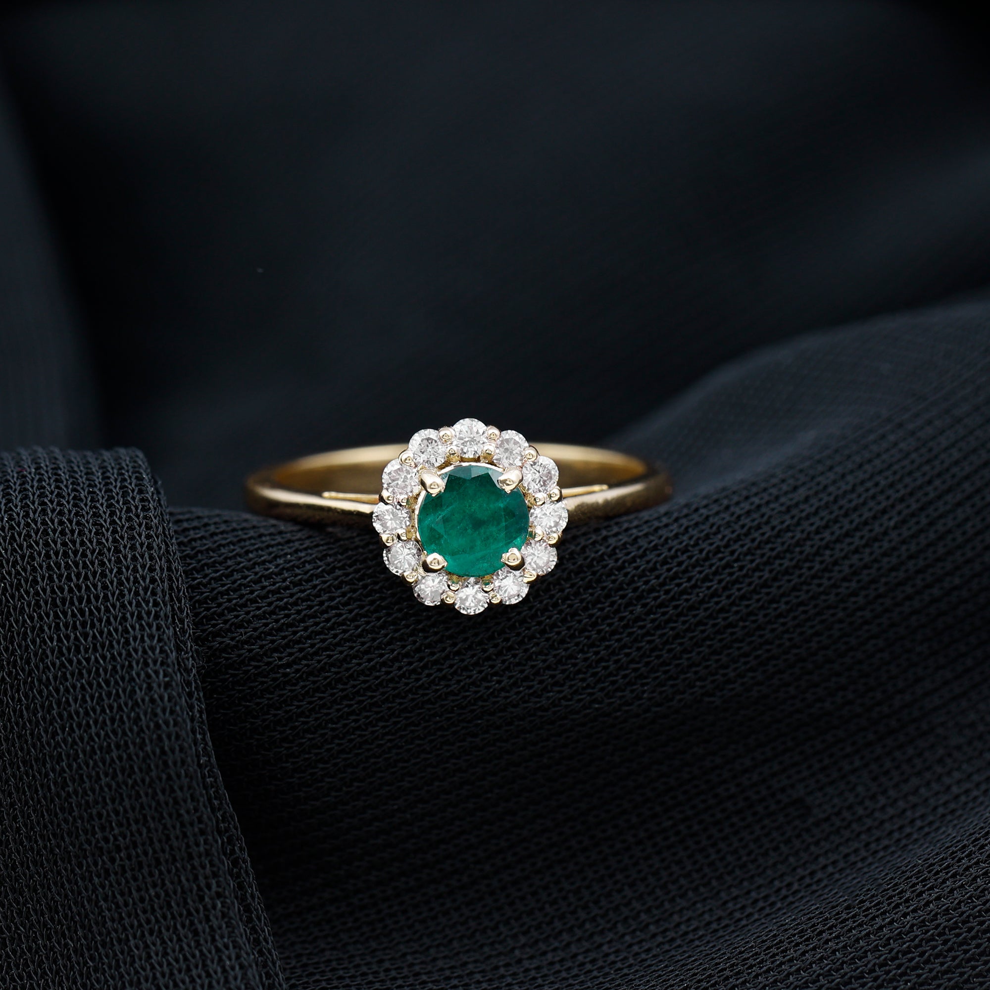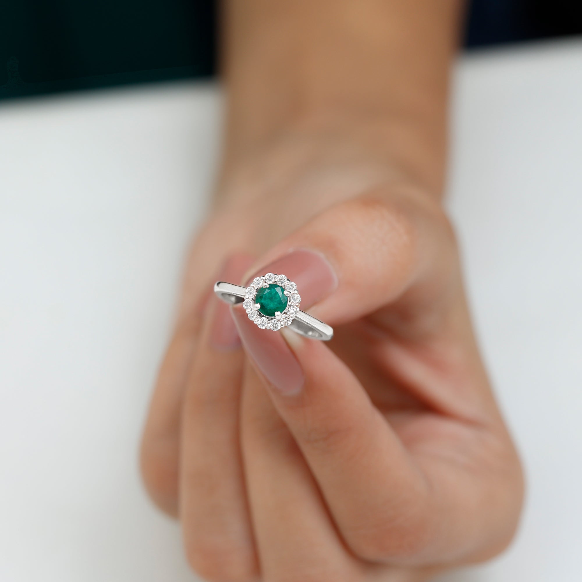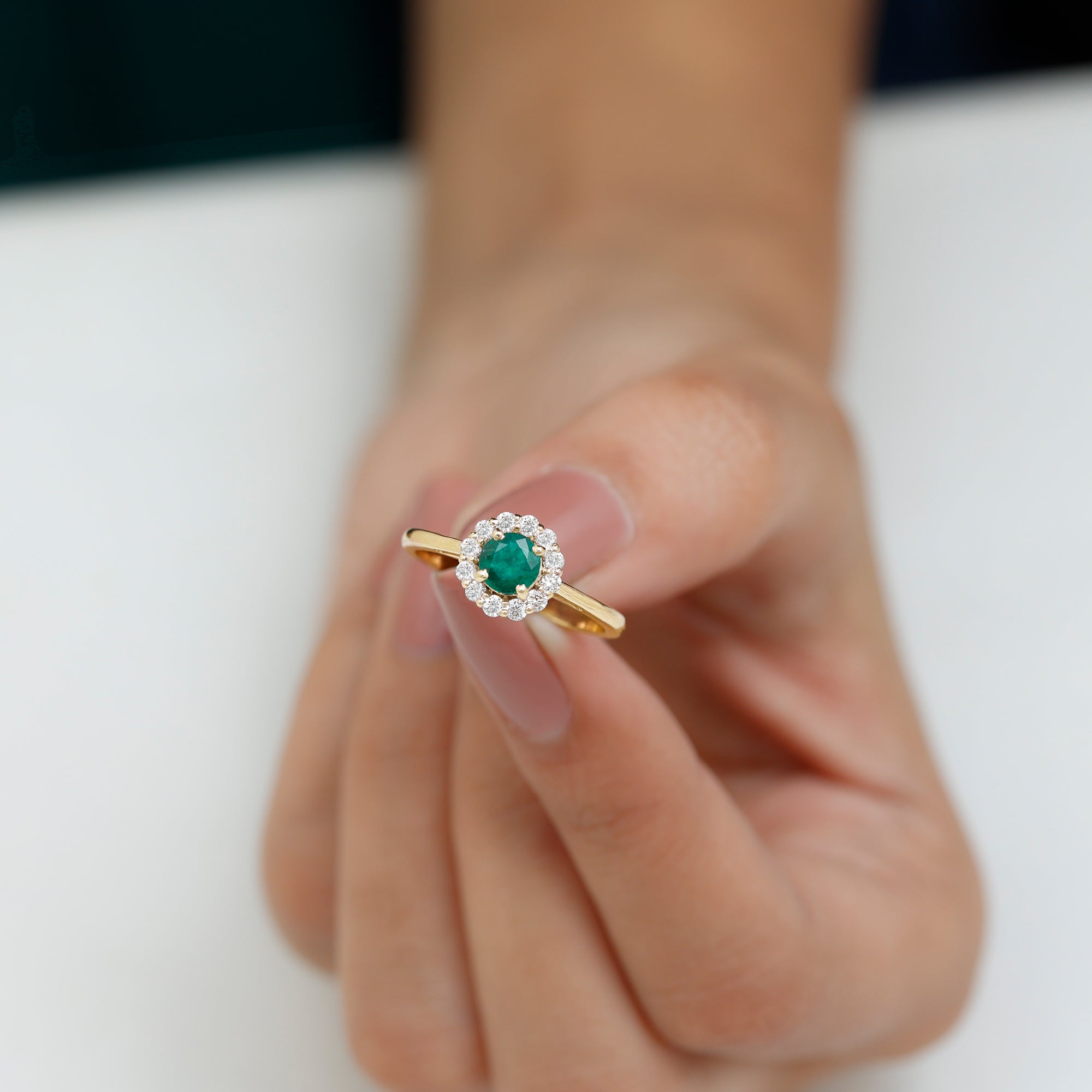 This Emerald Engagement Ring captures the essence of timeless beauty and meaningful elegance. At its center lies a 5 MM round cut emerald, held securely in prong setting. Surrounding the emerald is a delicate halo of sparkling diamonds, designed to catch the light from every angle and add a brilliant glow to the Round Engagement Ring. The combination of the AAA quality real emerald and the dazzling HI-SI quality diamonds creates a stunning contrast that makes the Halo Engagement Ring truly stand out. Each diamond adds a touch of sparkle, enhancing the overall beauty and giving the piece a luxurious yet graceful look. The halo style not only highlights the emerald as the star of the ring but also provides added security and durability, making it suitable for daily wear or special occasions. Crafted with care and precision, this Emerald and Diamond Ring balances elegance with comfort, ensuring it feels as good as it looks. Its thoughtful design reflects both style and sentiment, perfect for someone who wants a meaningful symbol of love and commitment. Presented in a beautiful jewelry box, this Round Emerald Ring is ready to become a treasured keepsake. It holds the promise of lasting memories, deep emotions, and endless sparkle, making it a wonderful choice for marking life’s most special moments.