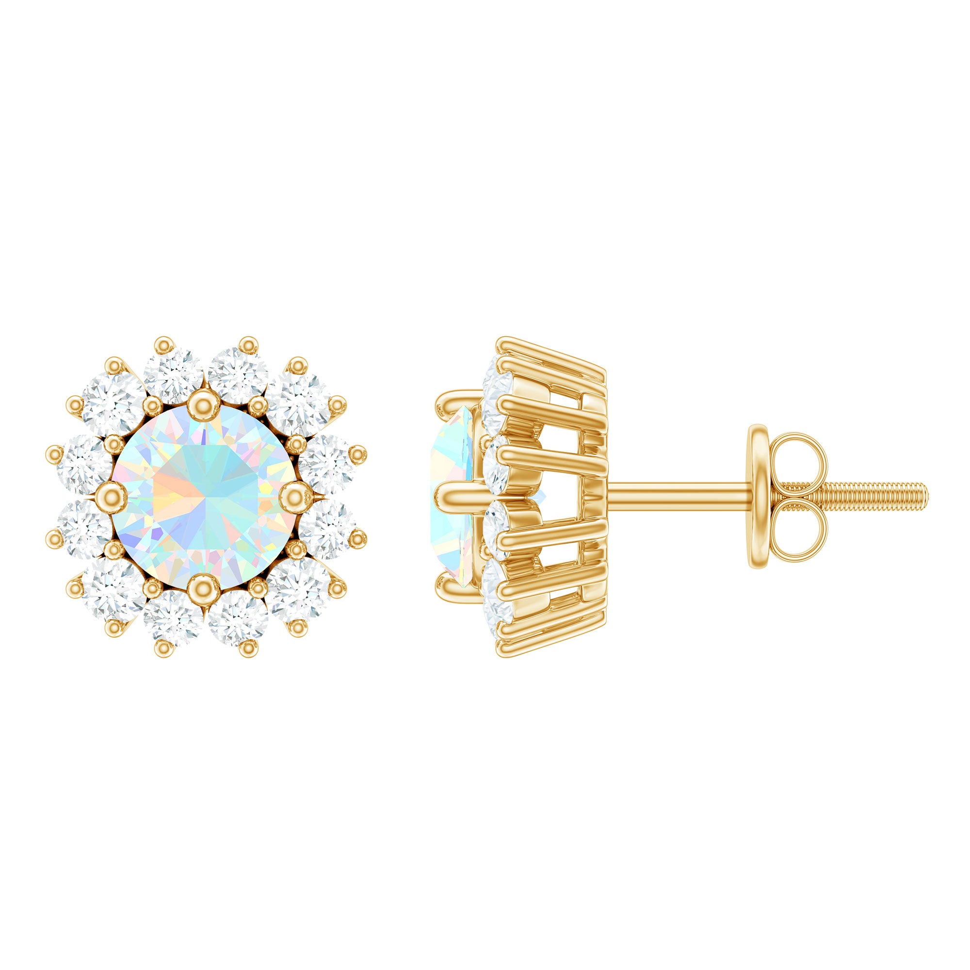 A Celebration without Gifts is Incomplete, a Gift of Jewelry will bring smiles of delight on Mothers Day. Explore these Stud Earrings adorned with Round Shape Ethiopian Opal in Prong Setting with Halo Diamond, crafted in Solid Gold Metal.