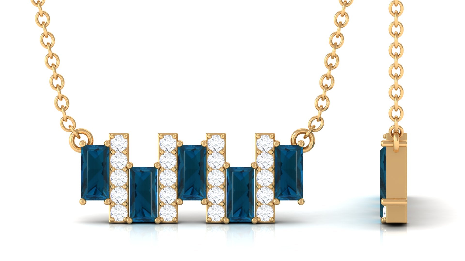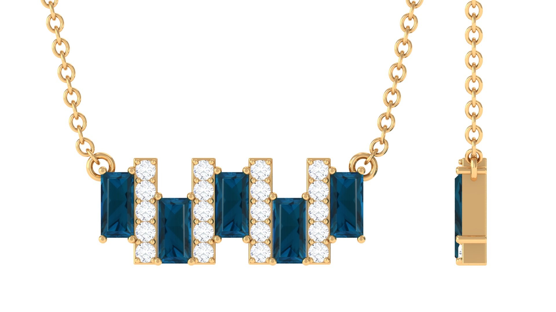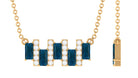 Create room in your jewelry collection and heart for this stunning London Blue Topaz Bar Necklace. Featuring a series of baguette-cut London Blue Topaz stones arranged in the form of bars, accentuated with round Diamond gemstones set in solid gold bars, this necklace is truly enchanting. Let this bewitching bar necklace capture your heart and add a touch of elegance to any outfit.