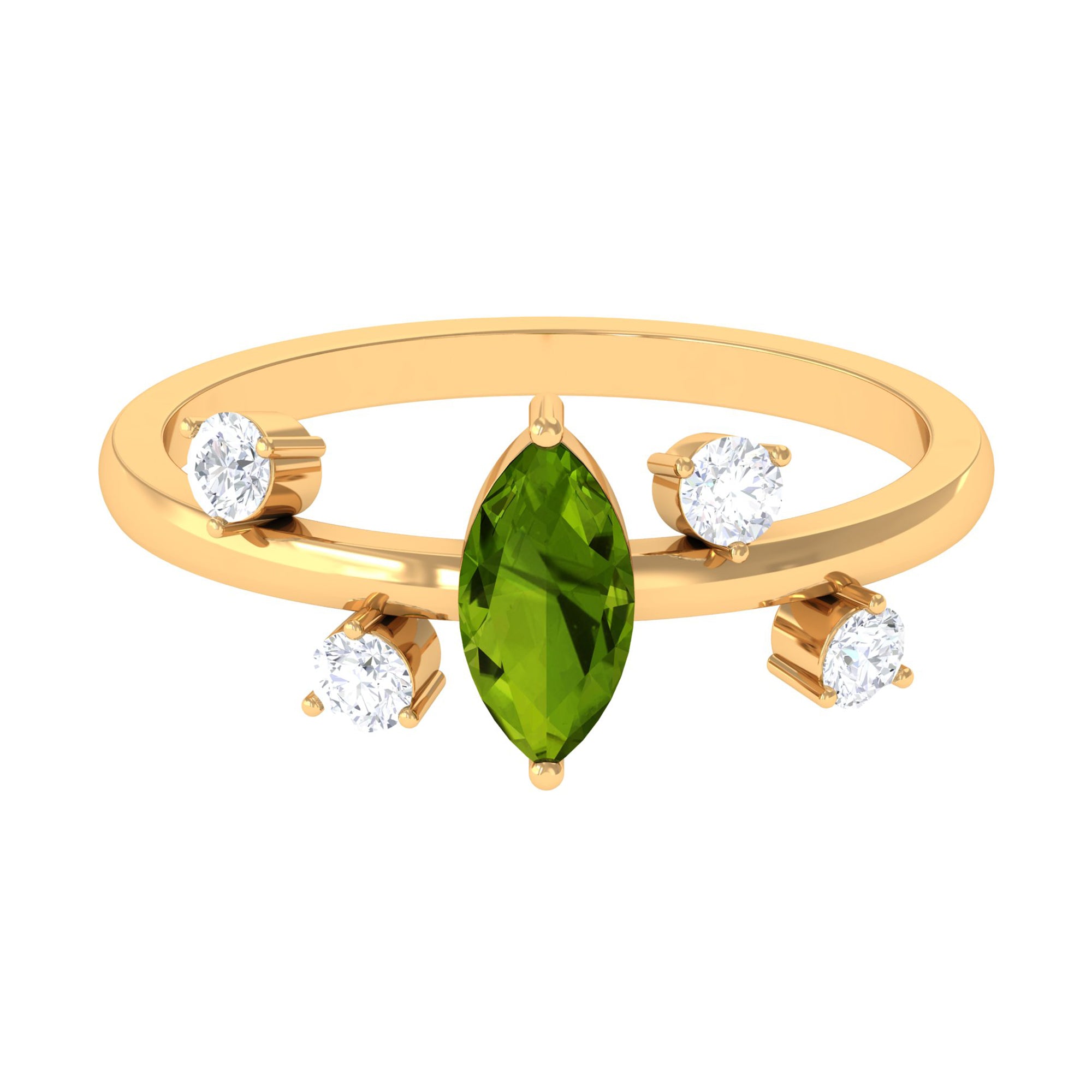 Get this alluring Scatter Ring embellished with Marquise Cut Peridot set as a Solitaire in Prong Setting with Round Shape Diamond Stones. This Peridot and Diamond Ring is crafted with Gold for a luxurious look. This Peridot Stone Ring will bring you out from the crowd.