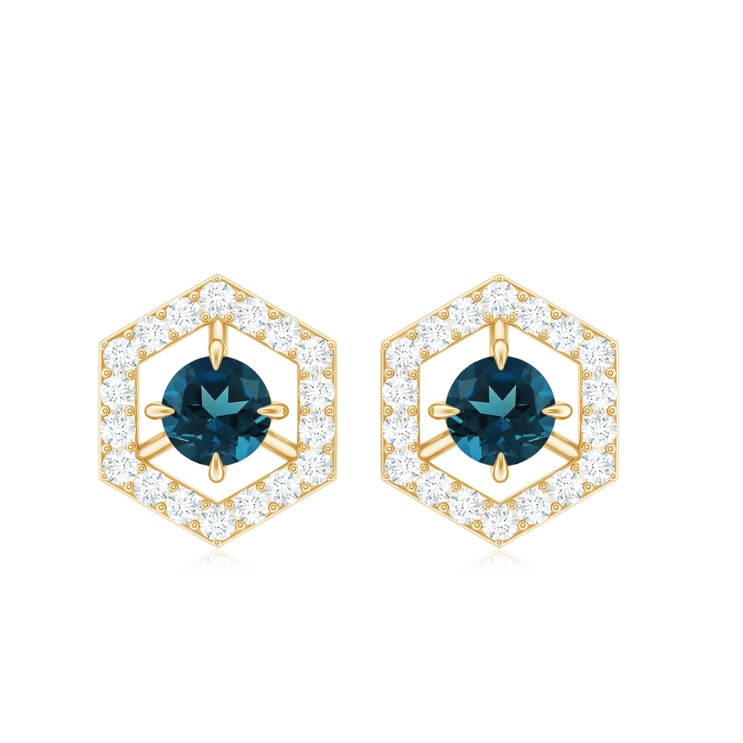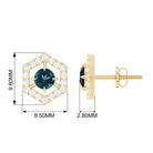 Feel unique with these Geometric Stud Earrings, adorned with Round Shape London Blue Topaz Gemstone set as a center stone with Diamond Accent. These Minimal Stud Earrings are crafted in Solid Gold