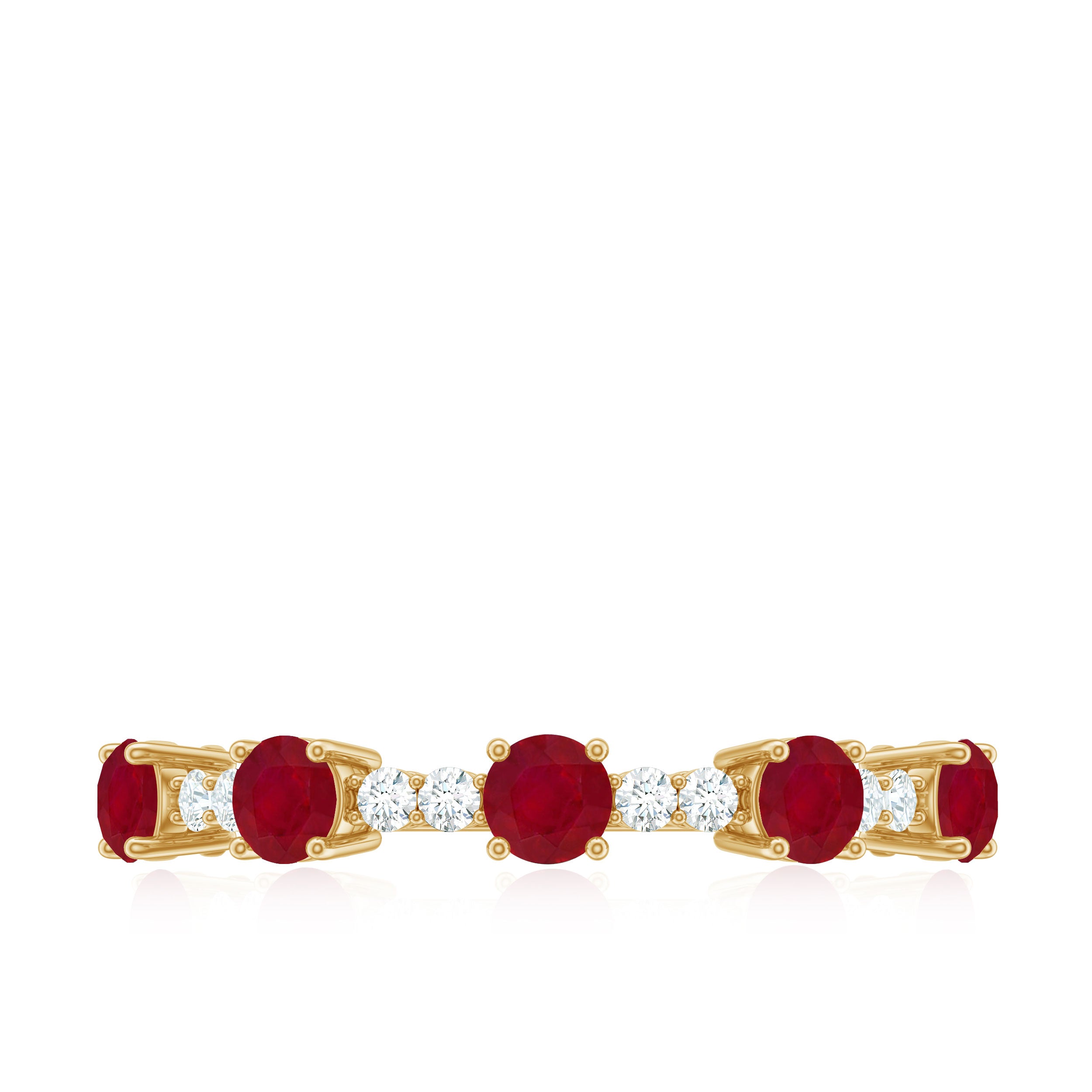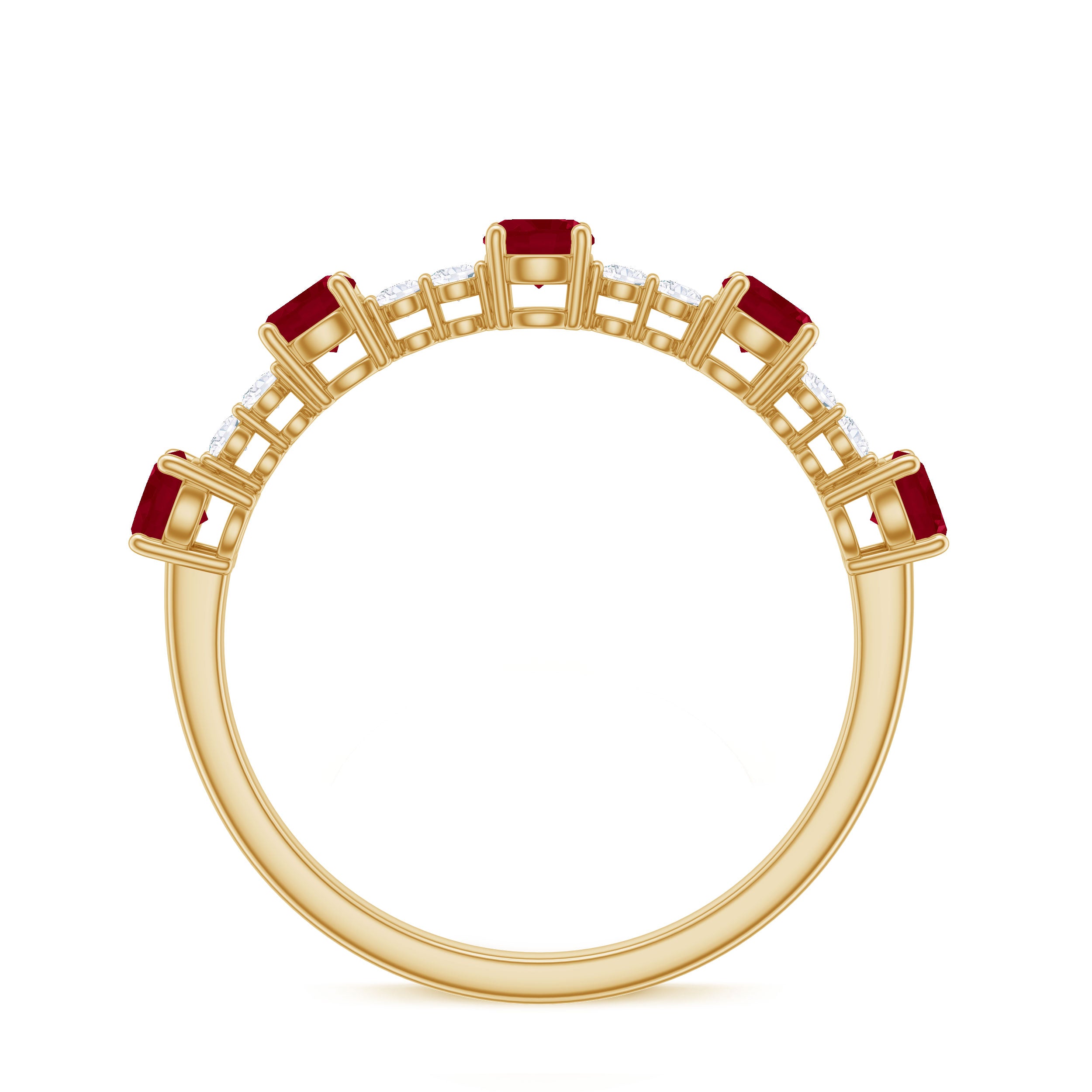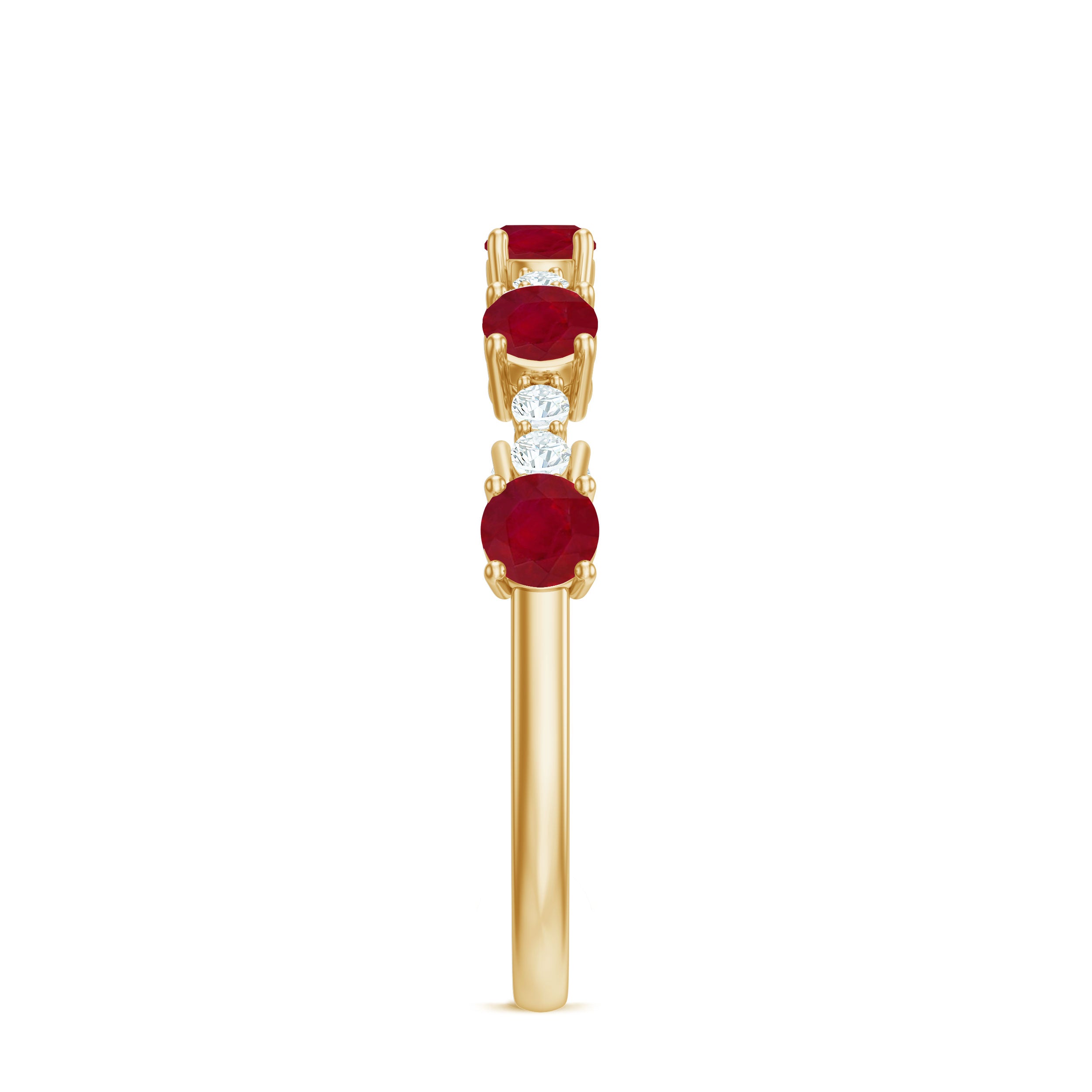 The alternating pattern of Round Shape Ruby and Diamond Gemstones in a Prong Setting on this Stackable Ring is simply stunning. This Minimal Ruby Ring makes for the perfect Valentines Day gift.