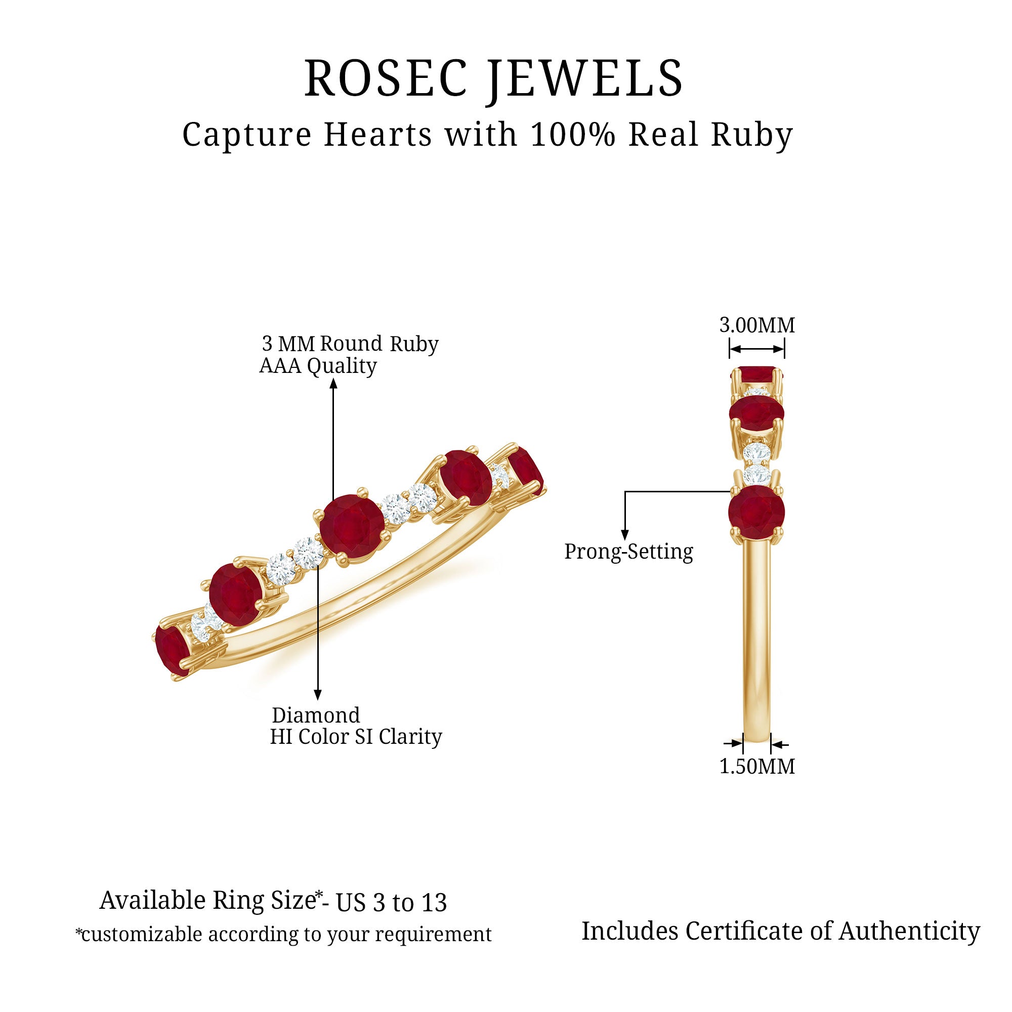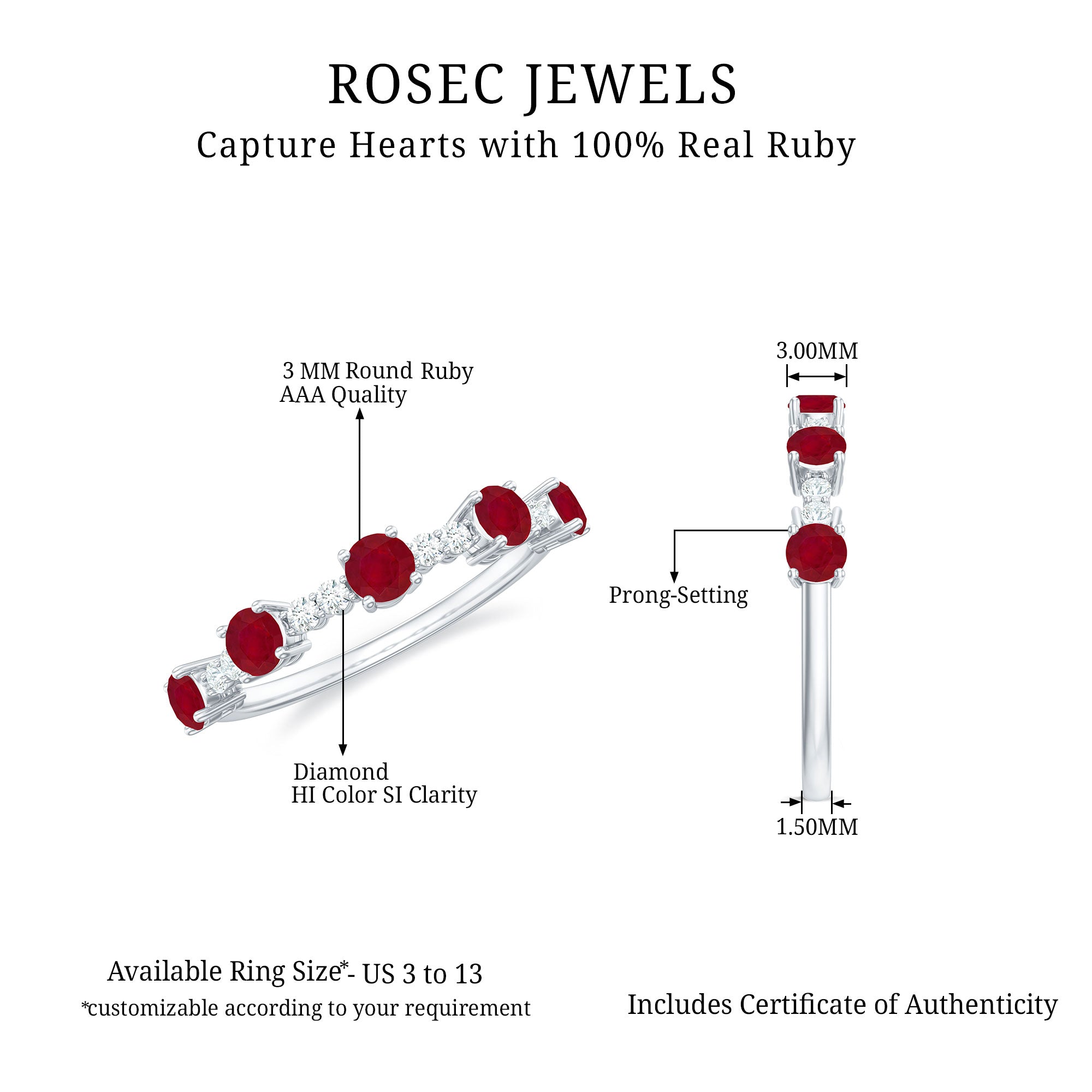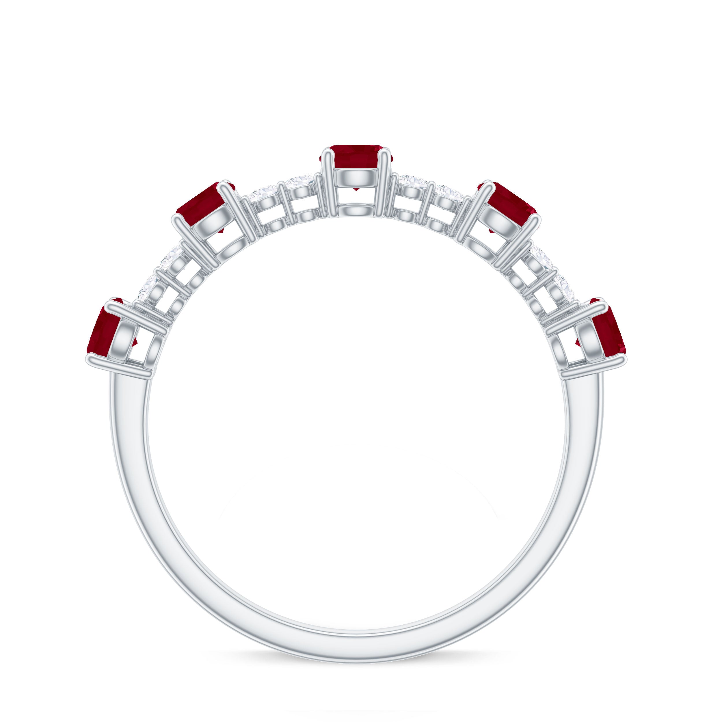 The alternating pattern of Round Shape Ruby and Diamond Gemstones in a Prong Setting on this Stackable Ring is simply stunning. This Minimal Ruby Ring makes for the perfect Valentines Day gift.