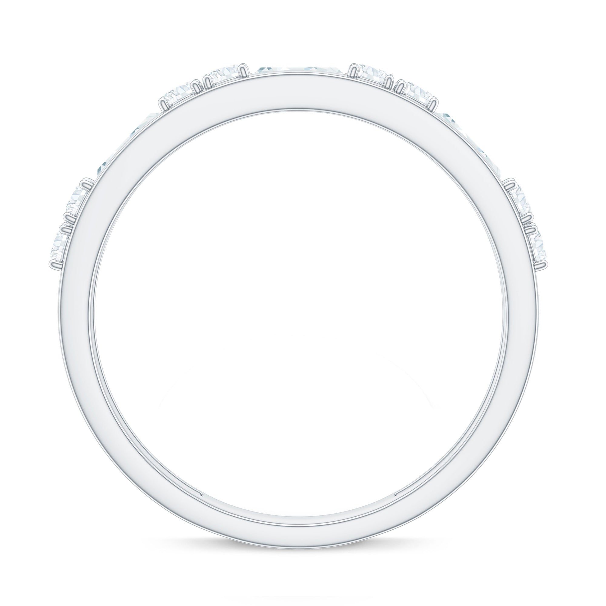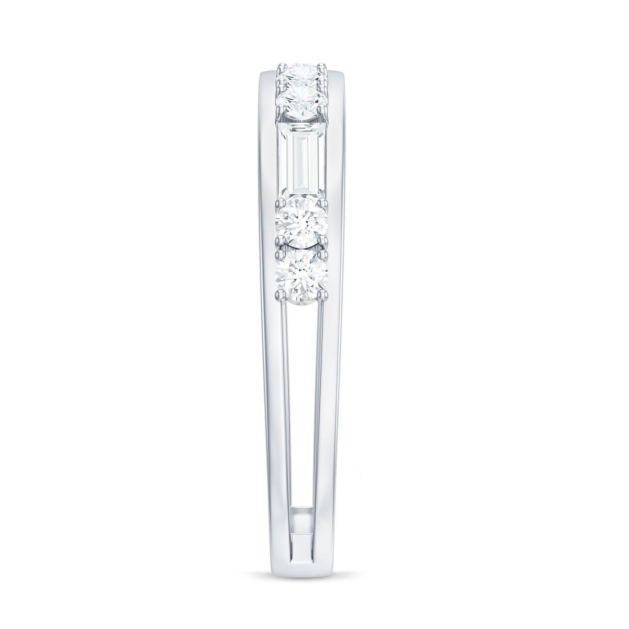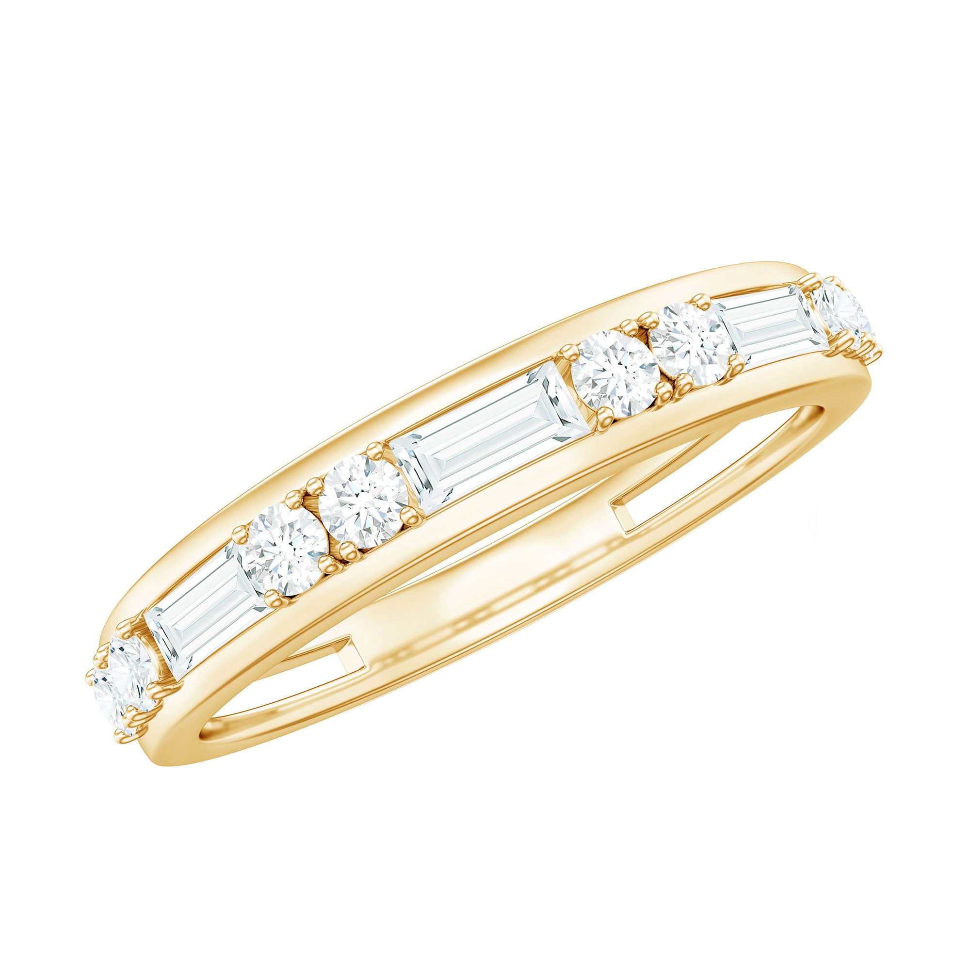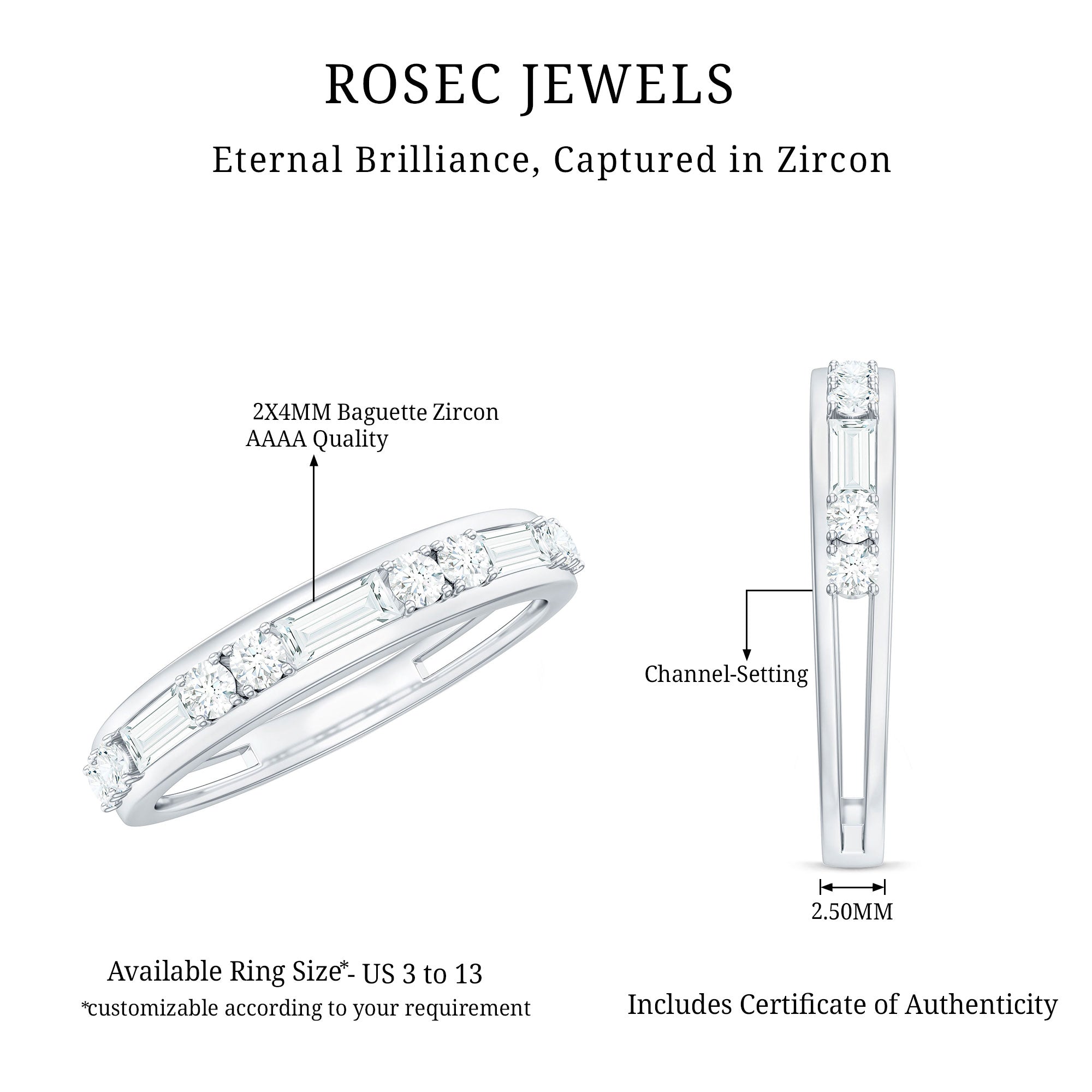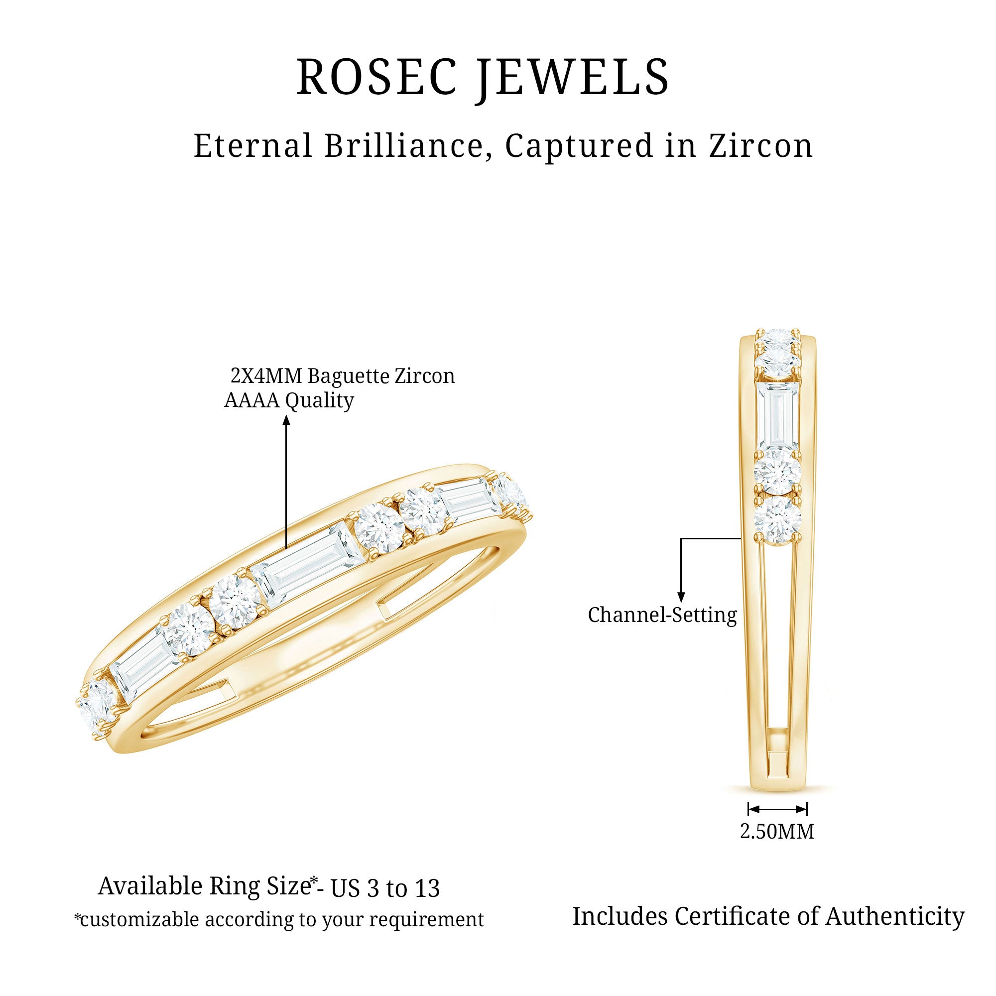 The Minimal Half Eternity Band Ring is a delicate and understated piece of jewelry featuring a half row of sparkling Baguette and Round Shape Zircon stones set in Channel Setting. This minimalist style is perfect for everyday wear and adds a touch of subtle sophistication to any outfit.
