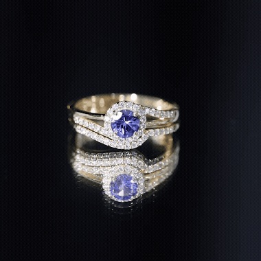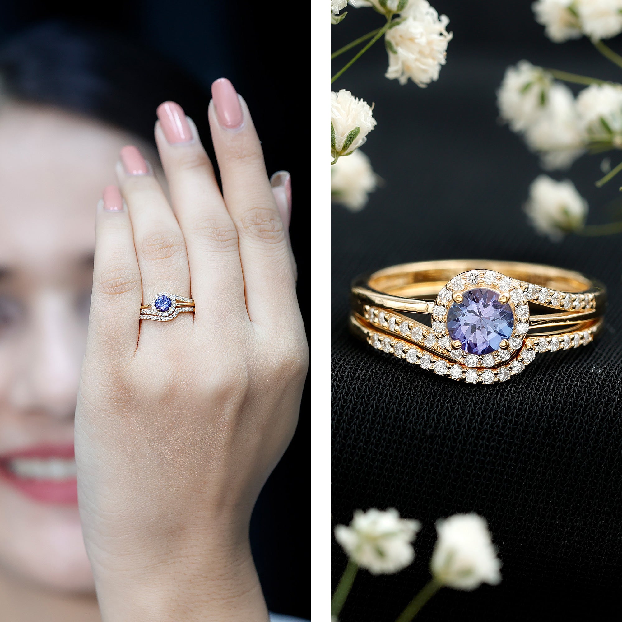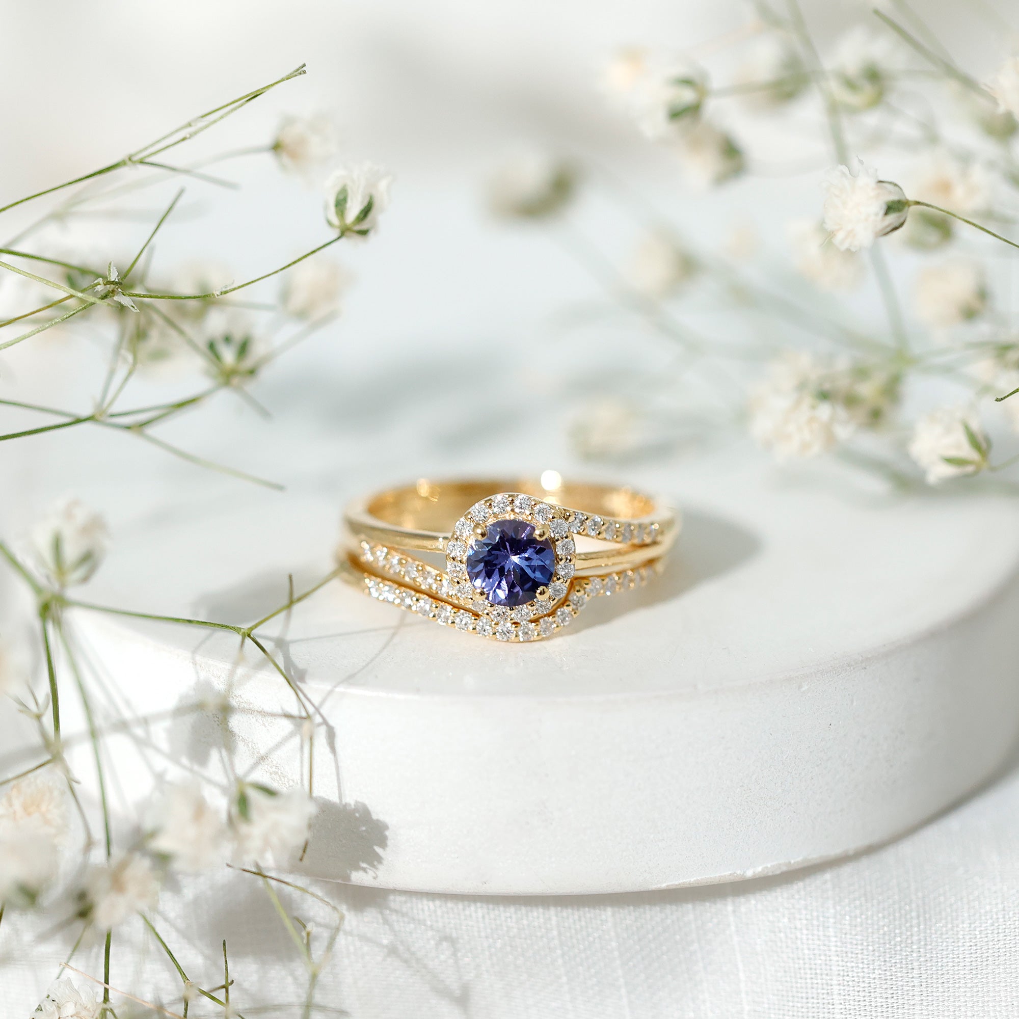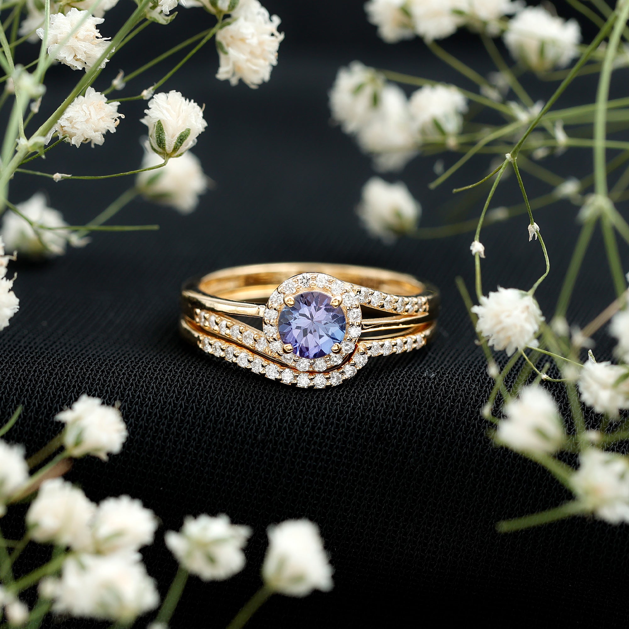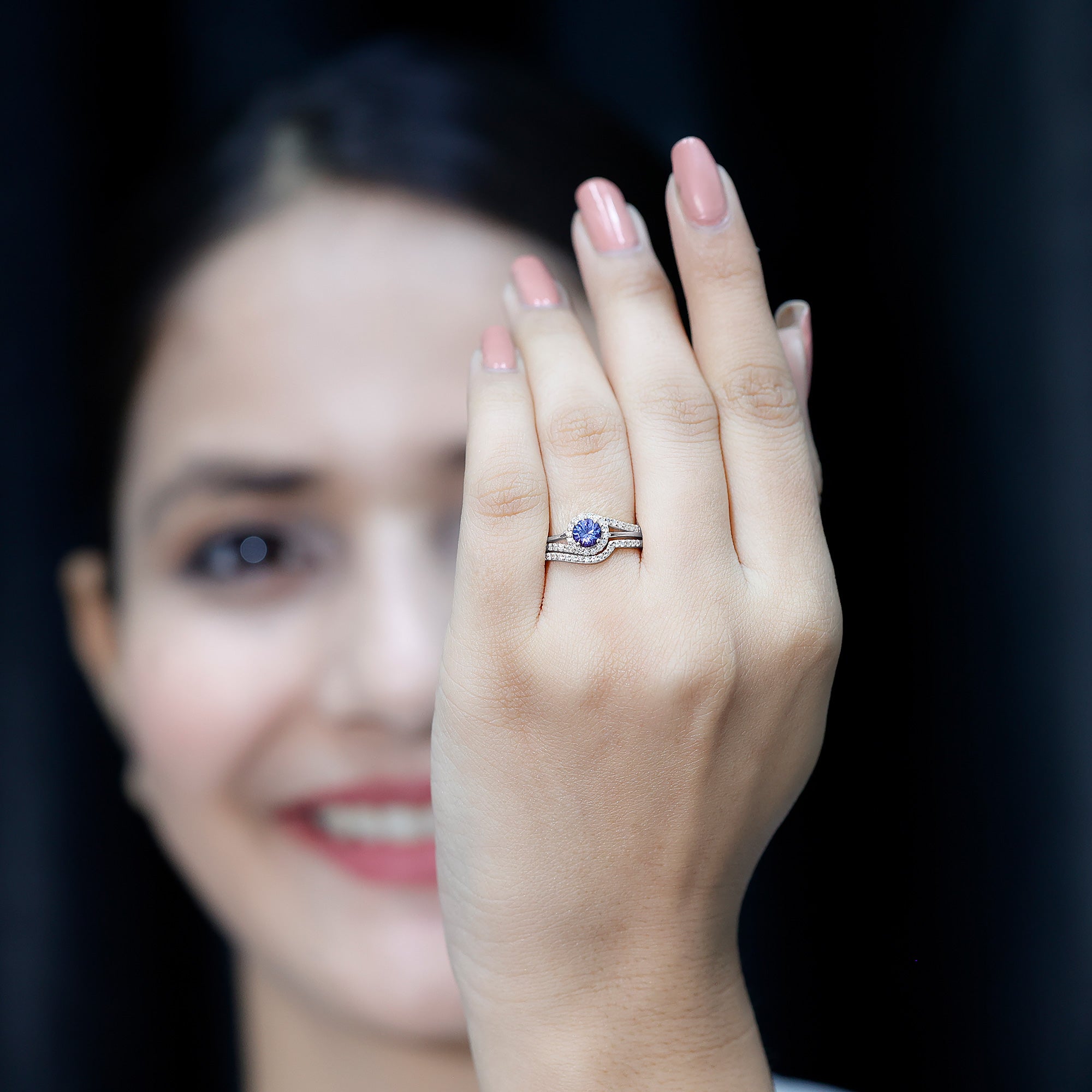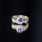 This Engagement Ring with Enhancer is embellished with Round Shape Tanzanite is set at the center encircled with Round Shape Diamond and more Diamond are set on the split shank and Enhancer Ring is encased with Round Shape Diamond, crafted in a Solid Gold.