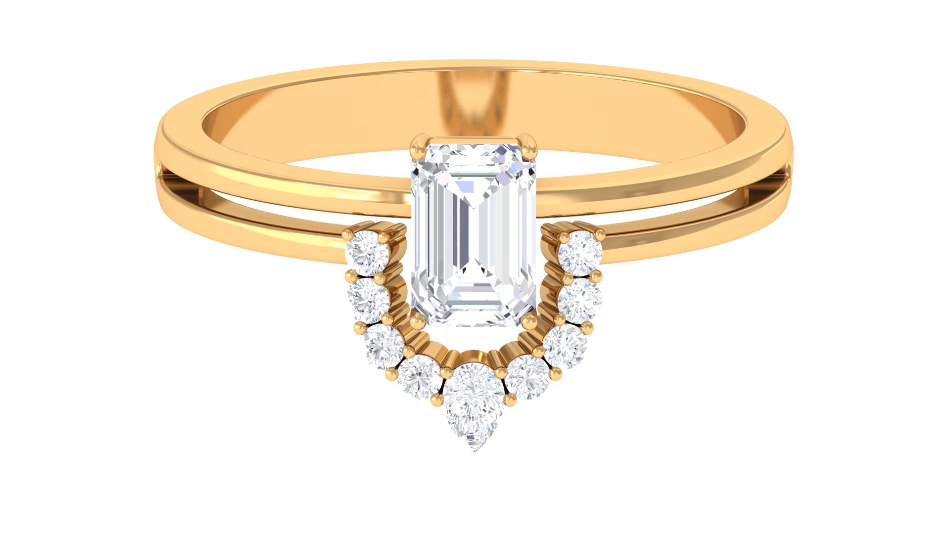 Featuring an elegant Cubic Zirconia Engagement Ring adorned with octagon cut zircon set at the center of the ring with double band shank type in Prong Setting and round and pear cut zircon accent creates an appealing look. This CZ Solitaire Engagement Ring is crafted in Gold for an eye catching and appealing look.