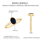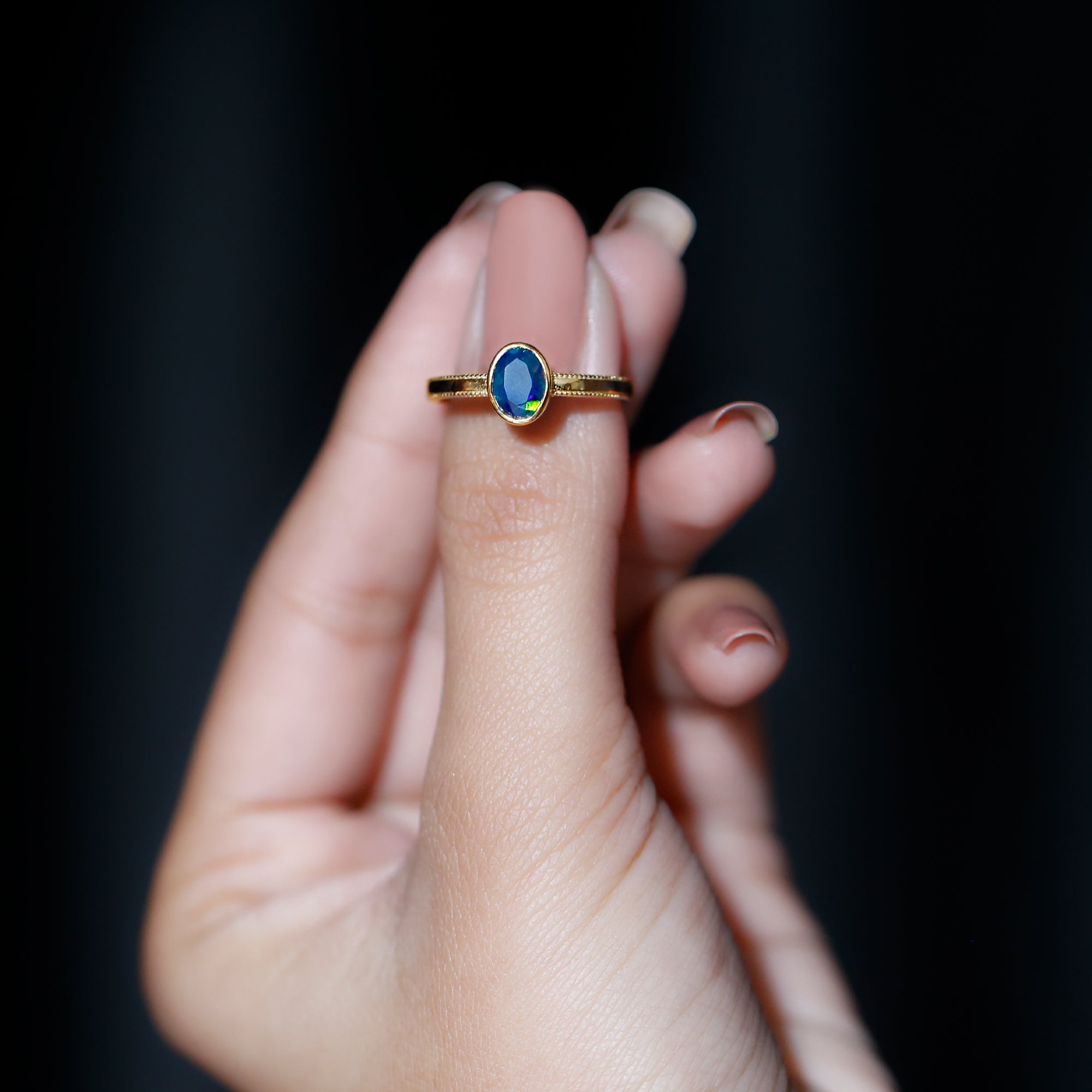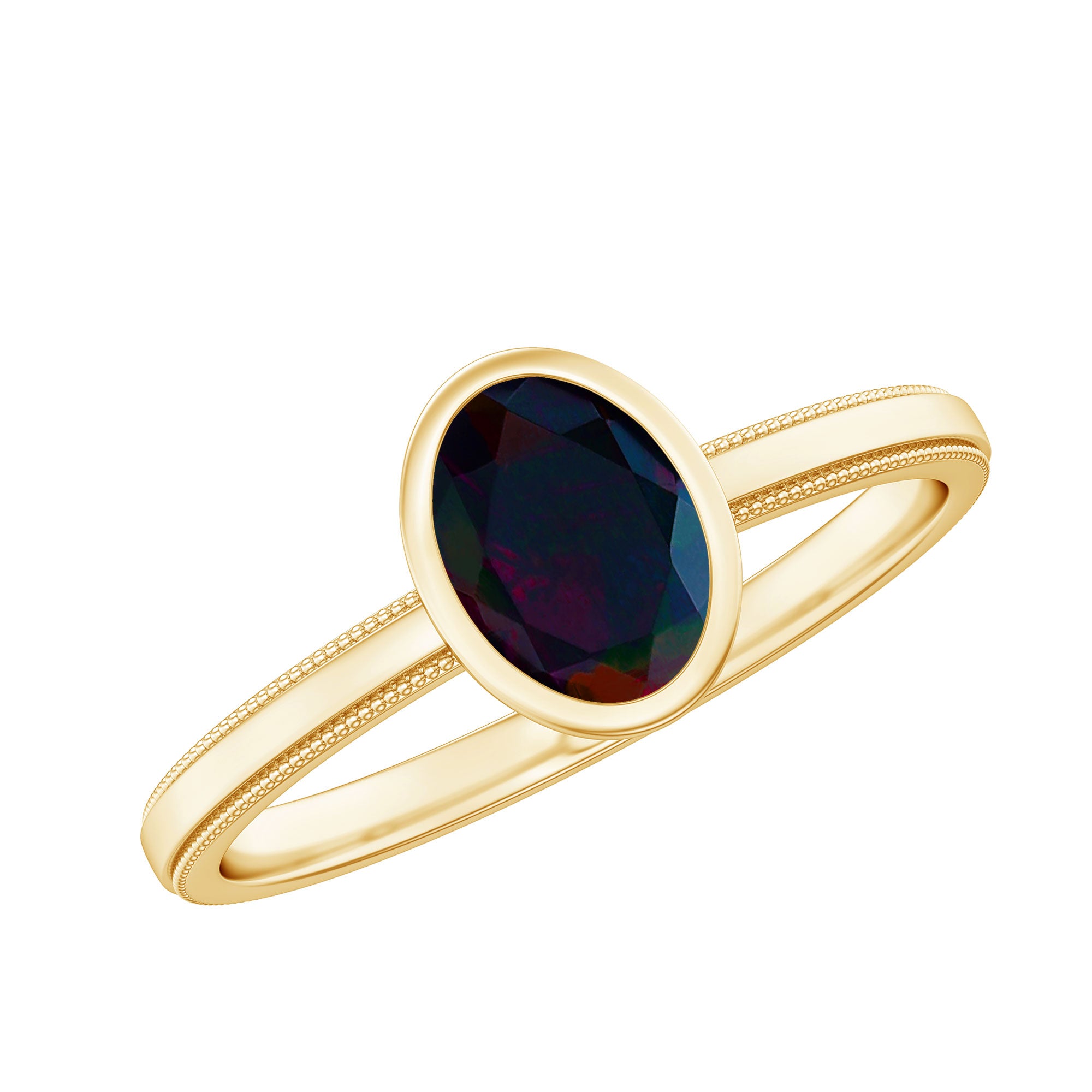 Make a bright and beautiful statement donning a Solitaire Engagement Ring embellished with Oval Shape Black Opal in Bezel Setting. Have been crafted in Beaded Gold Shank, this Black Opal Solitaire Ring for Women goes paired up with any attire. Prefect for someone born in October as Birthstone Ring.