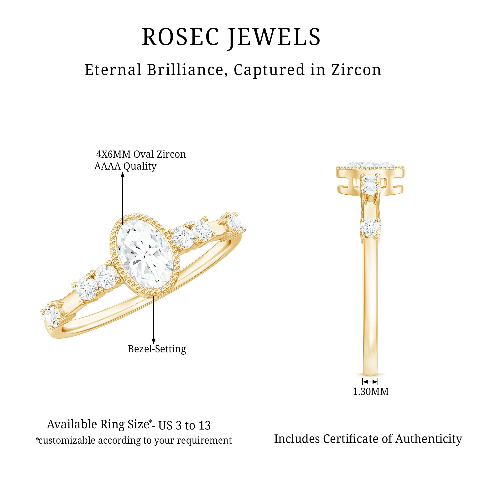 A striking symbol of your everlasting love, this gorgeous Cubic Zirconia Engagement Ring features a 4X6 MM Oval Shape Zircon set as a solitaire in beaded bezel setting with round shape cubic zirconia set as side stones for an appealing look. Pledge your love and affection to your partner by presenting this ultimate Solitaire CZ Engagement Ring.