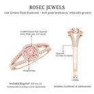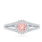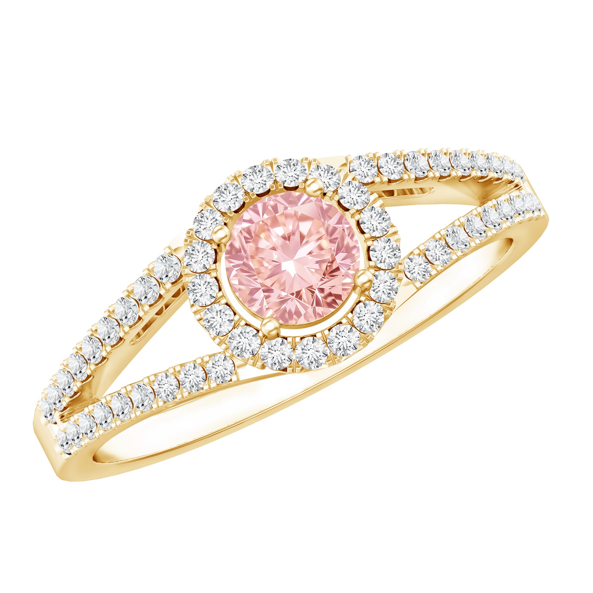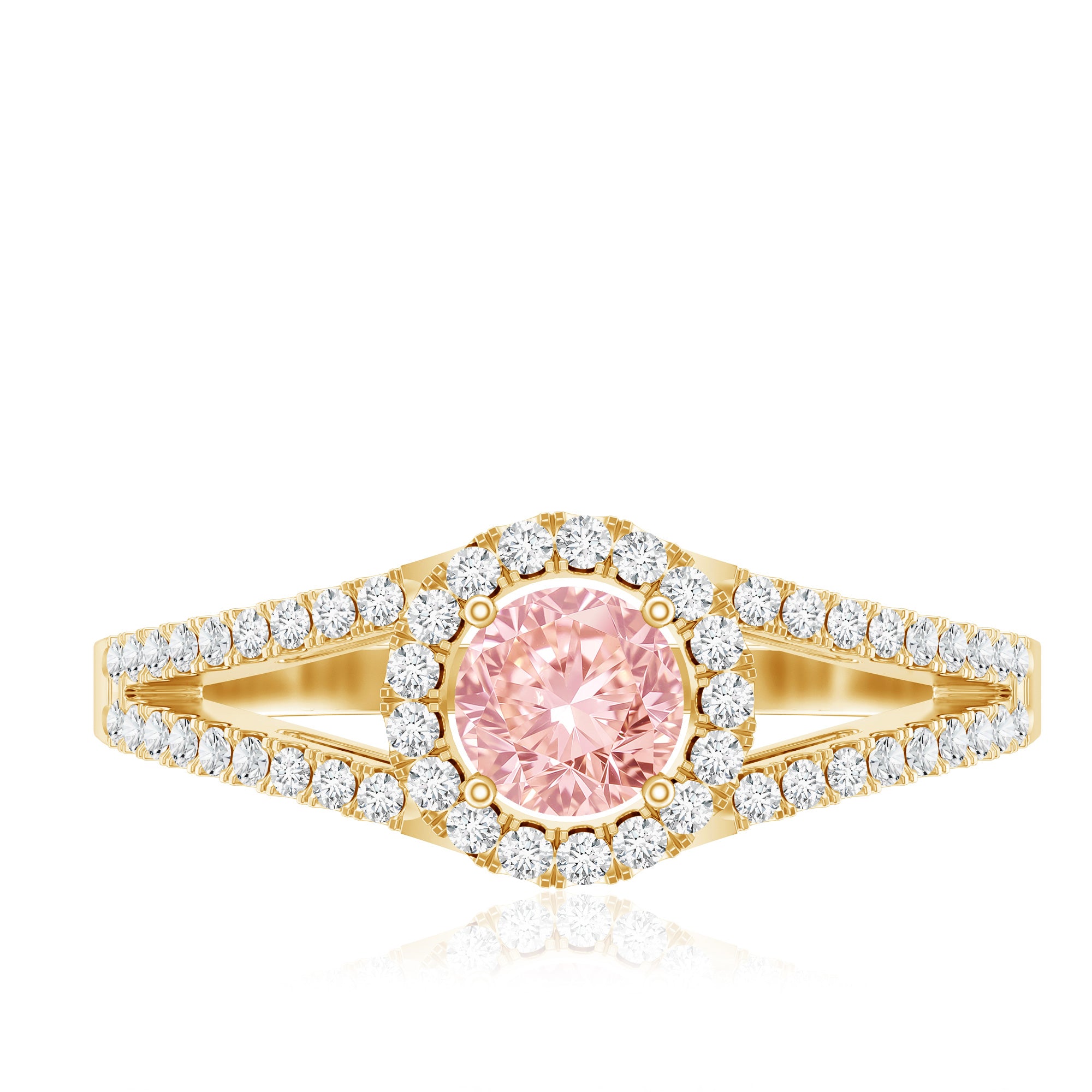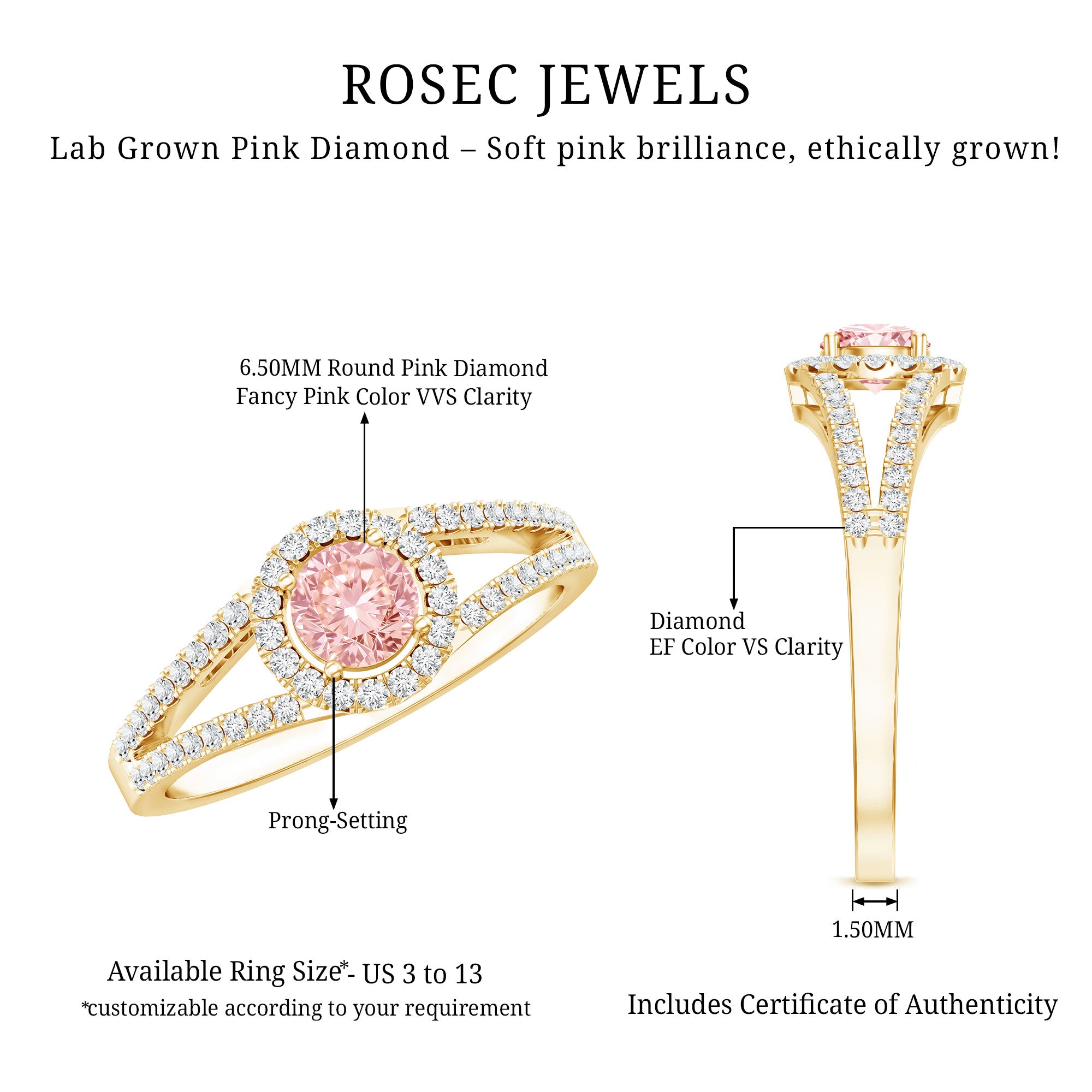 If you love jewelry that feels romantic and a little bit bold, this Lab Pink Diamond Engagement Ring is made for you. Designed with a modern split shank, this ring brings together elegance and everyday wearability in a beautiful way. Embedded with a 6.50MM round cut lab grown pink diamond, securely held in prong setting. A glowing halo of round lab grown diamonds surrounds the center stone, boosting its sparkle and giving the ring a bright look. The split shank band is lined with matching round cut lab grown diamonds, adding shimmer from every angle. This design not only looks stylish and modern, but also helps the Split Shank Engagement Ring sit comfortably on the finger. The balanced details make it easy to wear every day while still feeling special enough for big moments. Crafted with precision and care, this Pink and White Ring features lab grown pink diamonds and lab grown white diamonds, making it an ethical choice. The high quality stones are chosen for their shine, durability, and long lasting beauty. Perfect for proposals, anniversaries, or meaningful milestones, this Halo Engagement Ring comes in a jewelry box and includes a certificate of authenticity. It is a timeless piece made to celebrate love in a modern and thoughtful way.
