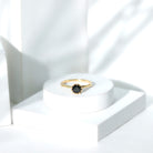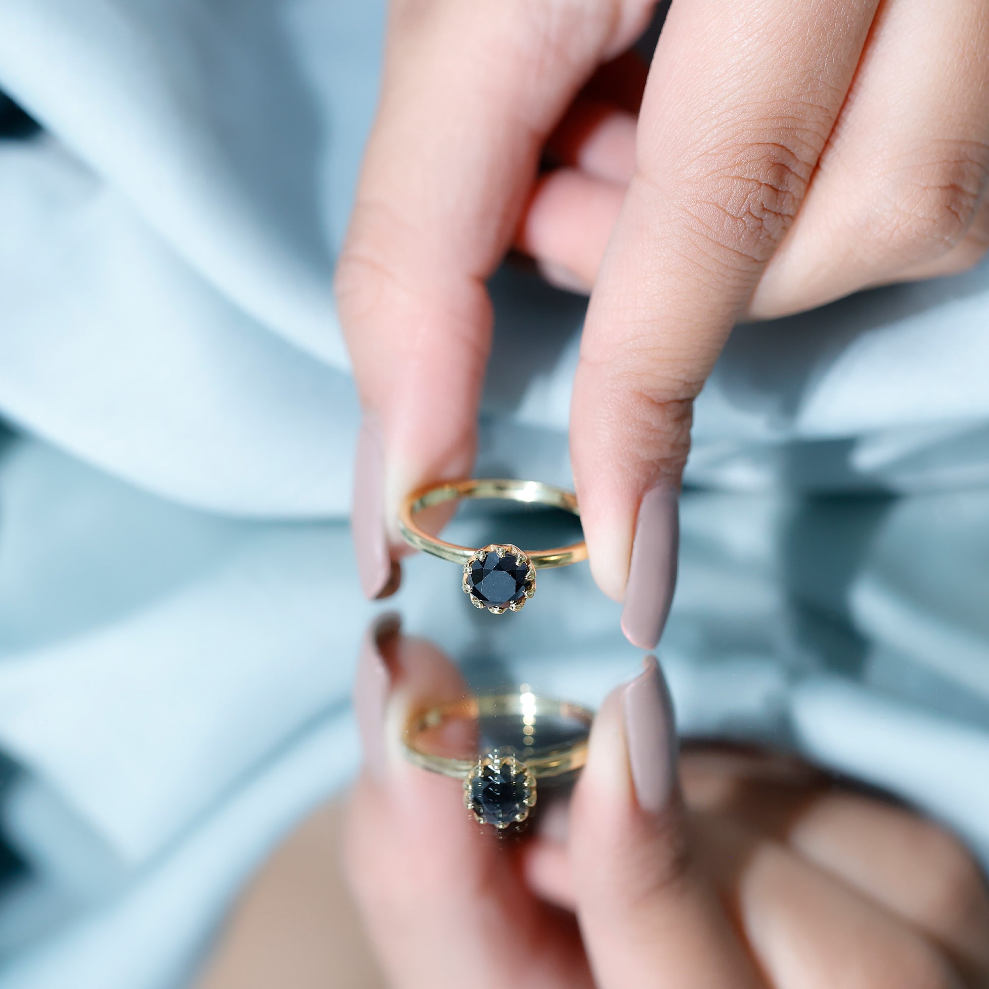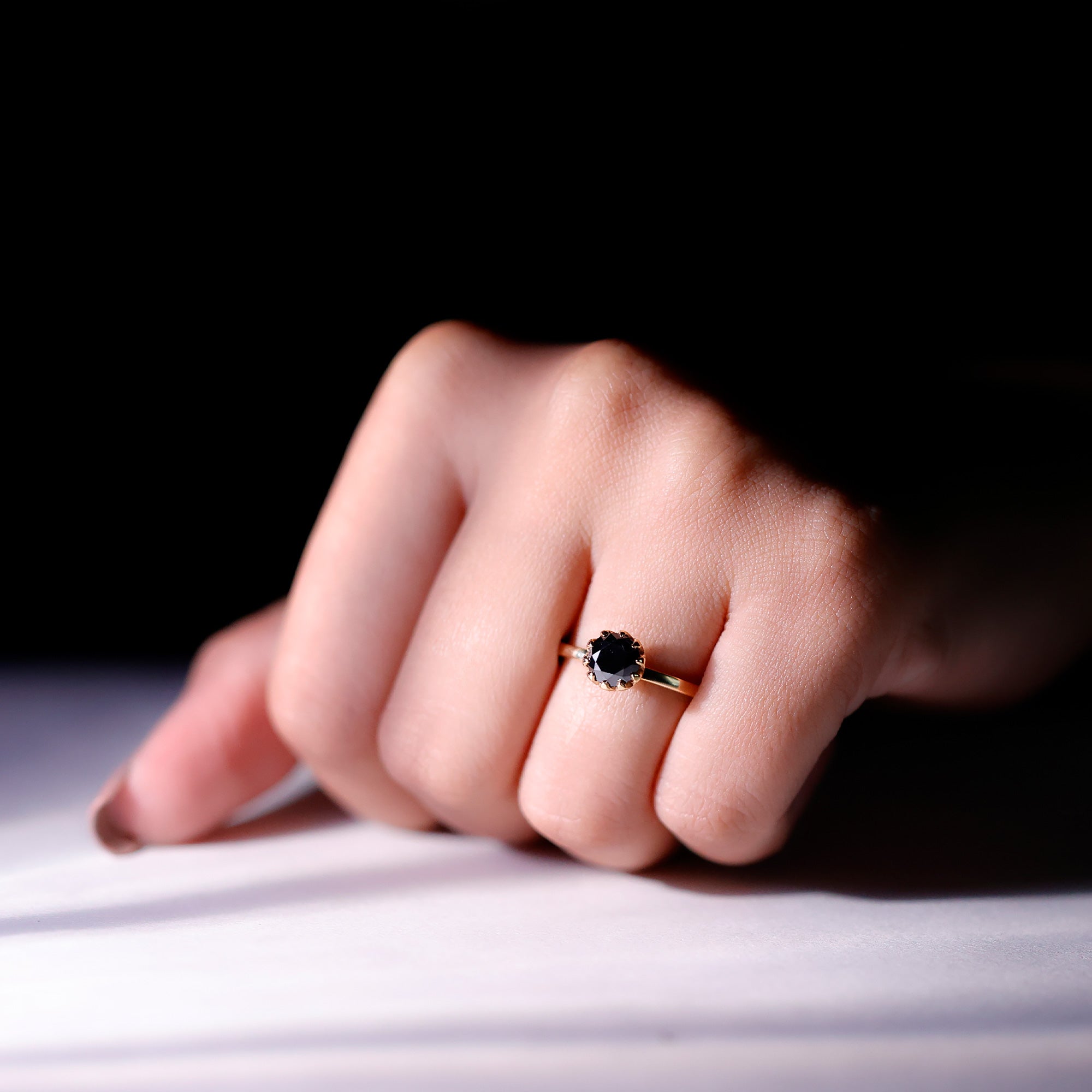 Make a statement with this chic Solitaire Ring featuring a round-cut black diamond in a lotus basket setting. The gold construction adds a touch of luxury to your style, making this Black Diamond Solitaire Ring a must-have accessory.