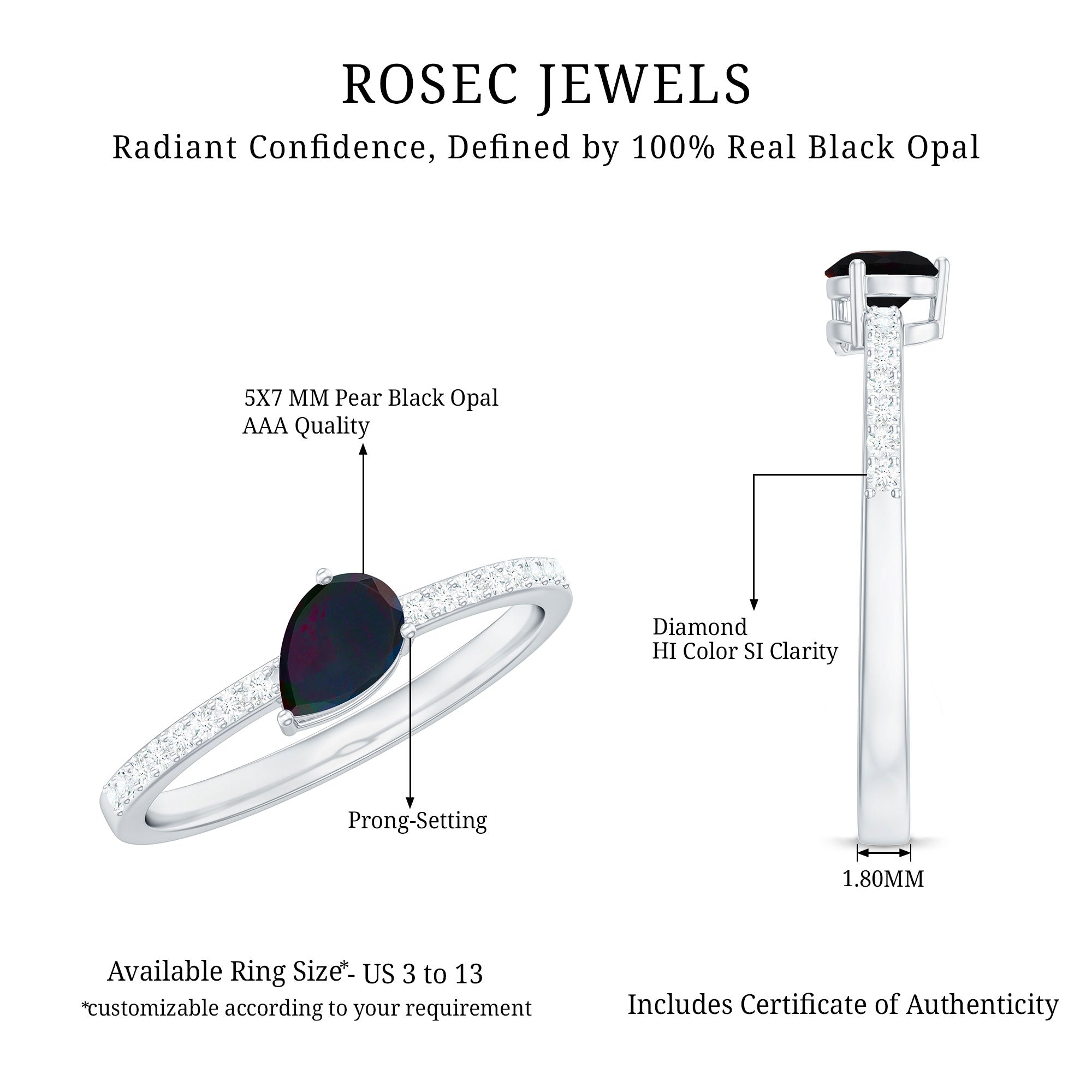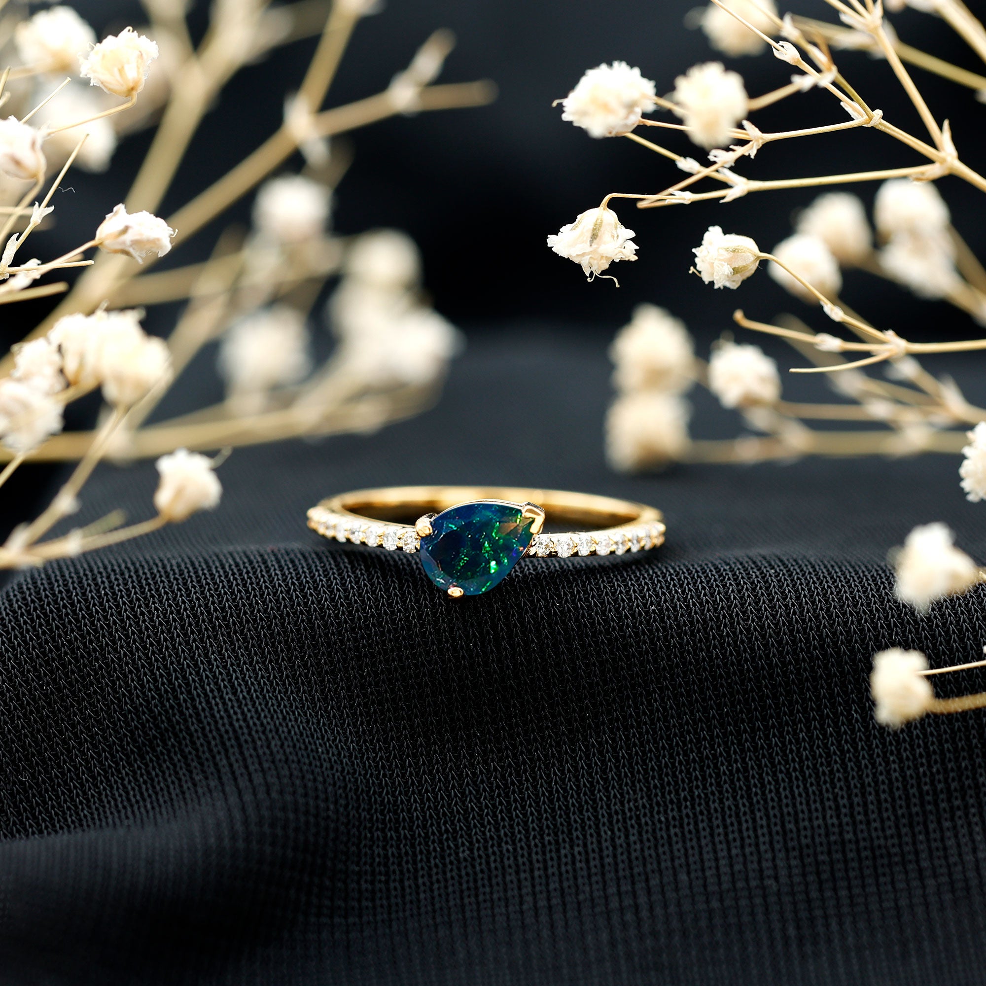 Make the perfect gesture of affection with this stunning Solitaire Ring for women. Express your love and devotion with this Ring, adorned with a 5X7 MM Pear Cut Black Opal in a 3-Prong-Setting and a Round Shape Diamond in Pave Setting. Let this exquisite piece of jewelry be your special and unexpected present to the ones you hold dear this season, and make it a moment they will never forget.