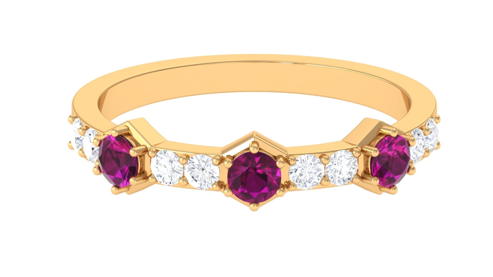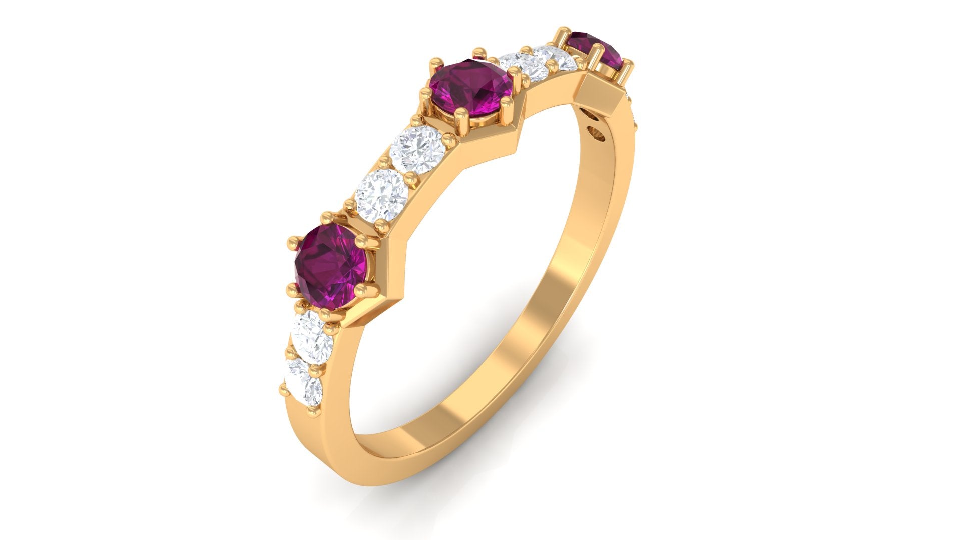 Chic simplicity meets timeless elegance in this 1 CT Rhodolite and Diamond Minimal Half Eternity Ring. With a centerpiece of 1 carat rhodolite, its vibrant hue steals the spotlight. The minimalistic design, adorned with Diamond along half of the band, adds just the right amount of sparkle. This ring is a delicate and sophisticated choice, perfect for those who appreciate understated luxury. The combination of the rich rhodolite and the subtle brilliance of Diamond makes it a versatile piece, suitable for both everyday wear and special occasions. A symbol of refined taste and enduring style, this ring is a graceful addition to any jewelry collection.