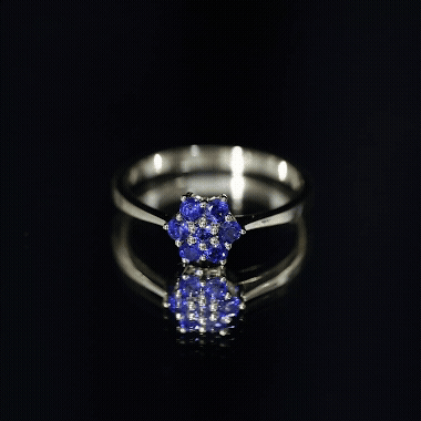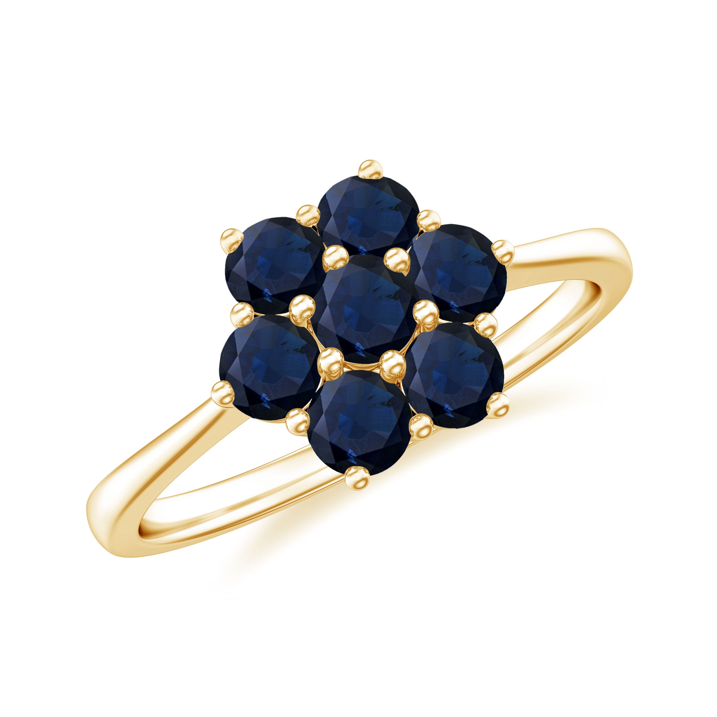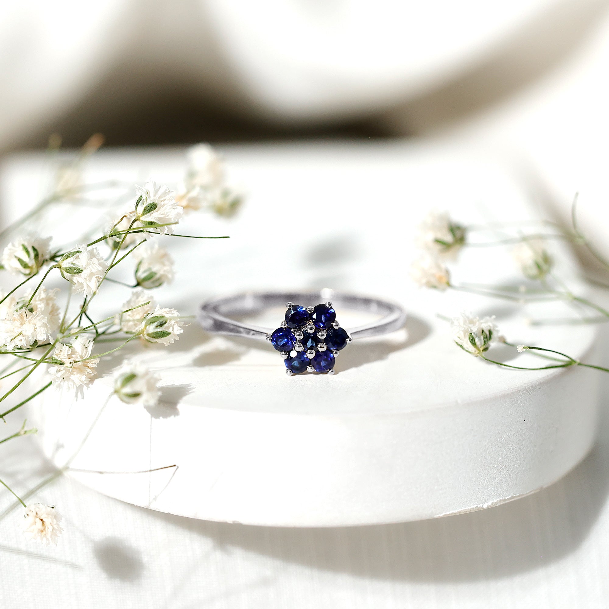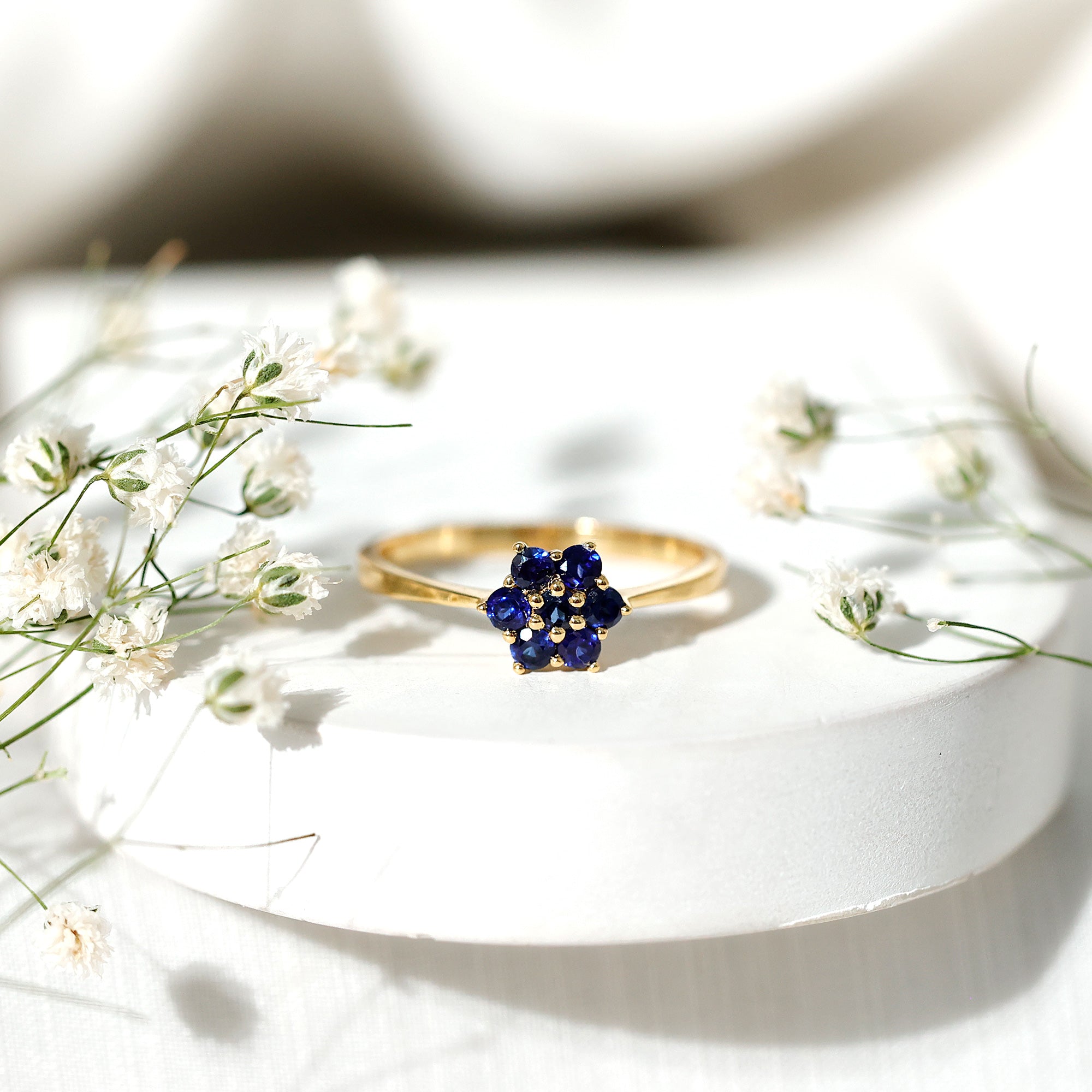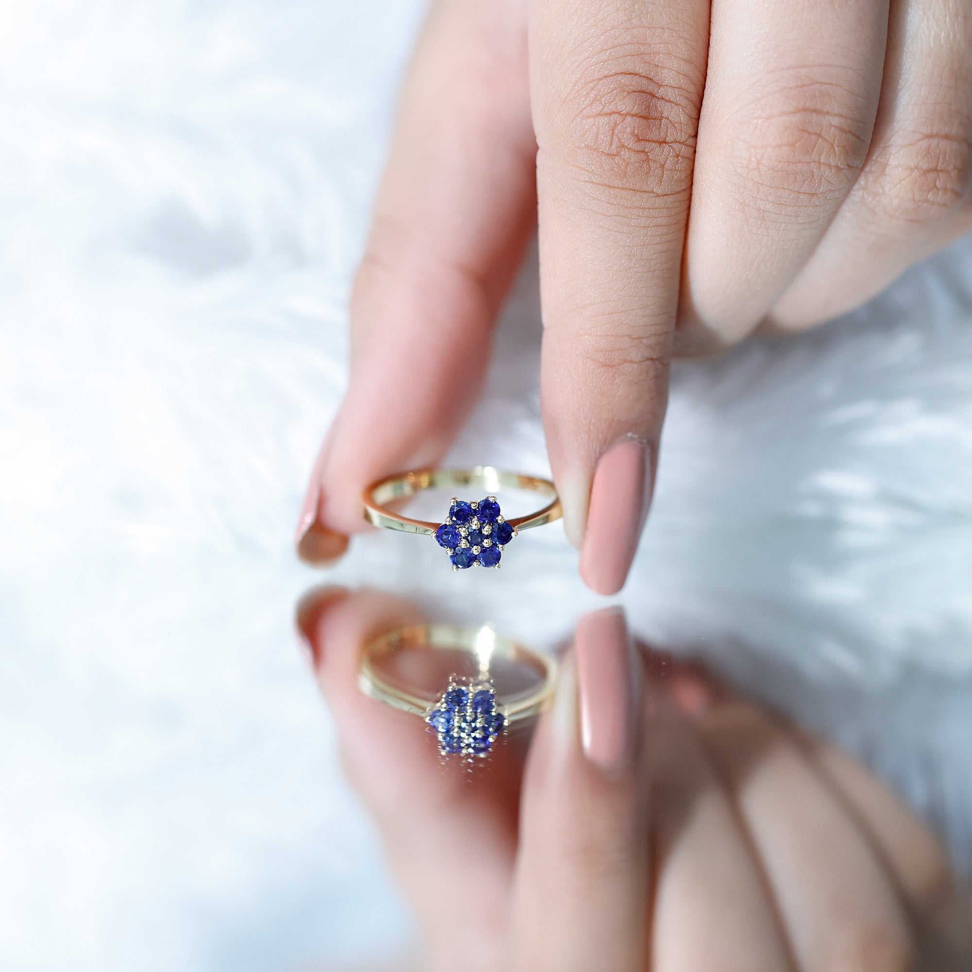 This simple yet classic flower ring features a cluster of round-shaped blue sapphire gemstones beautifully studded in a prong setting, enhancing the rings stunning floral design. Crafted from high-quality solid gold, this ring is a timeless piece that exudes elegance and beauty. Whether worn on its own or paired with other jewelry, this ring is the perfect accessory to complement any outfit and occasion. Its unique and eye-catching design makes it a standout piece that is sure to garner compliments and admiration.
