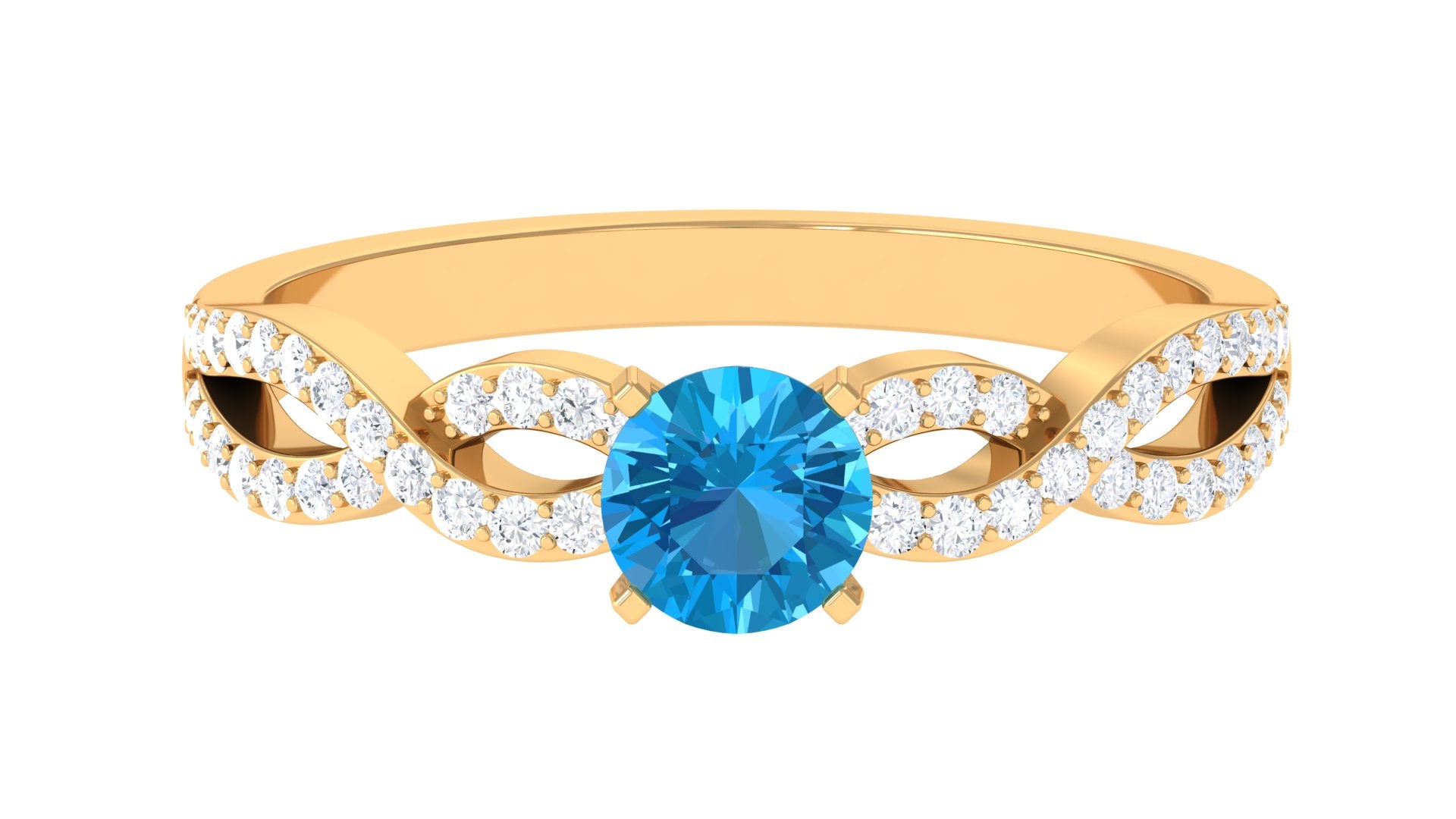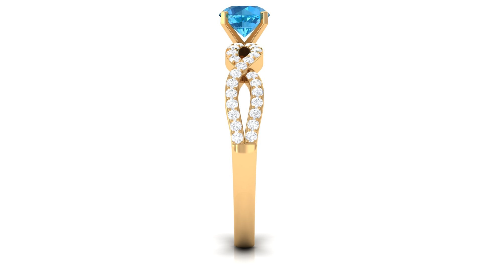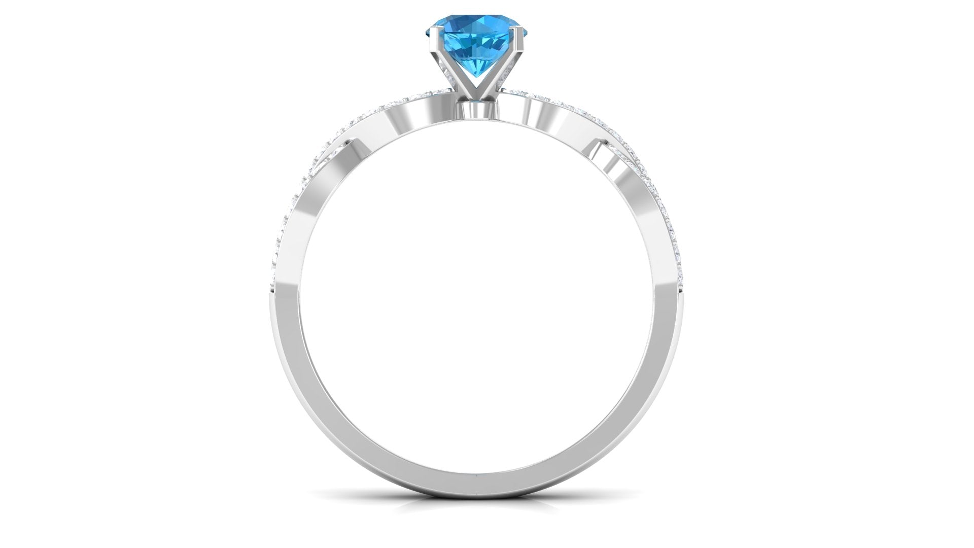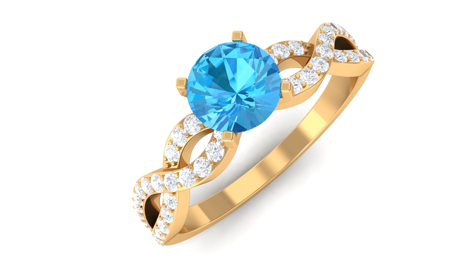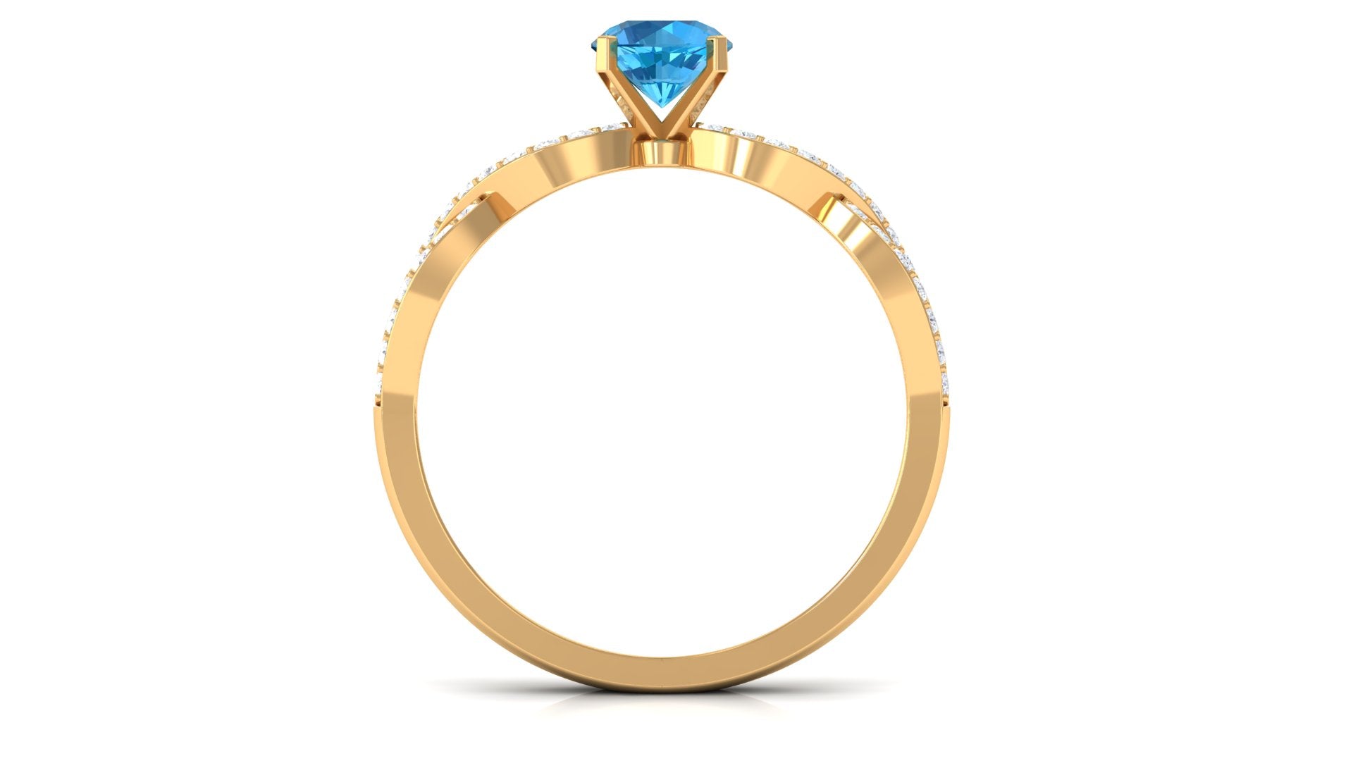 Express your love with this lovely Infinity Criss Cross Ring with Round Shape Swiss Blue Topaz set as a solitaire adorn this Solid Gold with Diamond Side Stones in Criss Cross Shank to make for a charming present for your beloved on Valentines day.